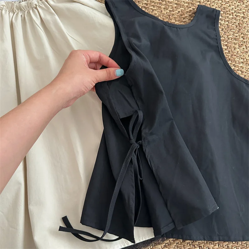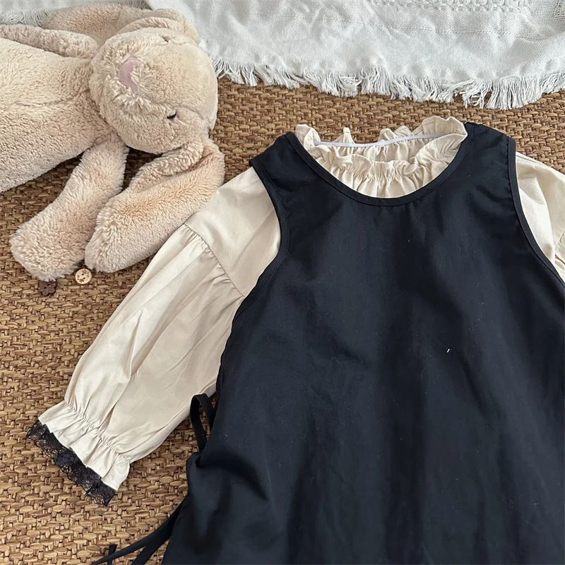 キッズセットアップ 2点セット 長袖フリルスタンドカラーワンピース+ノースリーブサイドリボンエプロンドレス【mh0006723】