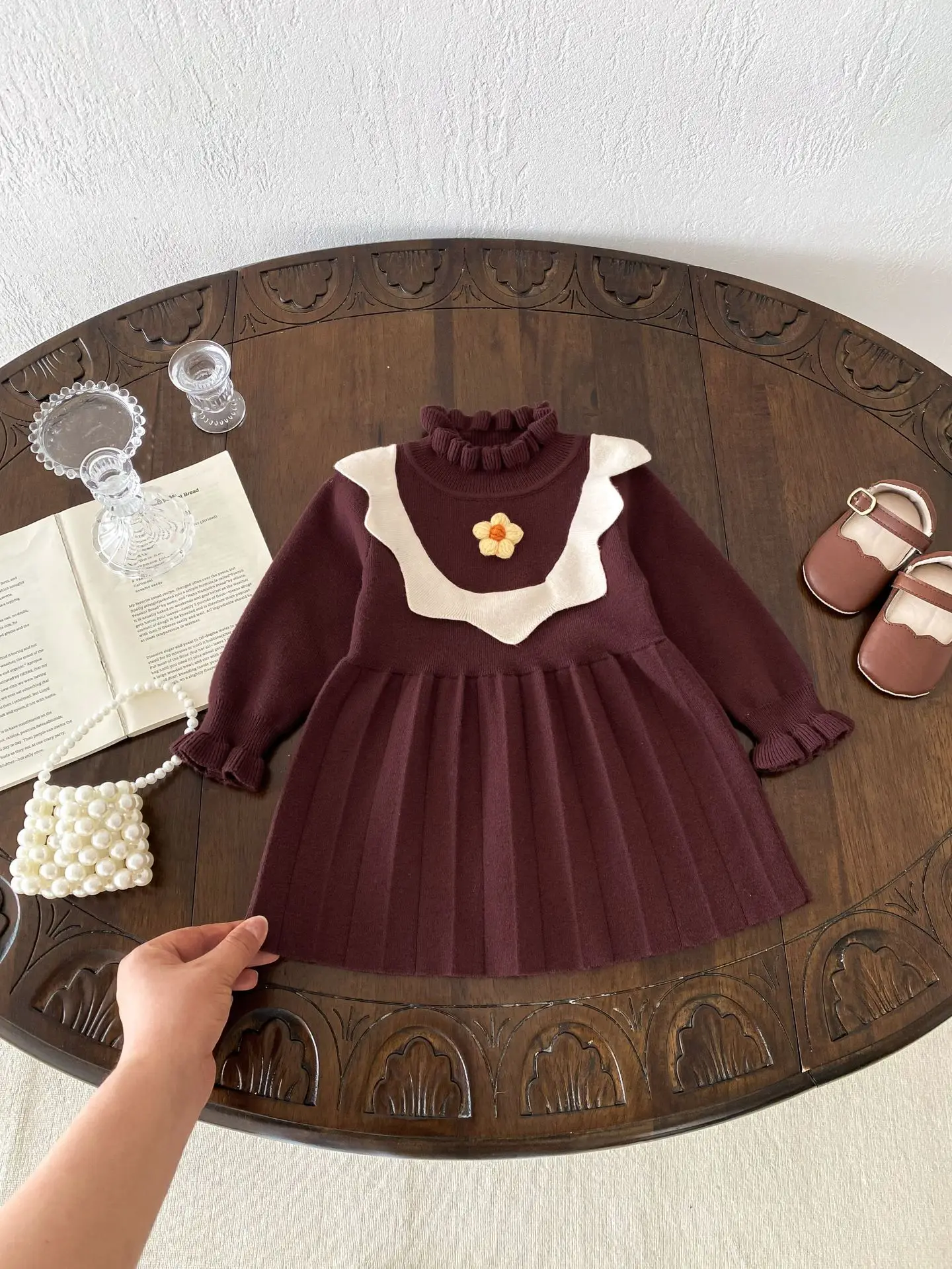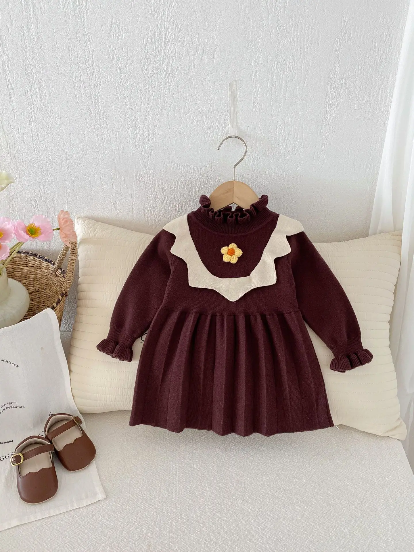 ベビーキッズワンピース ニットフラワー長袖ワンピース 2カラー【mh0007327】