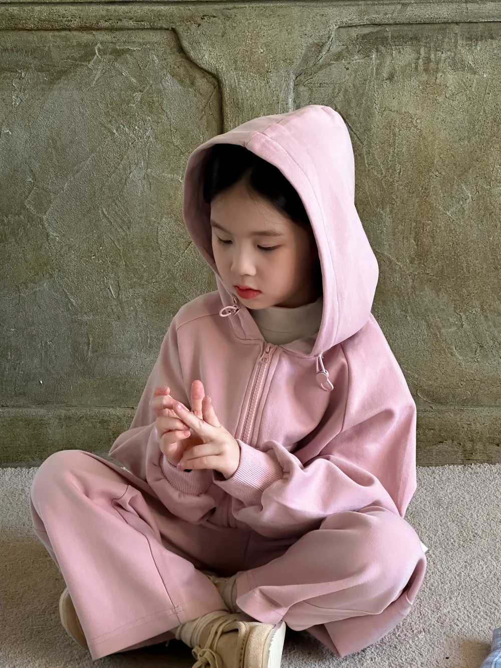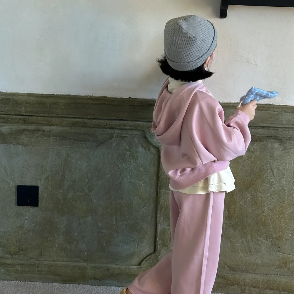 キッズセットアップ 2点セット ペプラムフリルドッキングフーディジッパー長袖スウェットパーカー+スウェットロングパンツ ピンク【mh0007344】