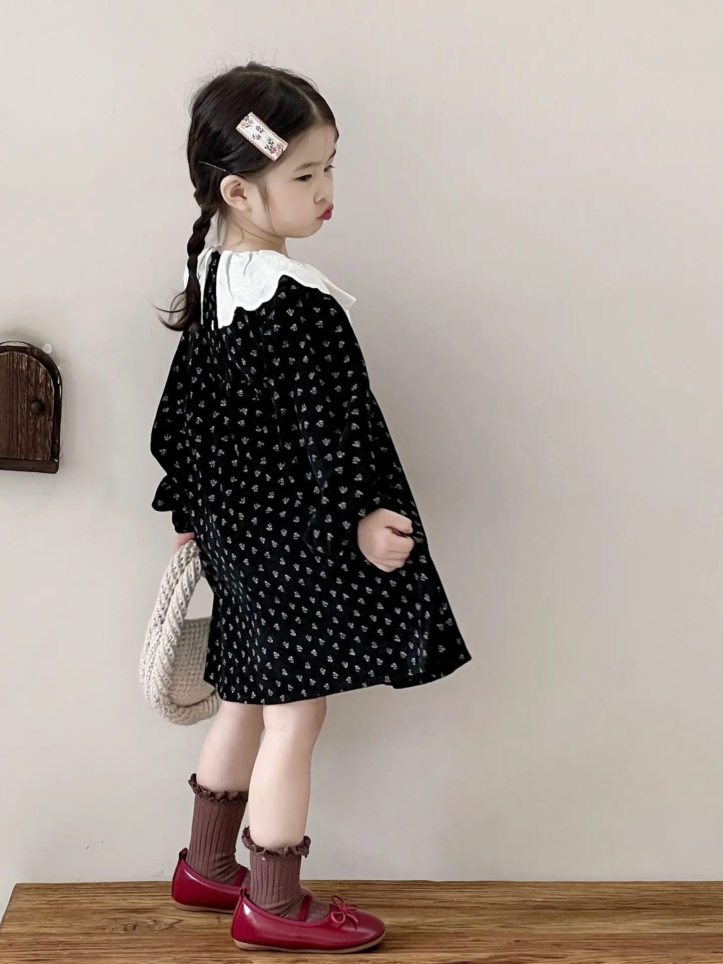 キッズワンピース ラッフル襟フラワープリントレトロ長袖ワンピース【mh0007465】