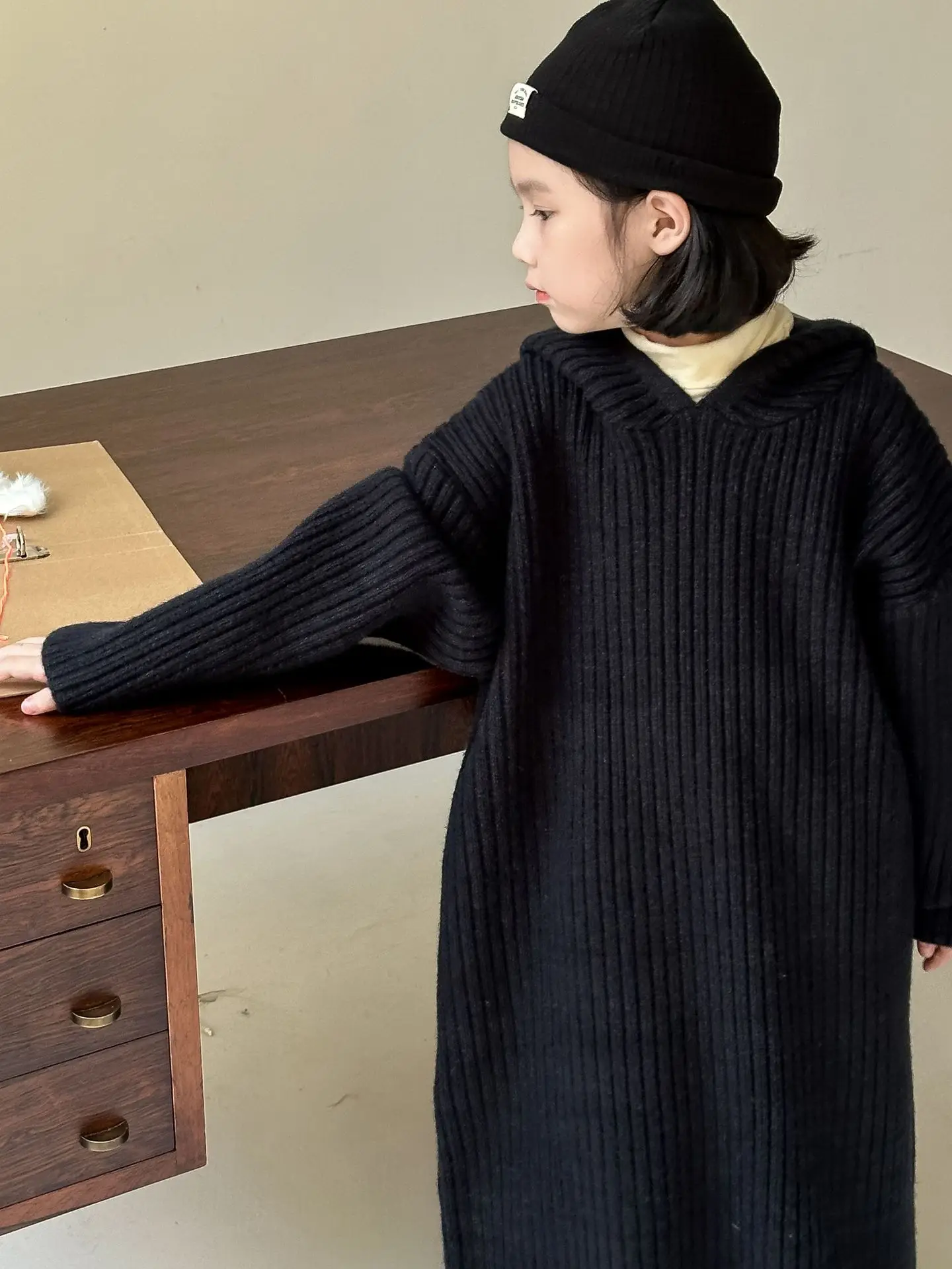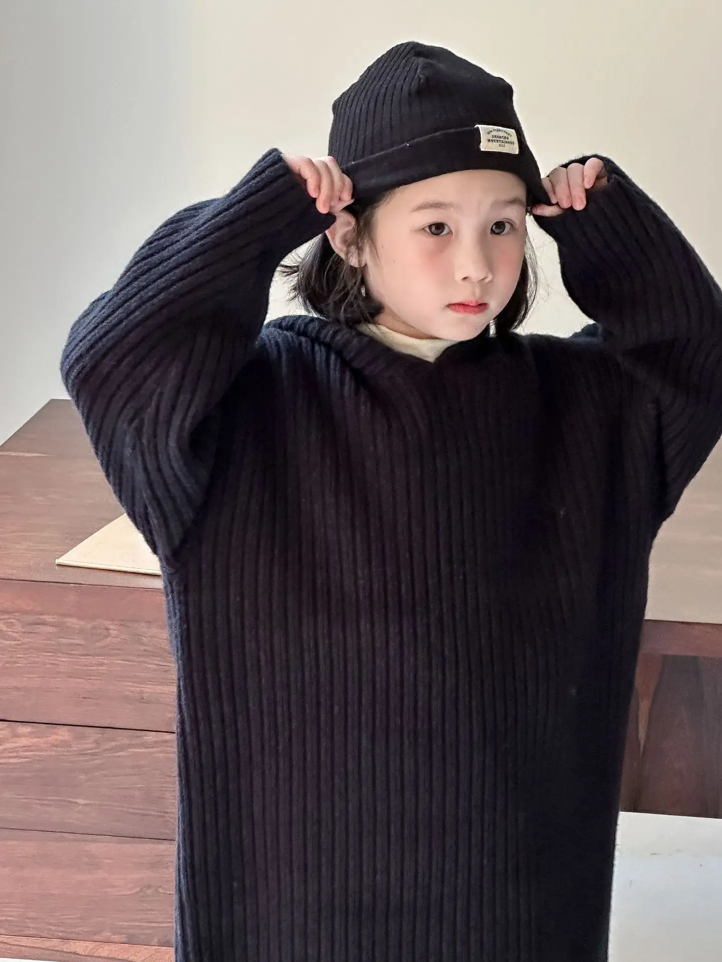 キッズワンピース リブニットフーディルーズロング長袖セーターワンピース 3カラー【mh0007572】