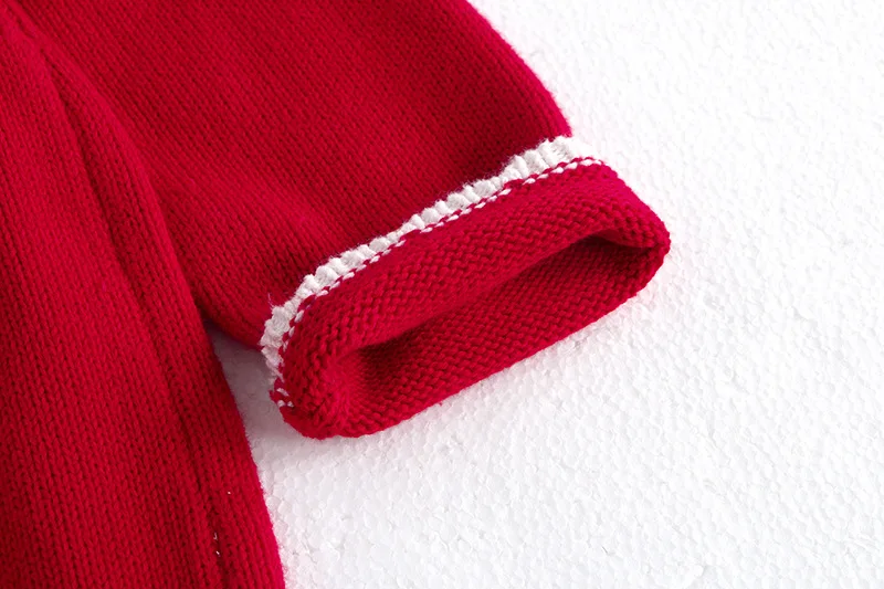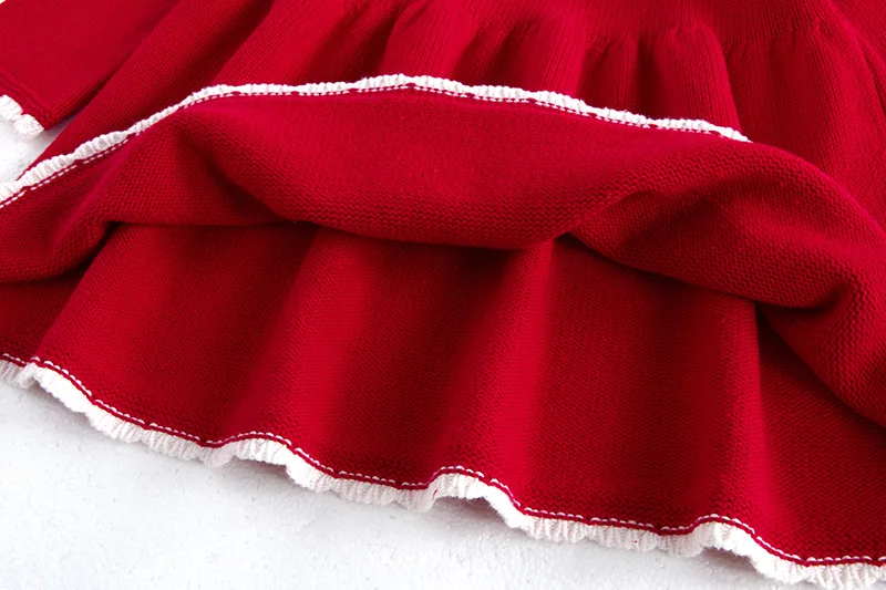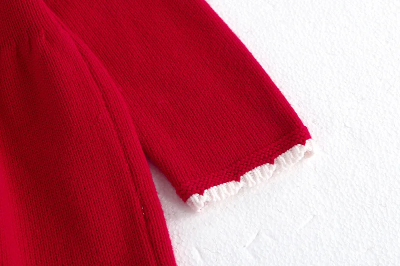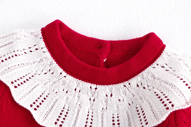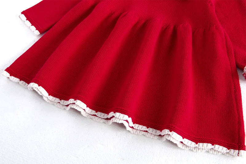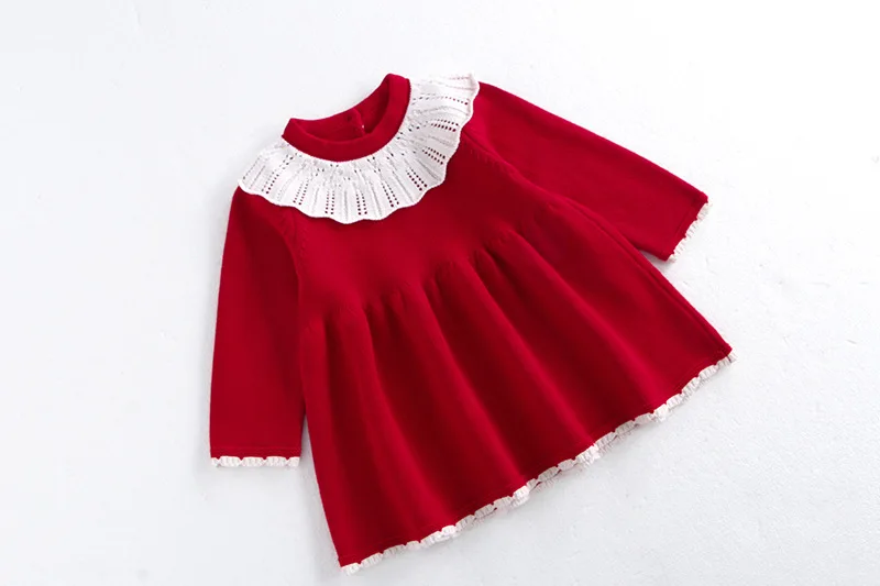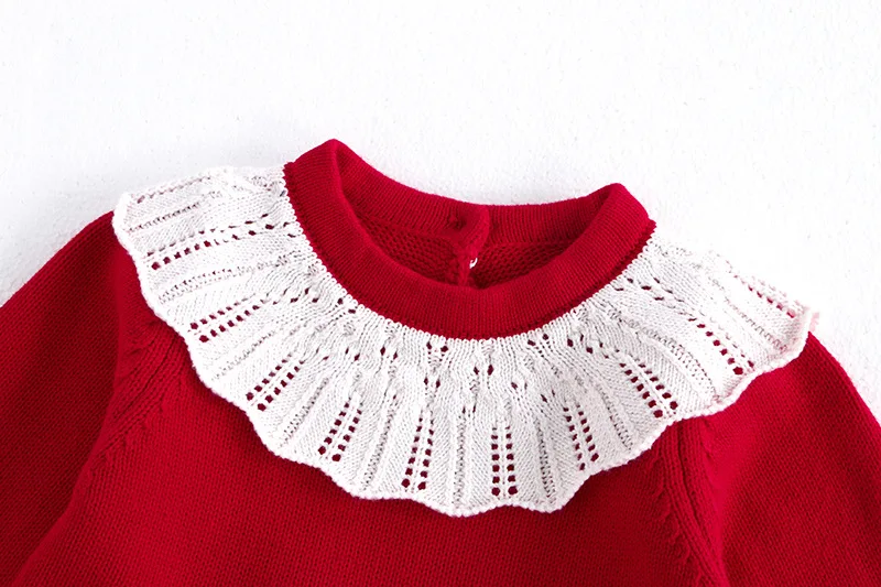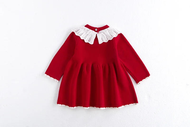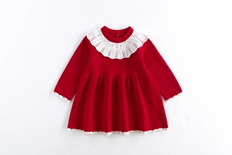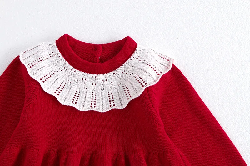 ベビーキッズワンピース レース襟ニット長袖ワンピース レッド【mh0007687】