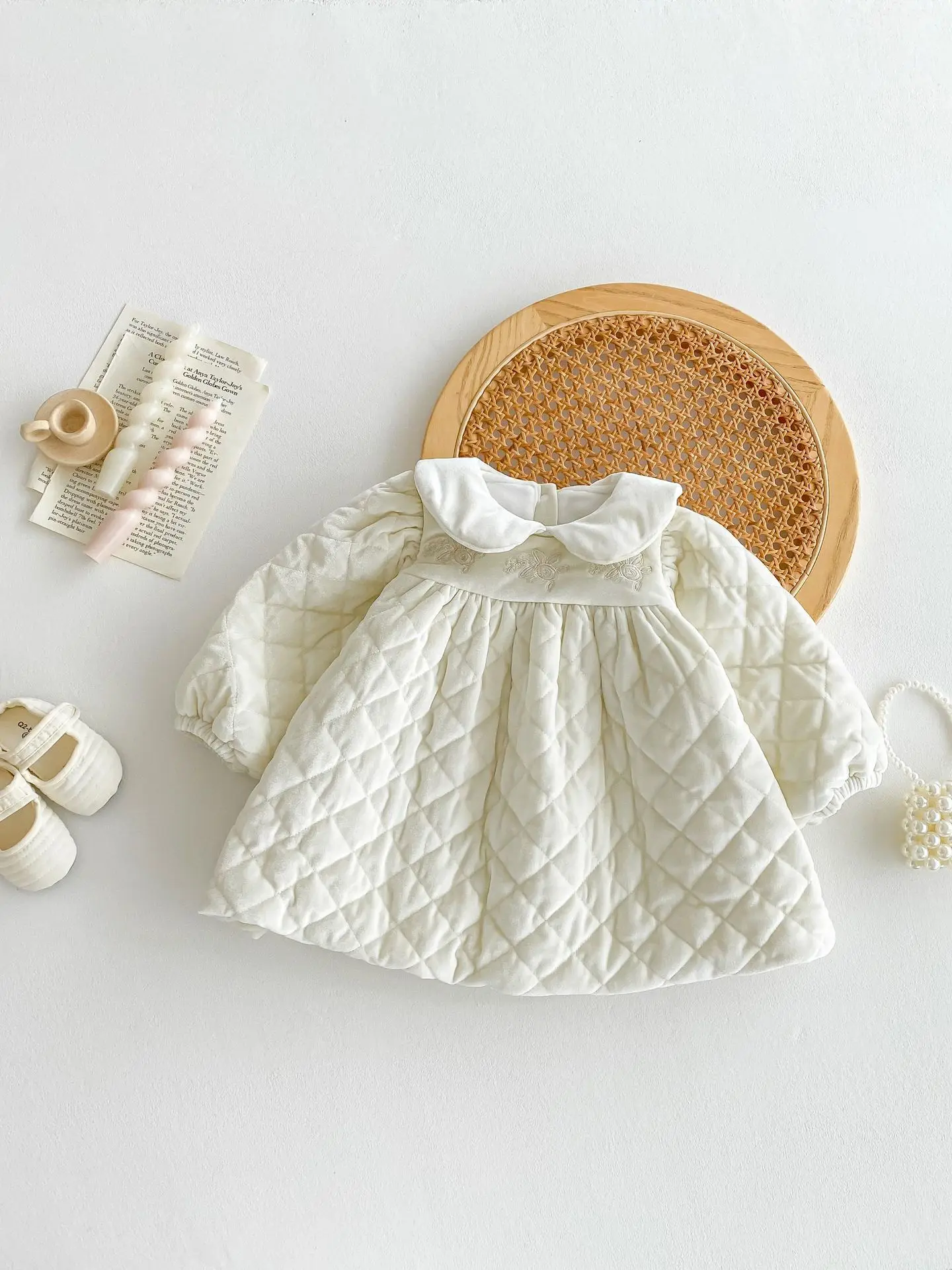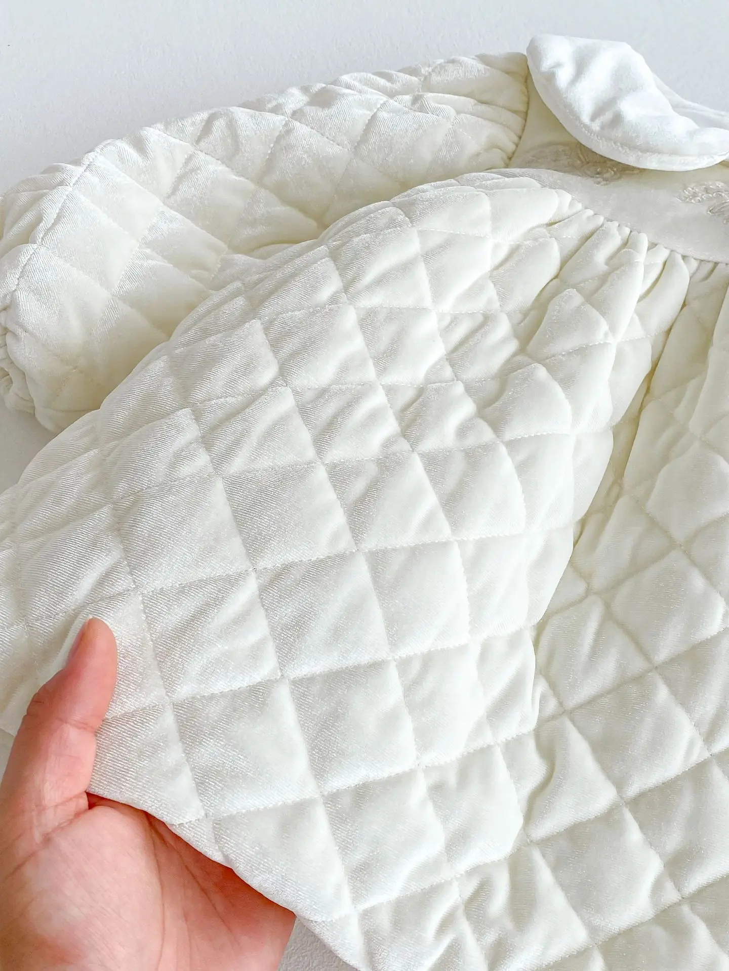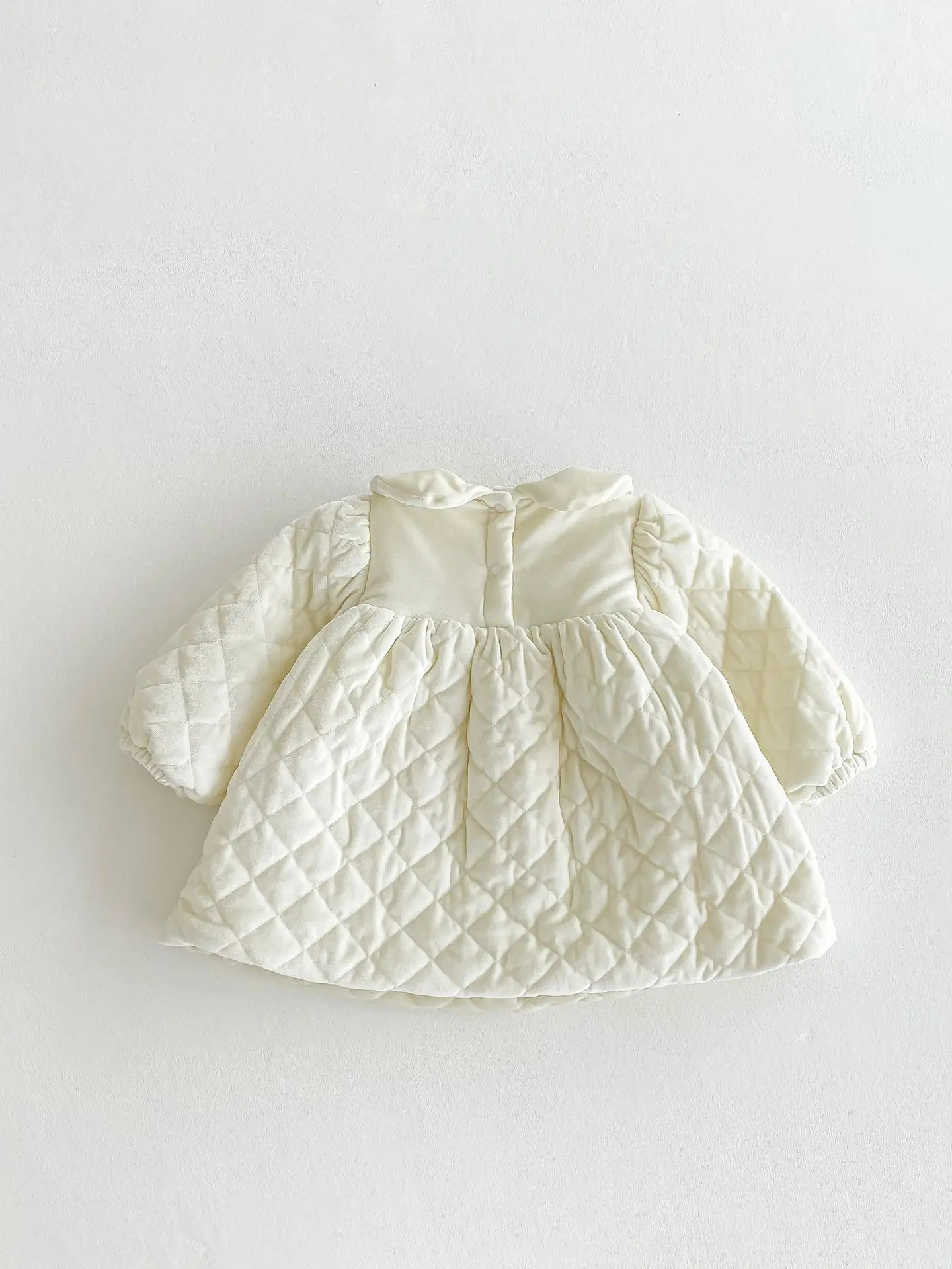 キルティング加工と裏フリースが施された厚手の長袖ワンピースは、寒い季節にぴったりのベビーキッズアイテムです。丸襟のピーターパンカラーが上品で可愛らしい印象を与え、刺繍のディテールが繊細なアクセントとなっています。内側のフリース素材が優れた保温性を提供し、寒い日でも快適に過ごせます。特別な日やお出かけに最適なデザインでありながら、動きやすく日常使いにも便利な一着です。