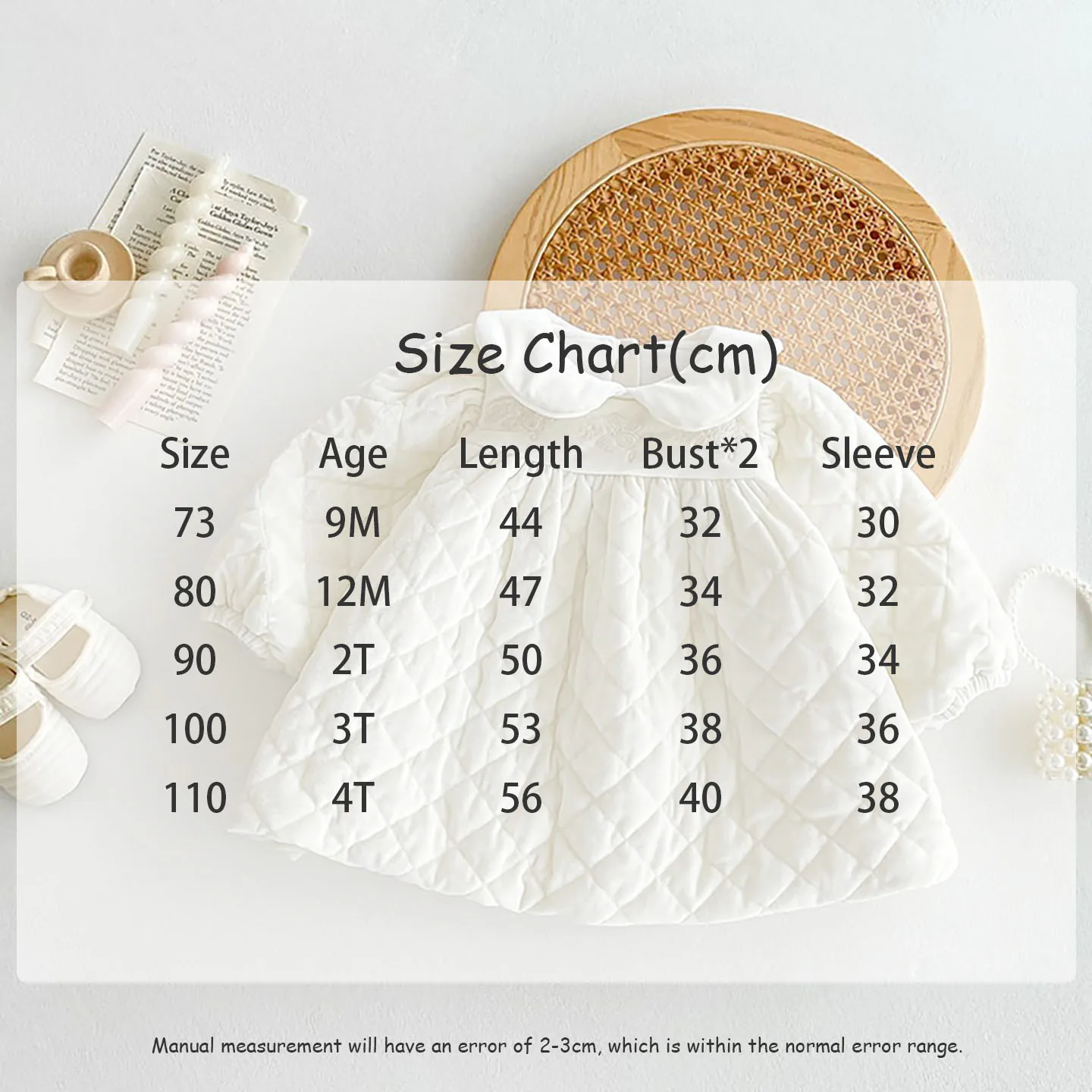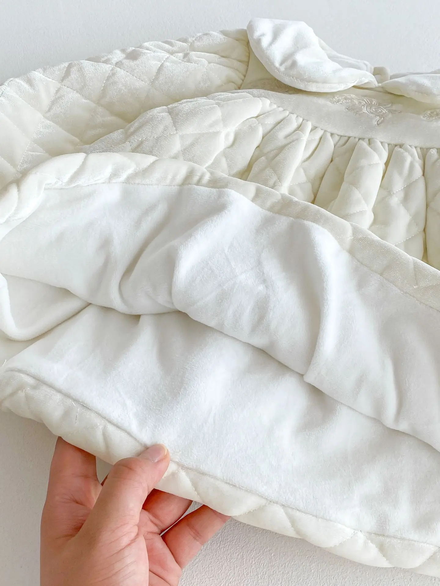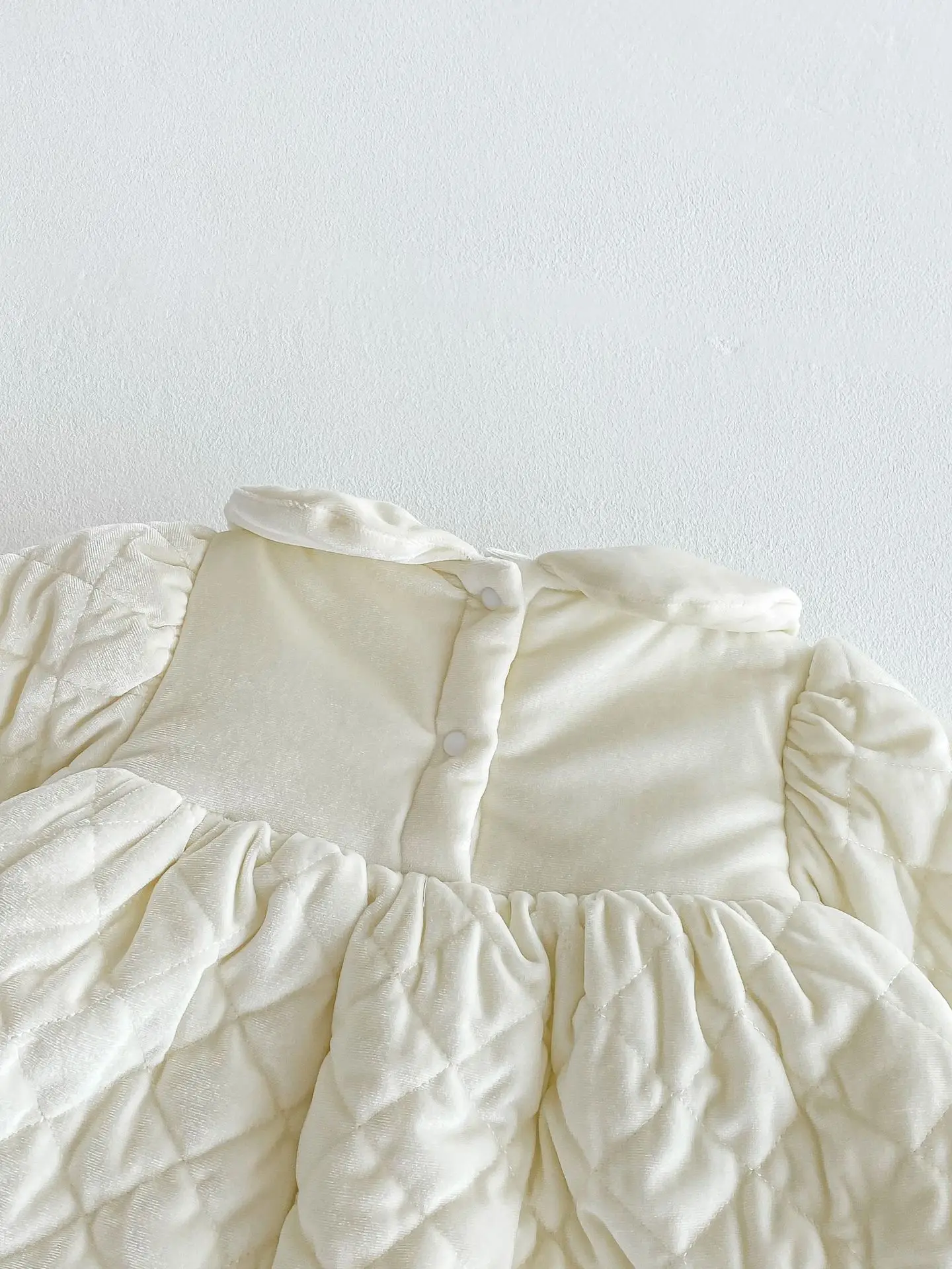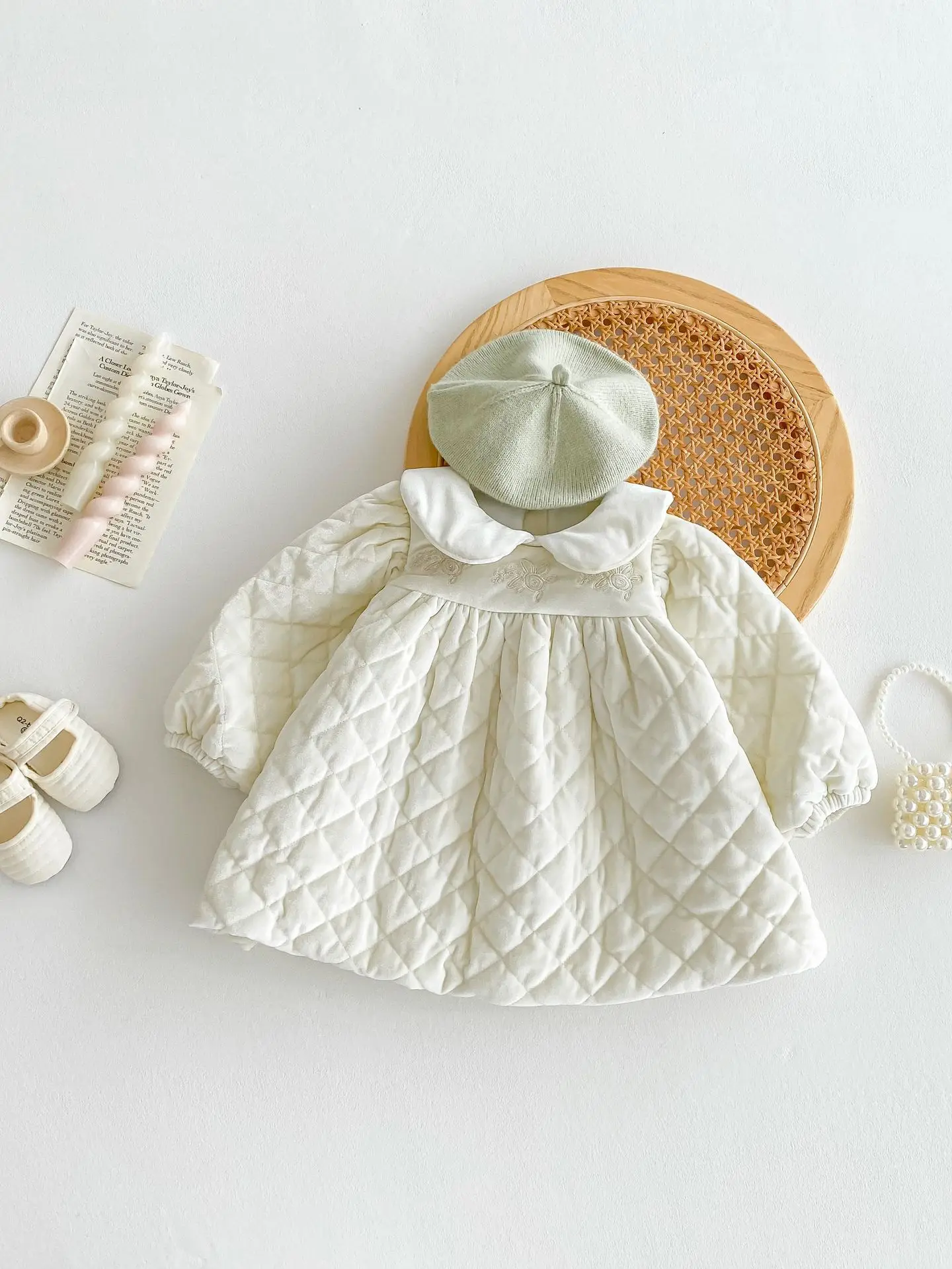 キルティング加工と裏フリースが施された厚手の長袖ワンピースは、寒い季節にぴったりのベビーキッズアイテムです。丸襟のピーターパンカラーが上品で可愛らしい印象を与え、刺繍のディテールが繊細なアクセントとなっています。内側のフリース素材が優れた保温性を提供し、寒い日でも快適に過ごせます。特別な日やお出かけに最適なデザインでありながら、動きやすく日常使いにも便利な一着です。