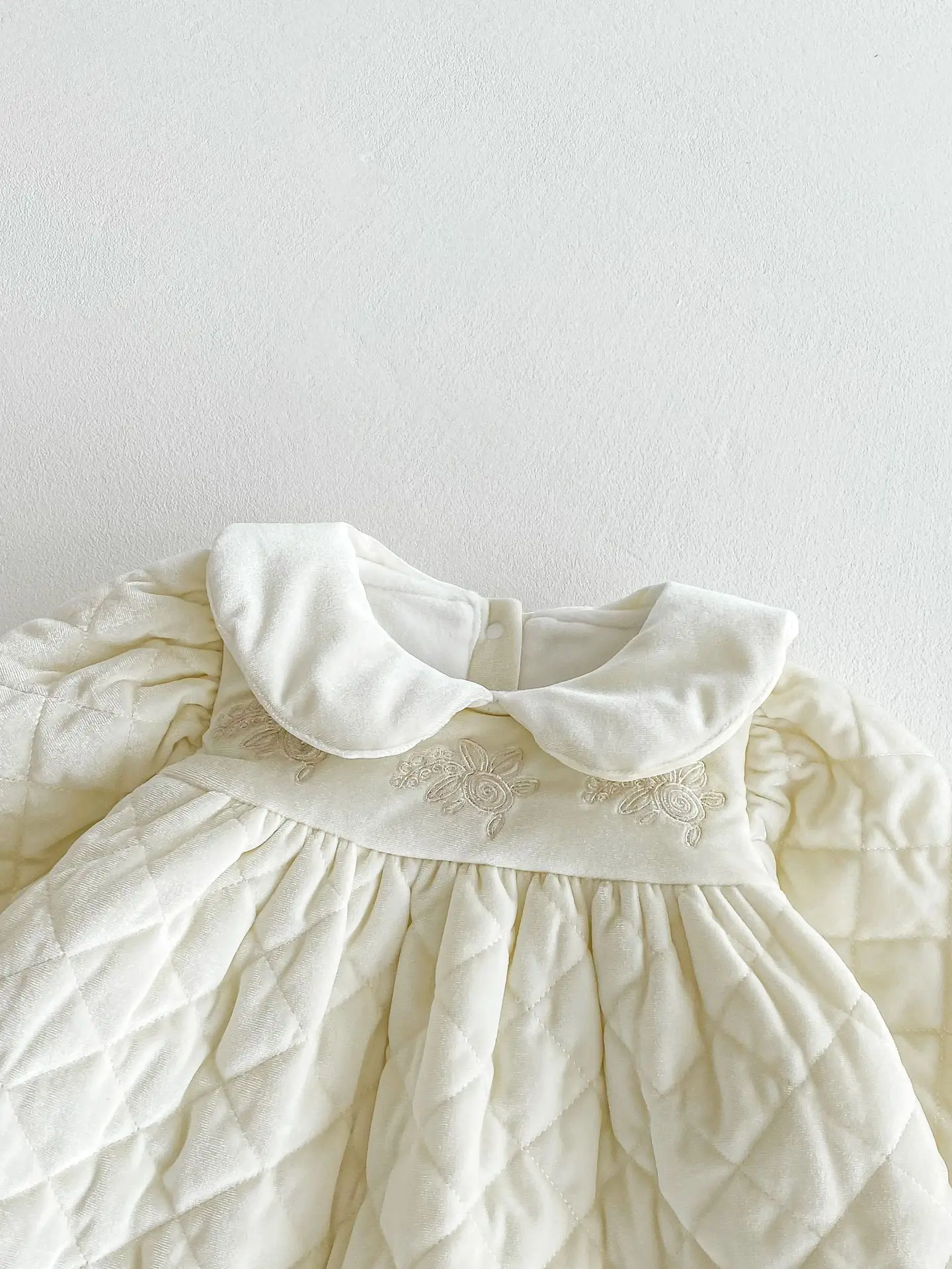 #キッズファッション #ベビー服 #ピーターパンカラー #キルティングワンピース #裏フリース #冬用ワンピース #刺繍ワンピース