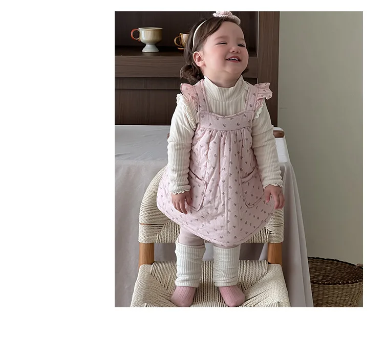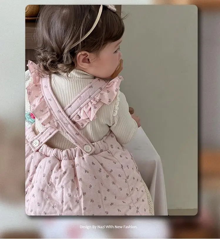 フラワー小花柄プリントとショルダーフリルが可愛らしいキルティングノースリーブワンピースは、寒い季節にもぴったりの暖かさを提供します。厚手のパッド入り生地で、保温性に優れ、お子さまをしっかりと守ります。可愛らしいフラワープリントとフリルデザインが、ガーリーで華やかな印象を与え、特別な日のコーディネートにも最適です。ノースリーブスタイルで、重ね着としても活躍する一着です。