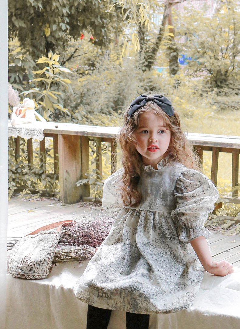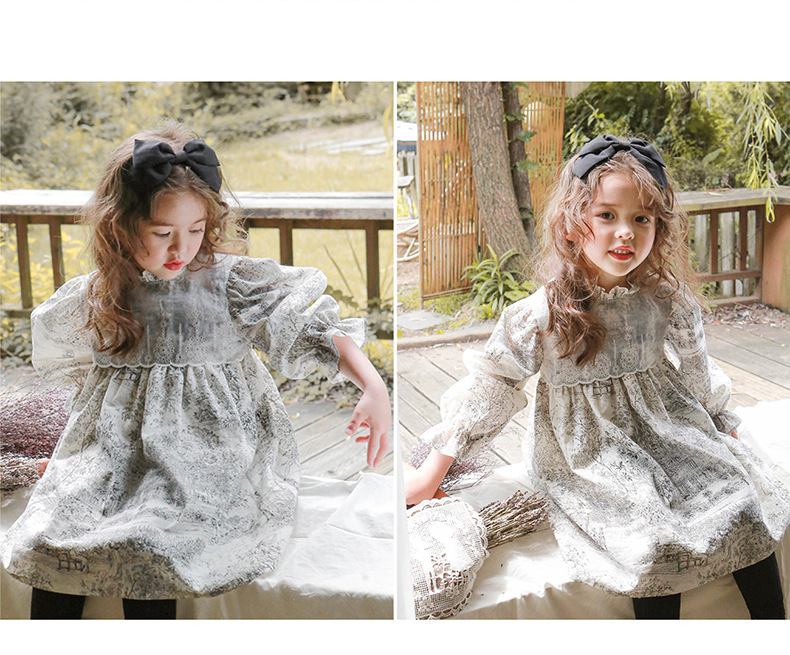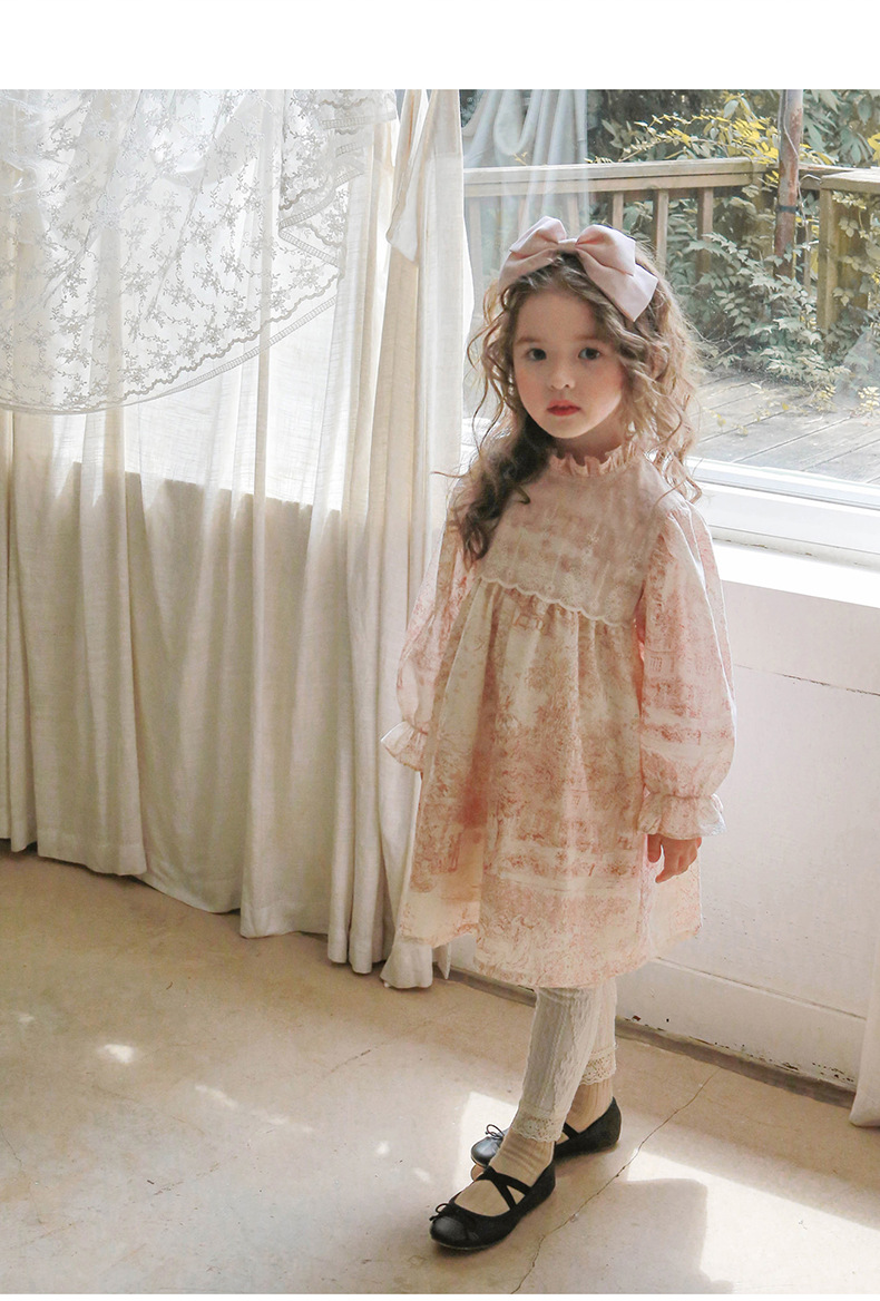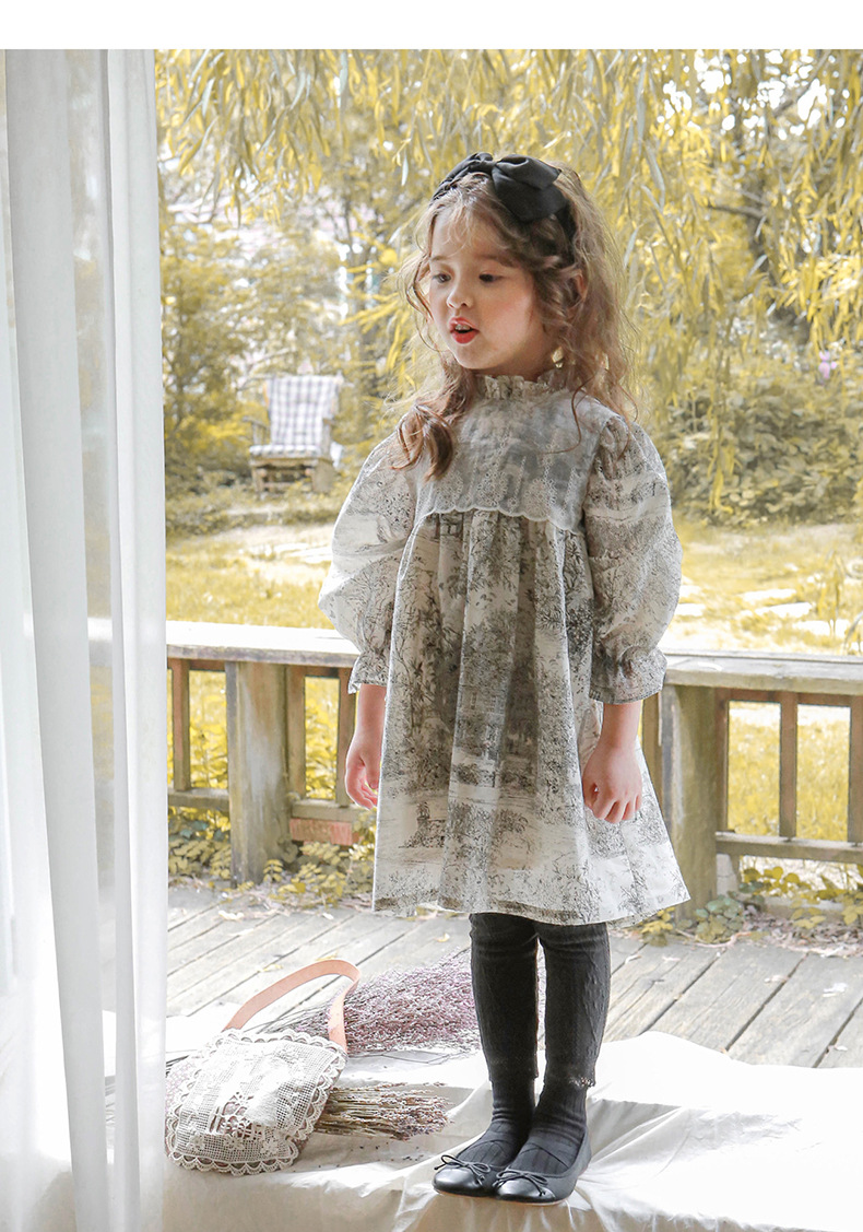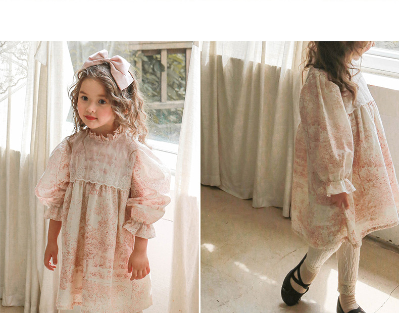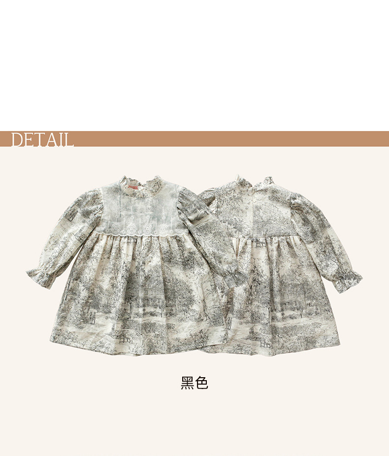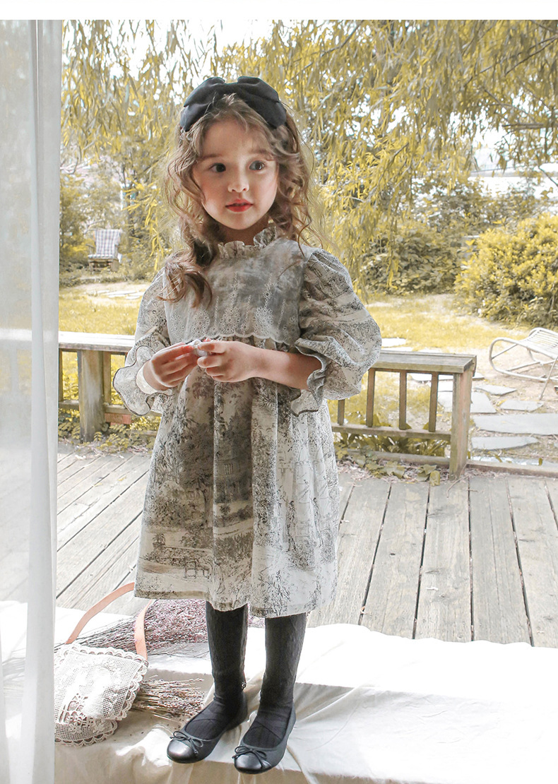 キッズワンピース 風景画プリントチュールレースドッキング長袖パフスリーブワンピース【mh0009080】