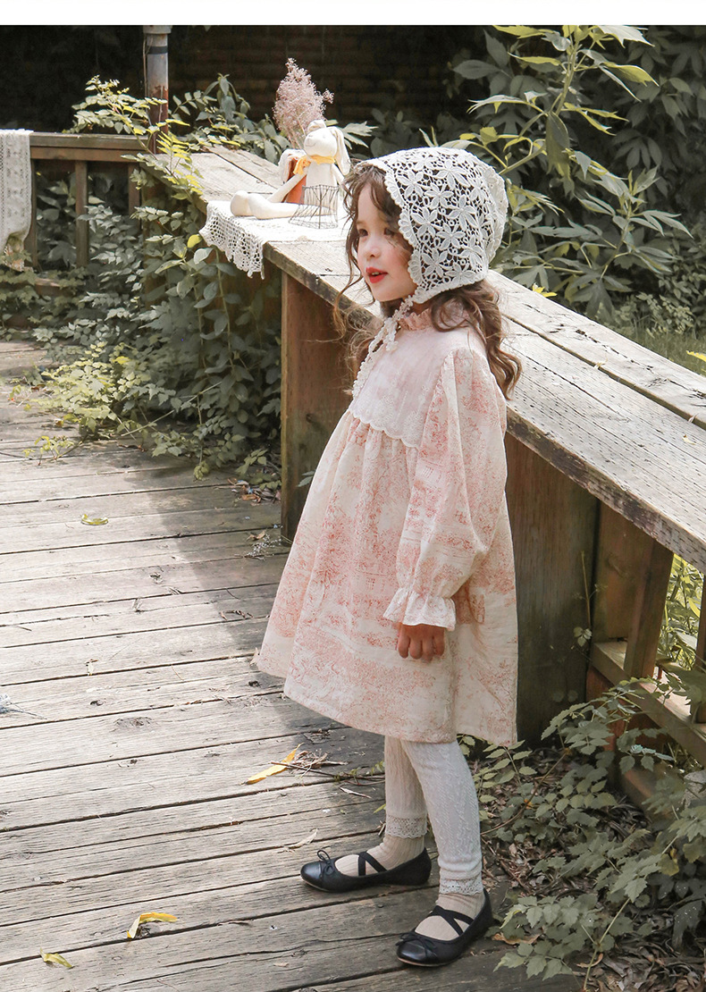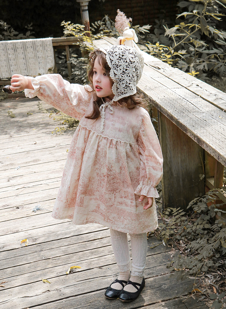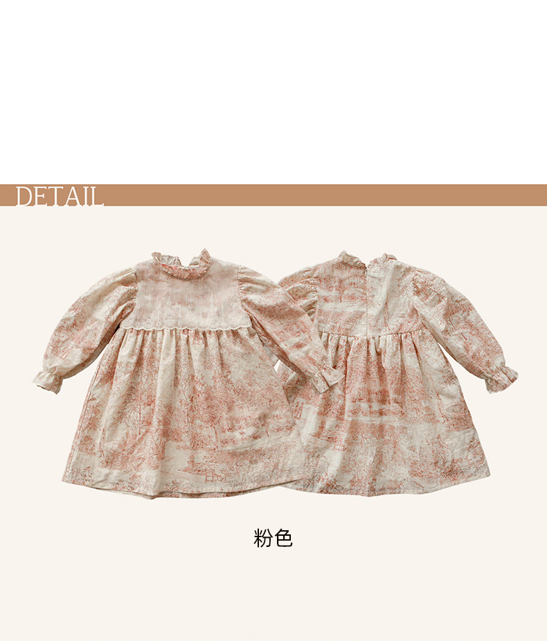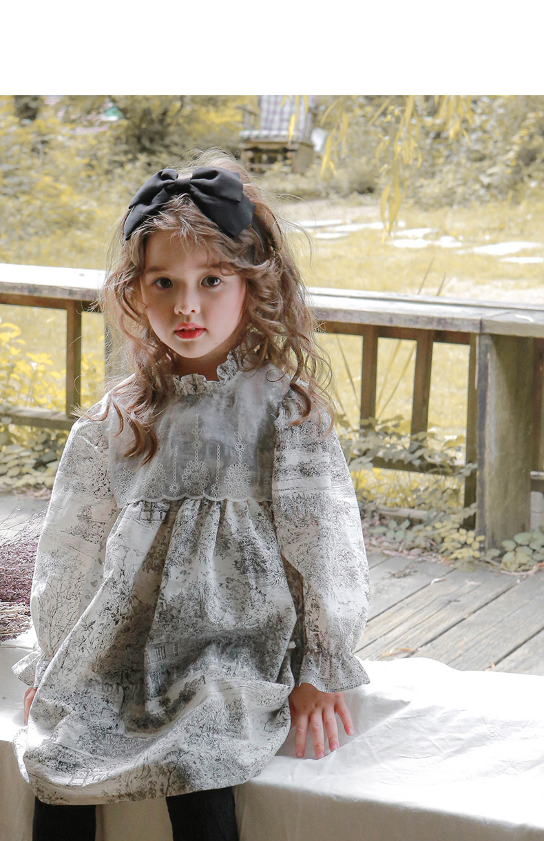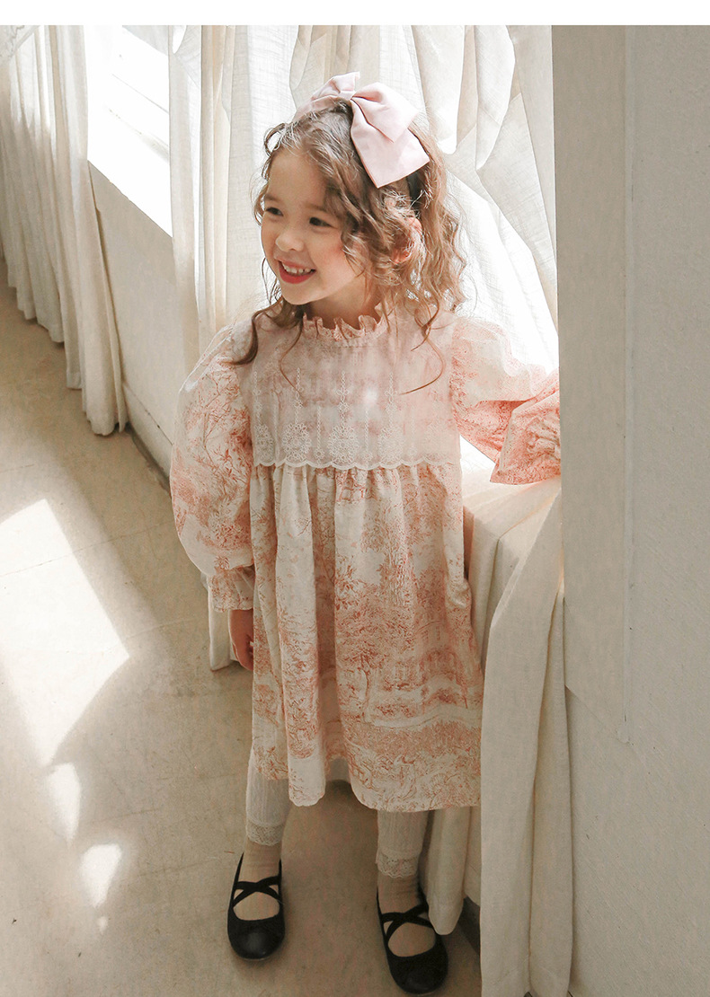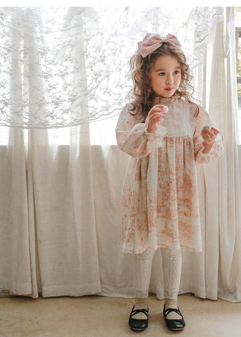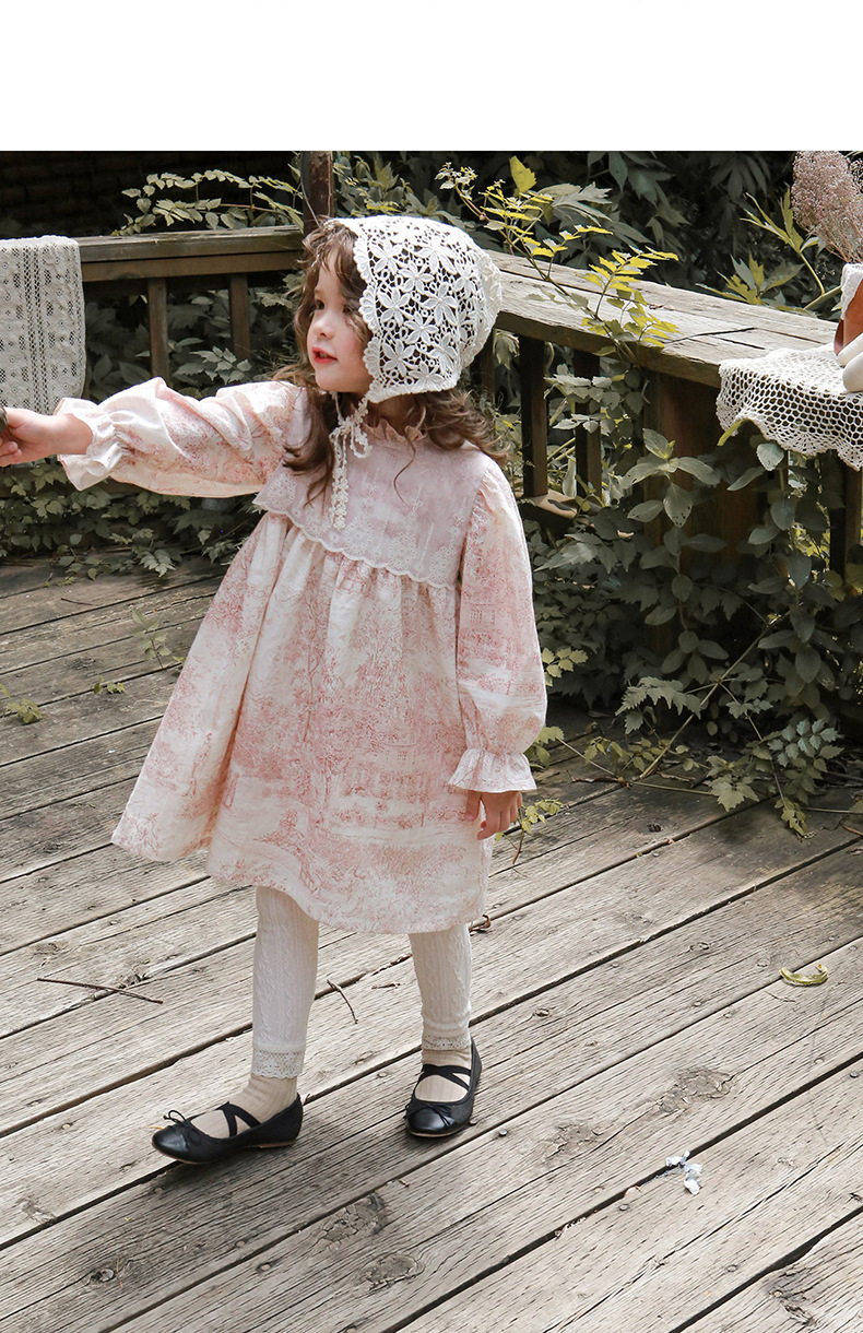 キッズワンピース 風景画プリントチュールレースドッキング長袖パフスリーブワンピース【mh0009080】