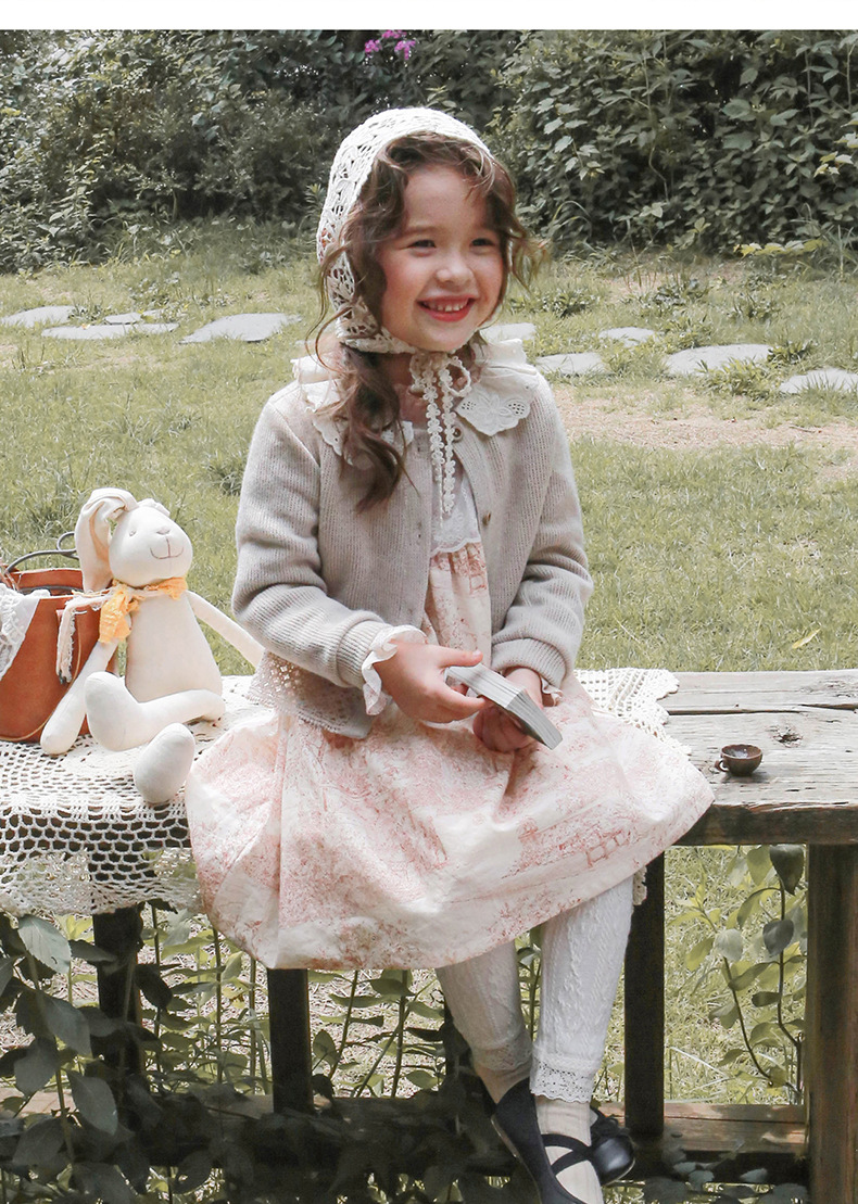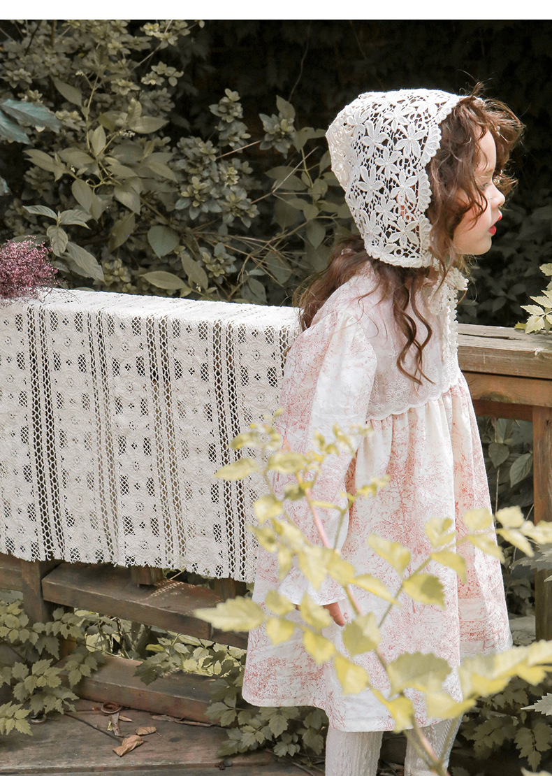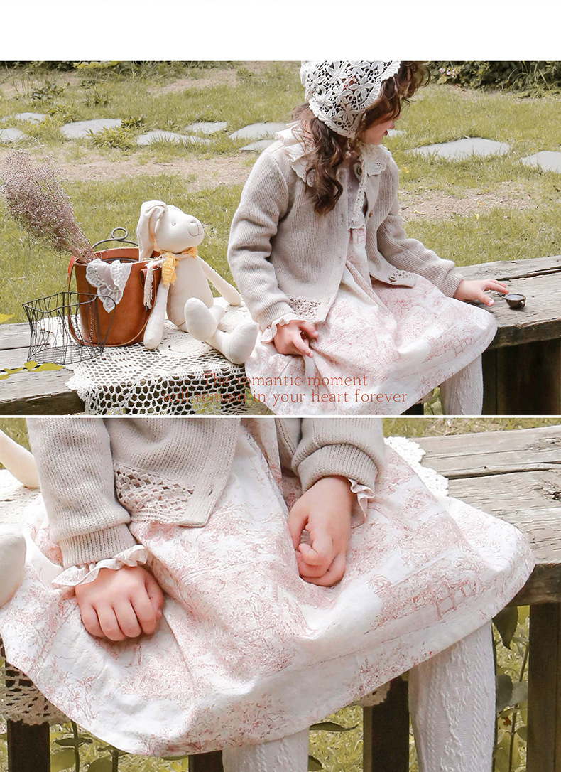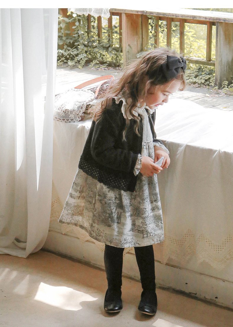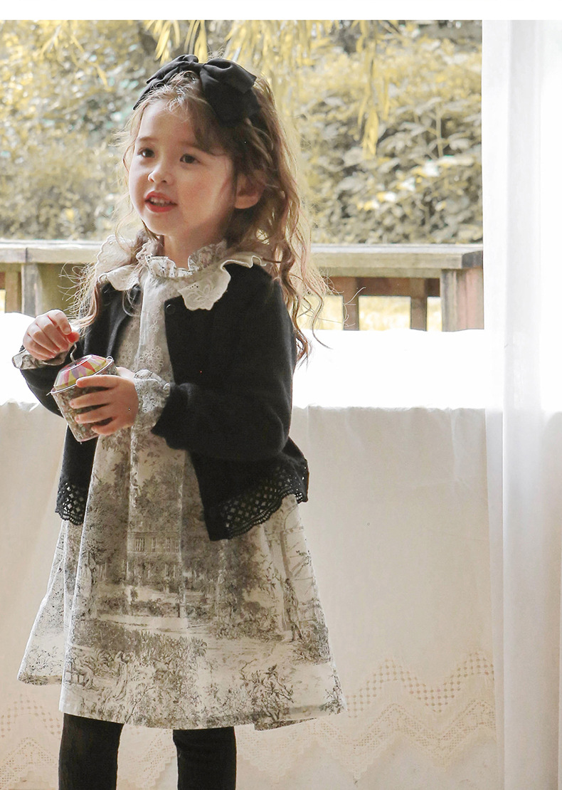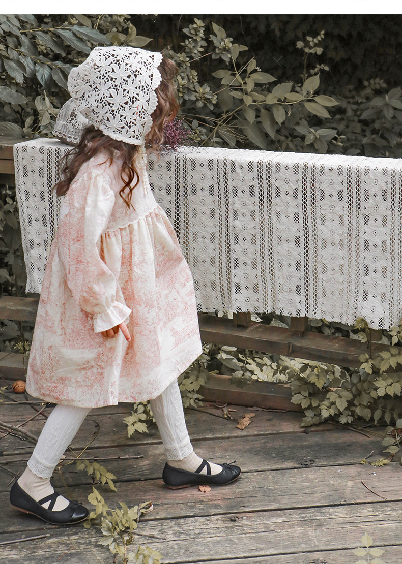 キッズワンピース 風景画プリントチュールレースドッキング長袖パフスリーブワンピース【mh0009080】