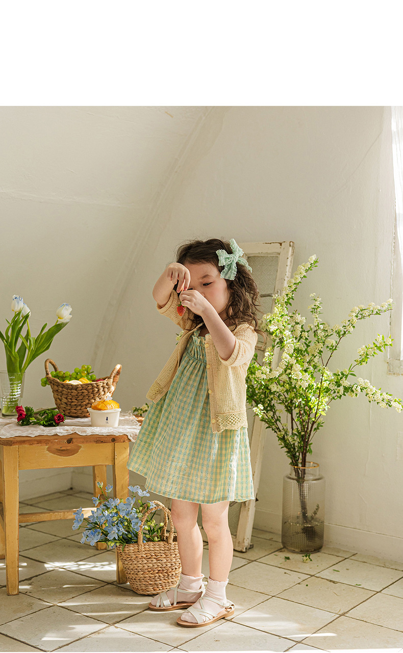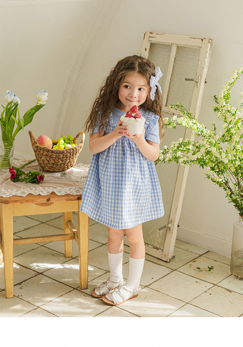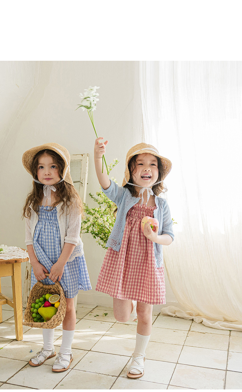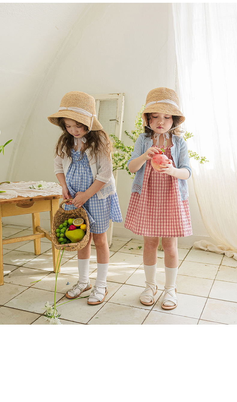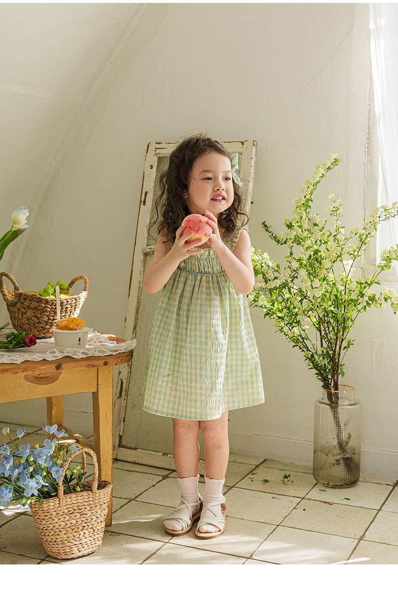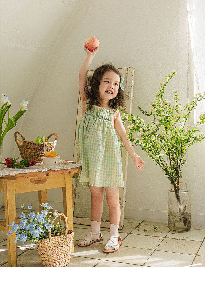 爽やかなギンガムチェックが夏にぴったりの、キッズ用ノースリーブワンピースです。薄手のコットン素材で、涼しく快適な着心地。小さめのギンガムチェック柄が、上品で可愛らしい印象を与えます。シンプルなデザインなので、普段使いはもちろん、ちょっとしたお出かけにもぴったり。お手持ちのカーディガンやボレロを羽織れば、長い期間着用できます。夏のおしゃれを軽やかに彩る一枚です。