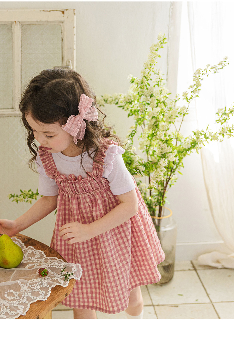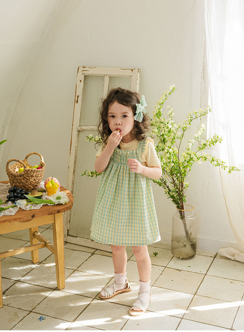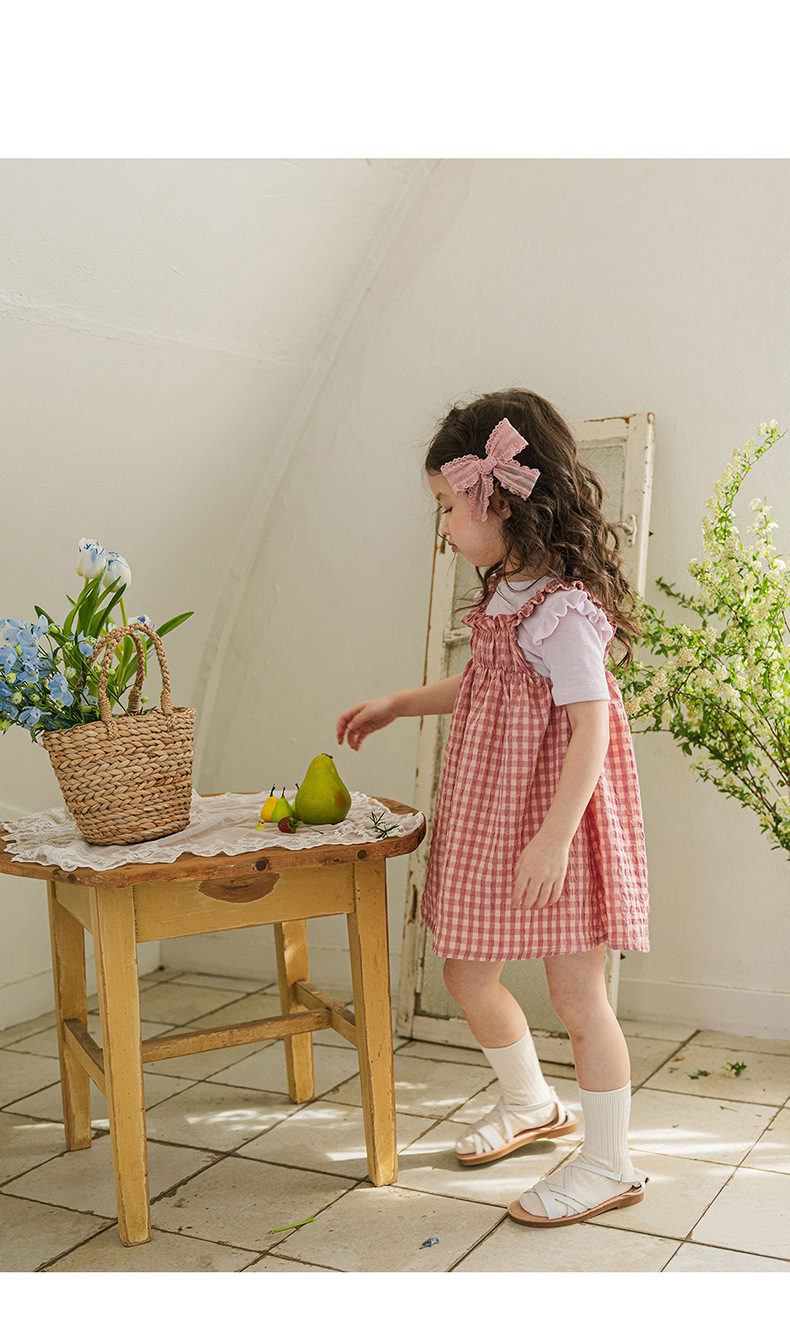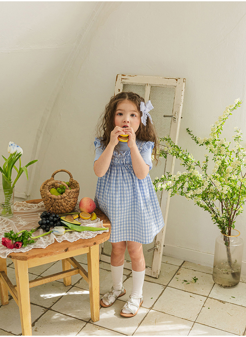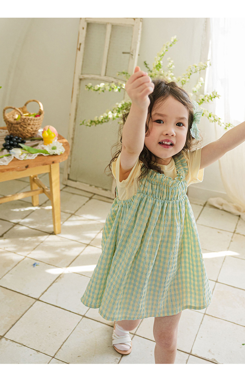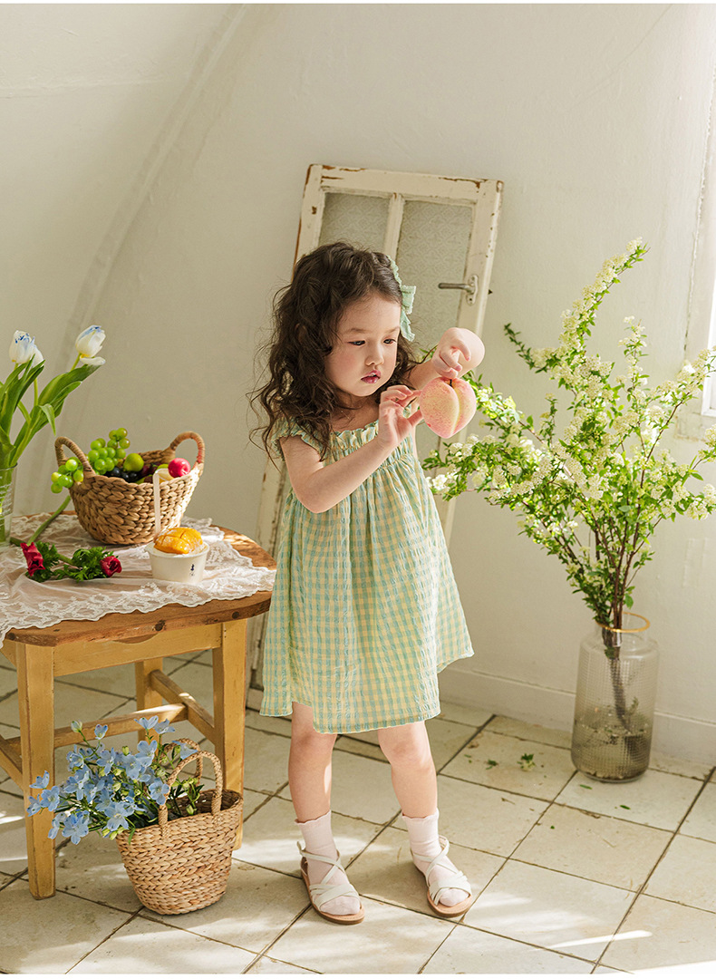 爽やかなギンガムチェックが夏にぴったりの、キッズ用ノースリーブワンピースです。薄手のコットン素材で、涼しく快適な着心地。小さめのギンガムチェック柄が、上品で可愛らしい印象を与えます。シンプルなデザインなので、普段使いはもちろん、ちょっとしたお出かけにもぴったり。お手持ちのカーディガンやボレロを羽織れば、長い期間着用できます。夏のおしゃれを軽やかに彩る一枚です。