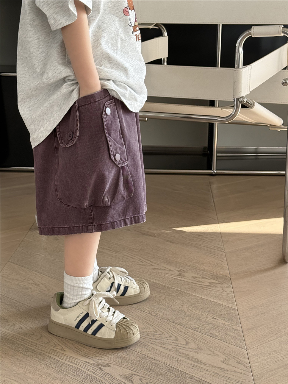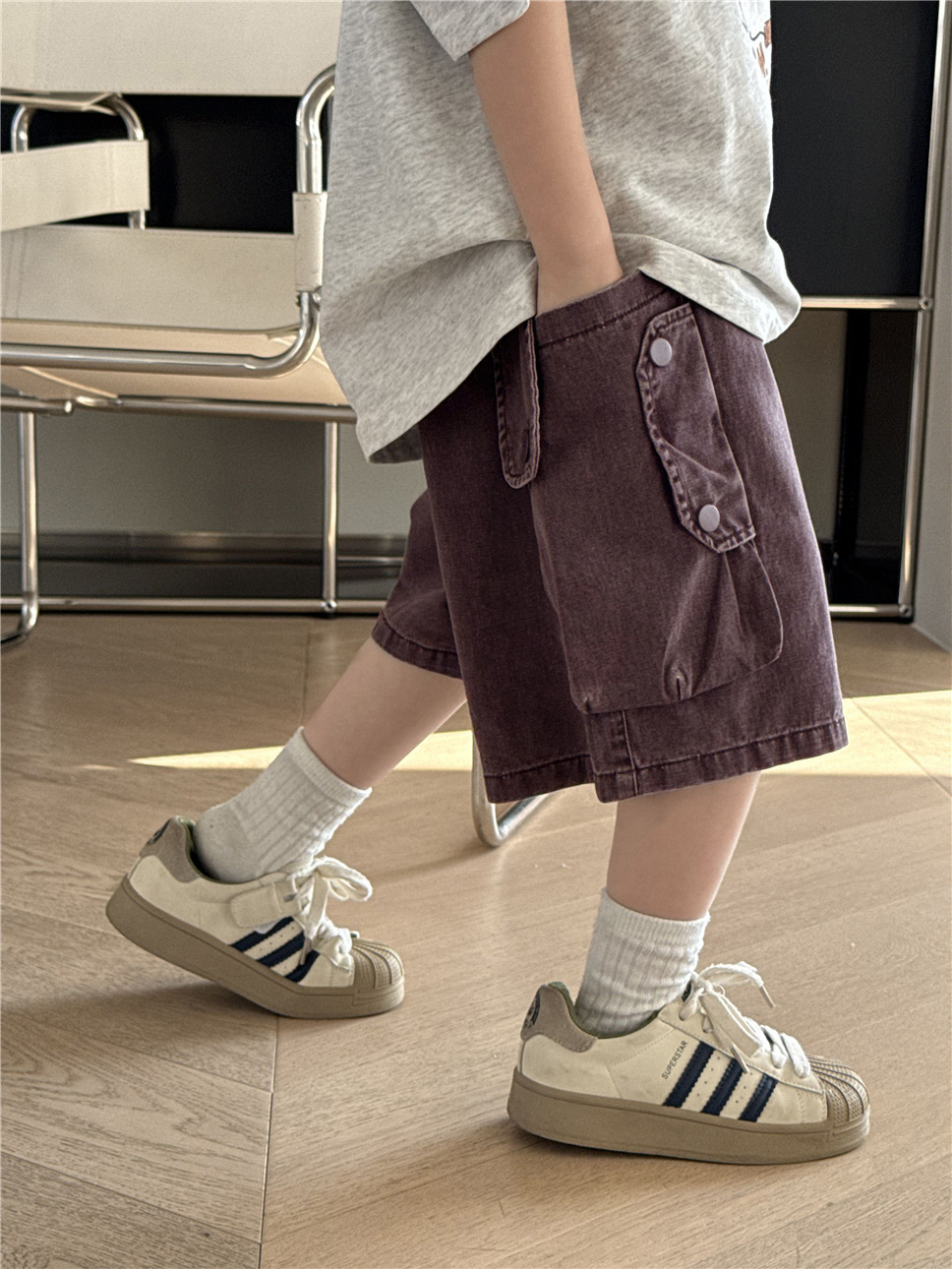 薄手のコットン素材で仕立てられているため、暑い日でもお子様が快適に過ごせるように配慮しました。ゆったりとしたシルエットで、活発に動き回るお子様にも安心の、動きやすさを追求したデザインです。ボーイズ、ガールズ問わず着用できるユニセックス仕様で、普段使いはもちろん、アウトドアシーンにもおすすめです。このデニムカーゴハーフパンツは、お子様の日常の装いに彩りを添える一着です。