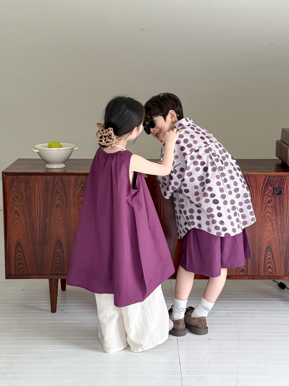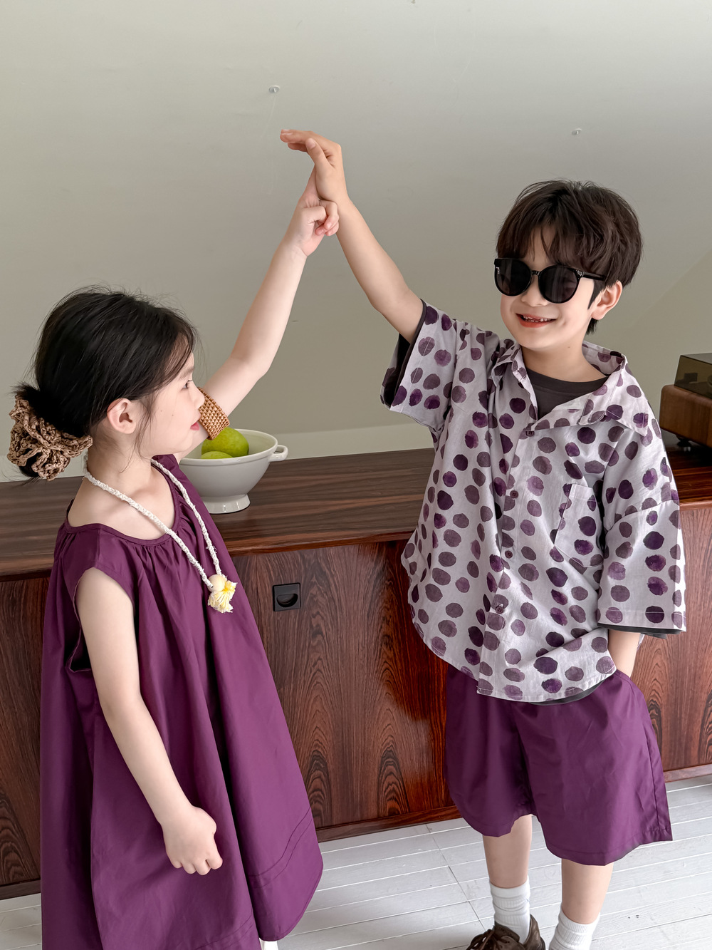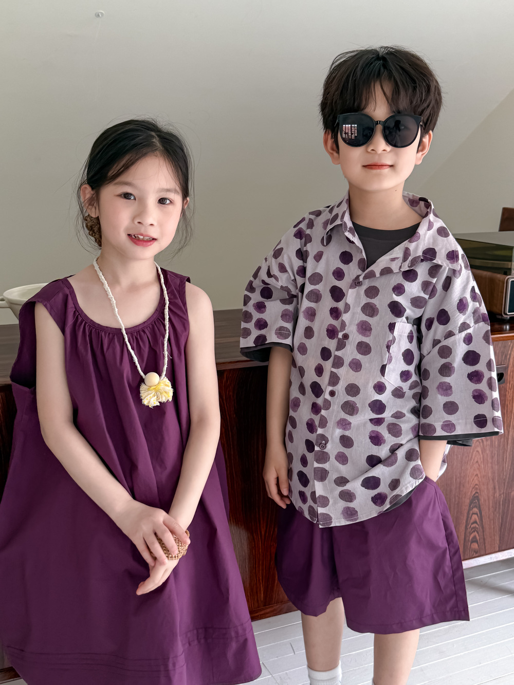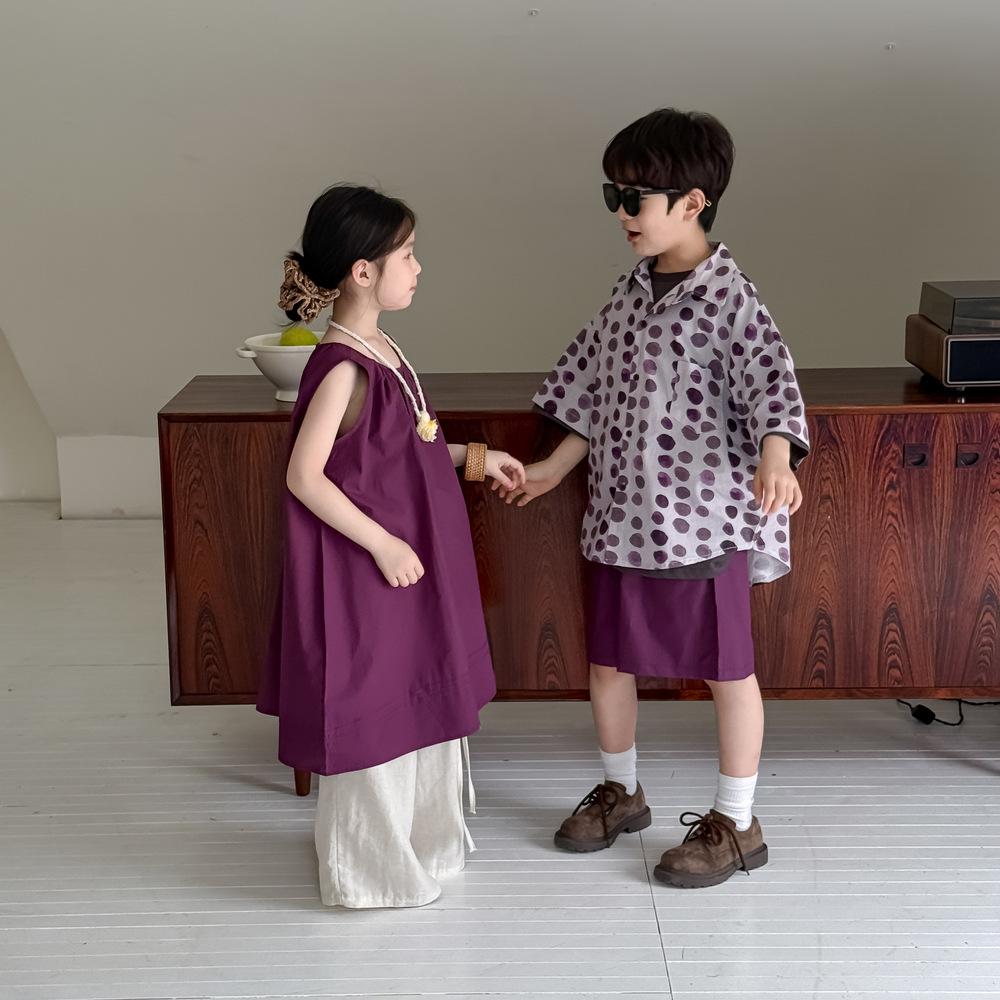 可愛らしい夏のコーディネートが楽しめる、パープルノースリーブワンピースとポルカドット半袖シャツ+ショートパンツセットです。兄弟姉妹でお揃いコーデも楽しめるアイテム!
