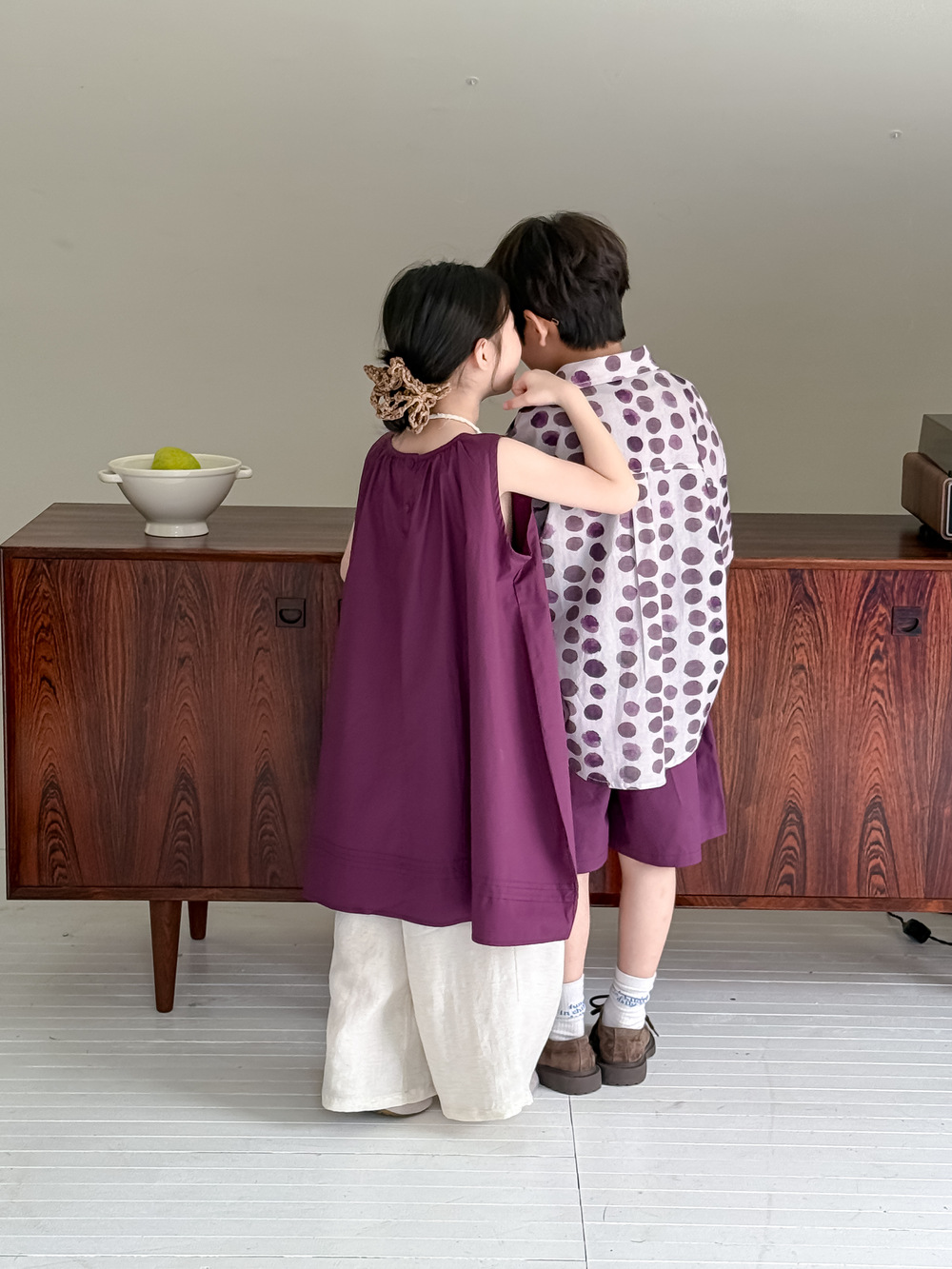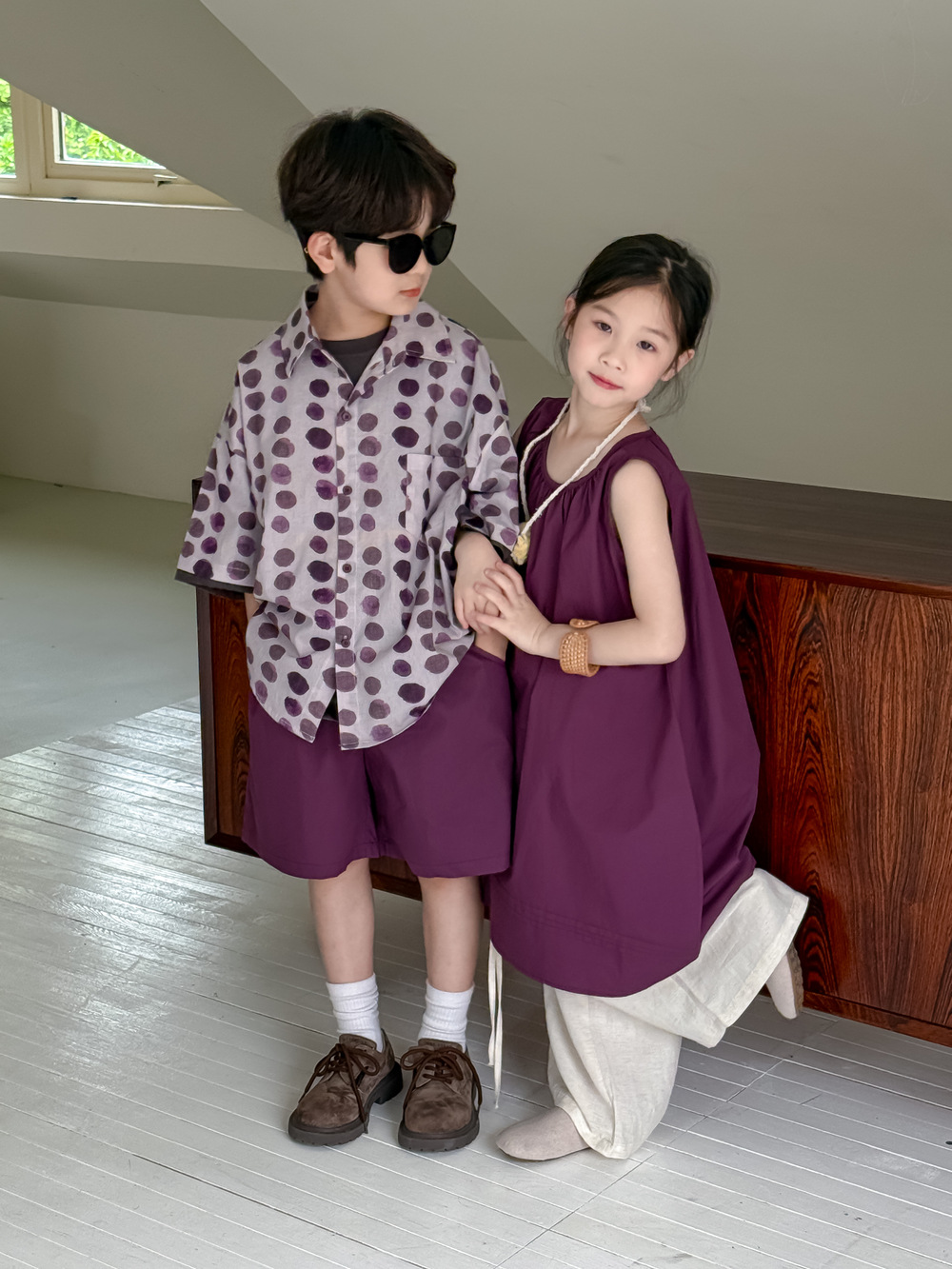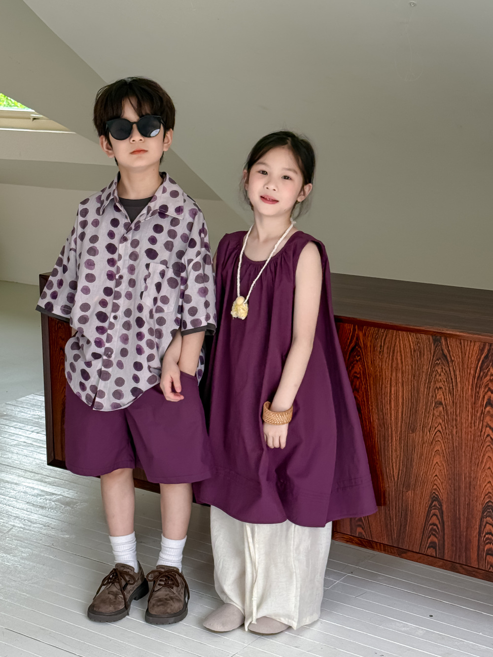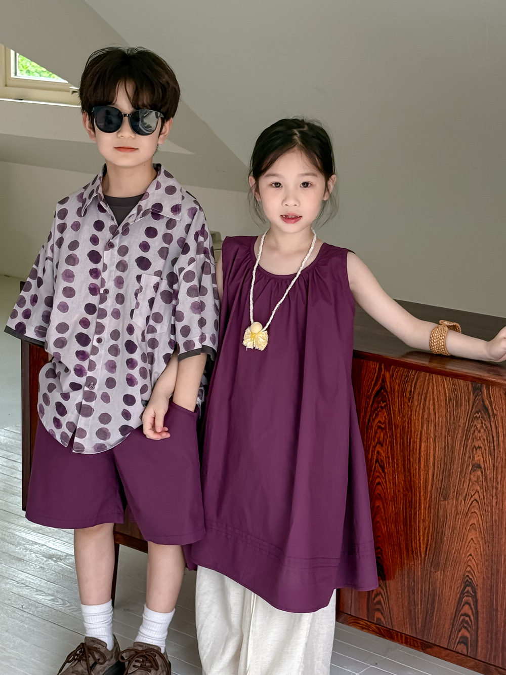可愛らしい夏のコーディネートが楽しめる、パープルノースリーブワンピースとポルカドット半袖シャツ+ショートパンツセットです。兄弟姉妹でお揃いコーデも楽しめるアイテム!