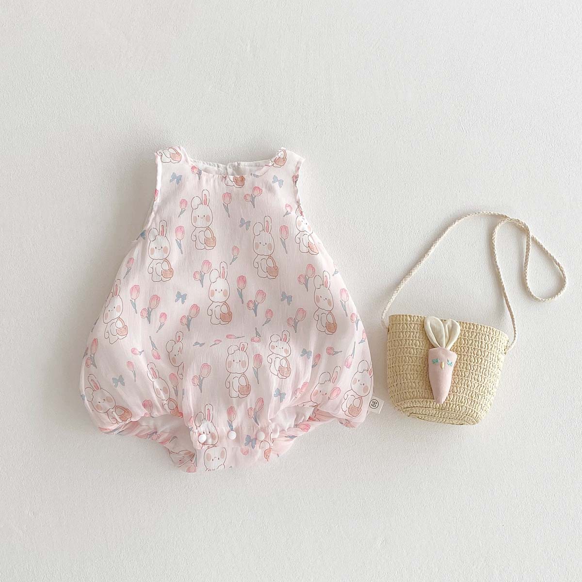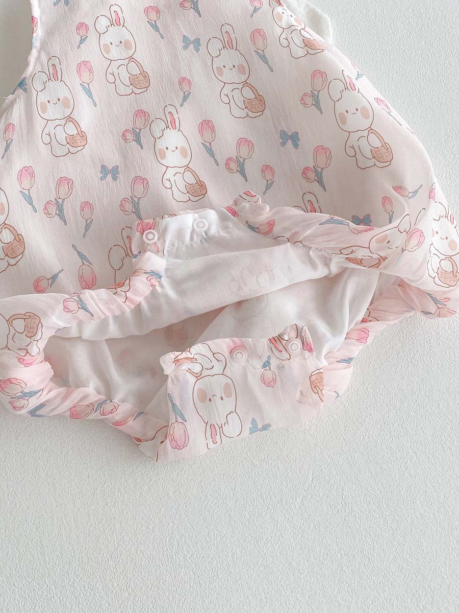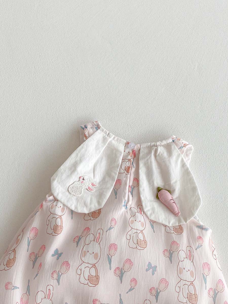夏のベビーガールにぴったりの、うさ耳襟ノースリーブロンパースです。ピンクのチューリップとうさぎモチーフが愛らしい一枚。