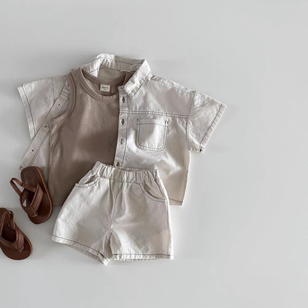シンプルな無地のデニム素材で、どんなインナーやトップスにも合わせやすいのが魅力。トップスはカーディガンとしても羽織れる半袖シャツで、ボトムスのショートパンツは動きやすく快適な履き心地です。男の子にも女の子にもおすすめの、着回し力抜群のセットアップです。普段使いはもちろん、アウトドアシーンにも活躍するでしょう。