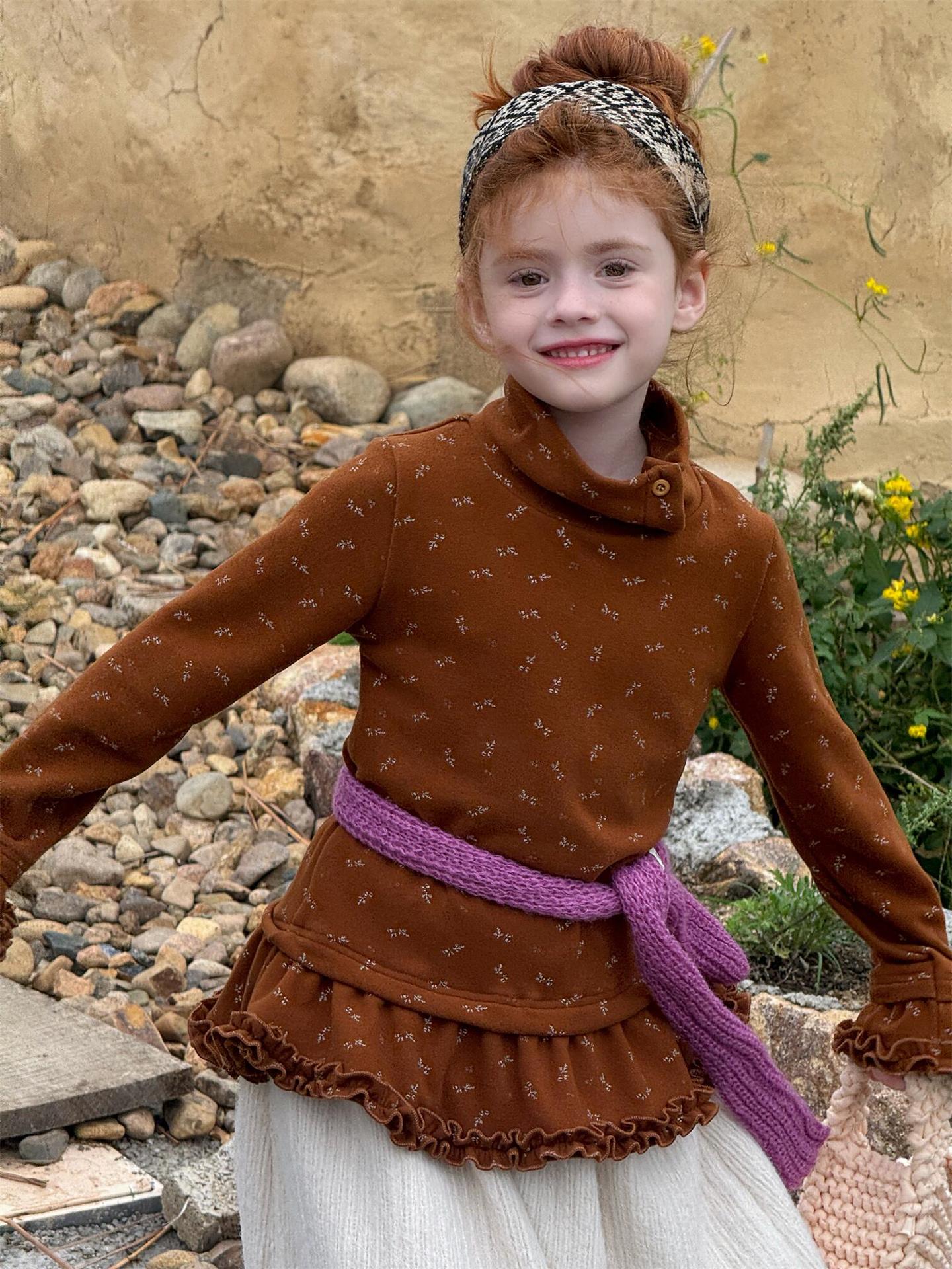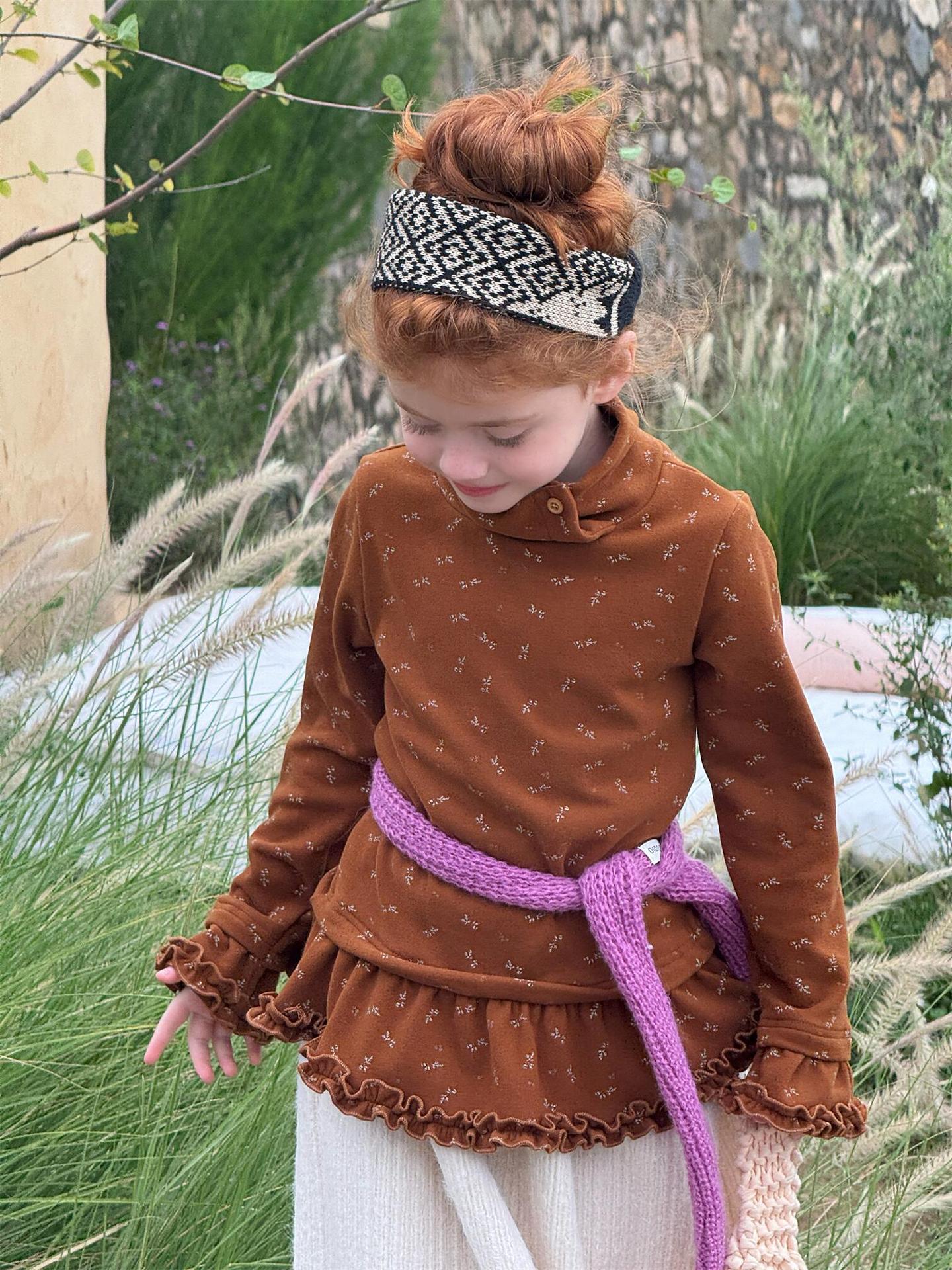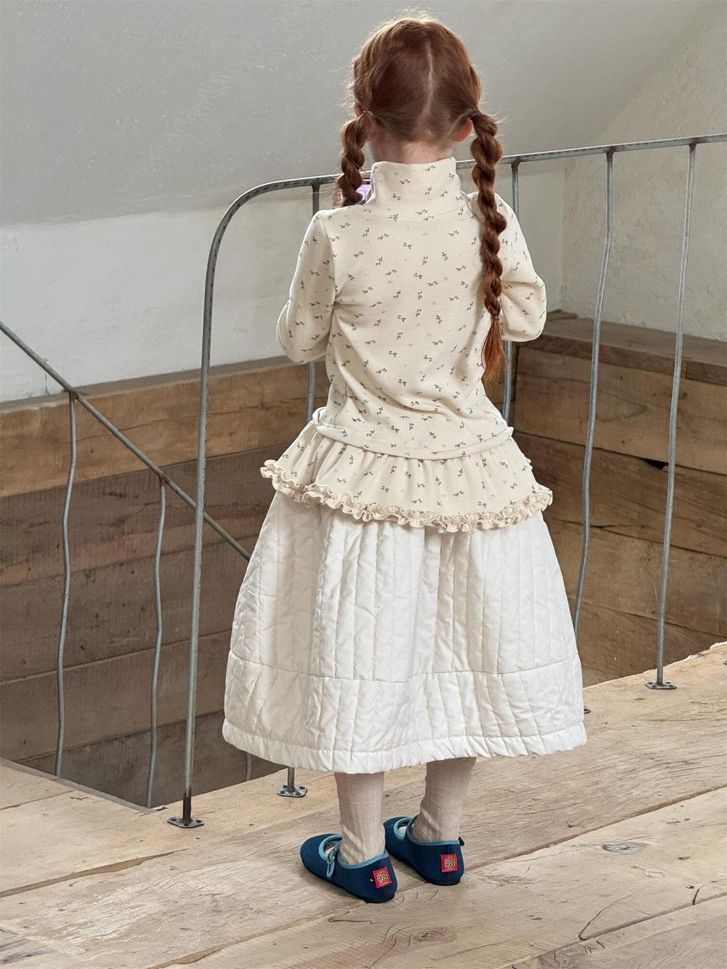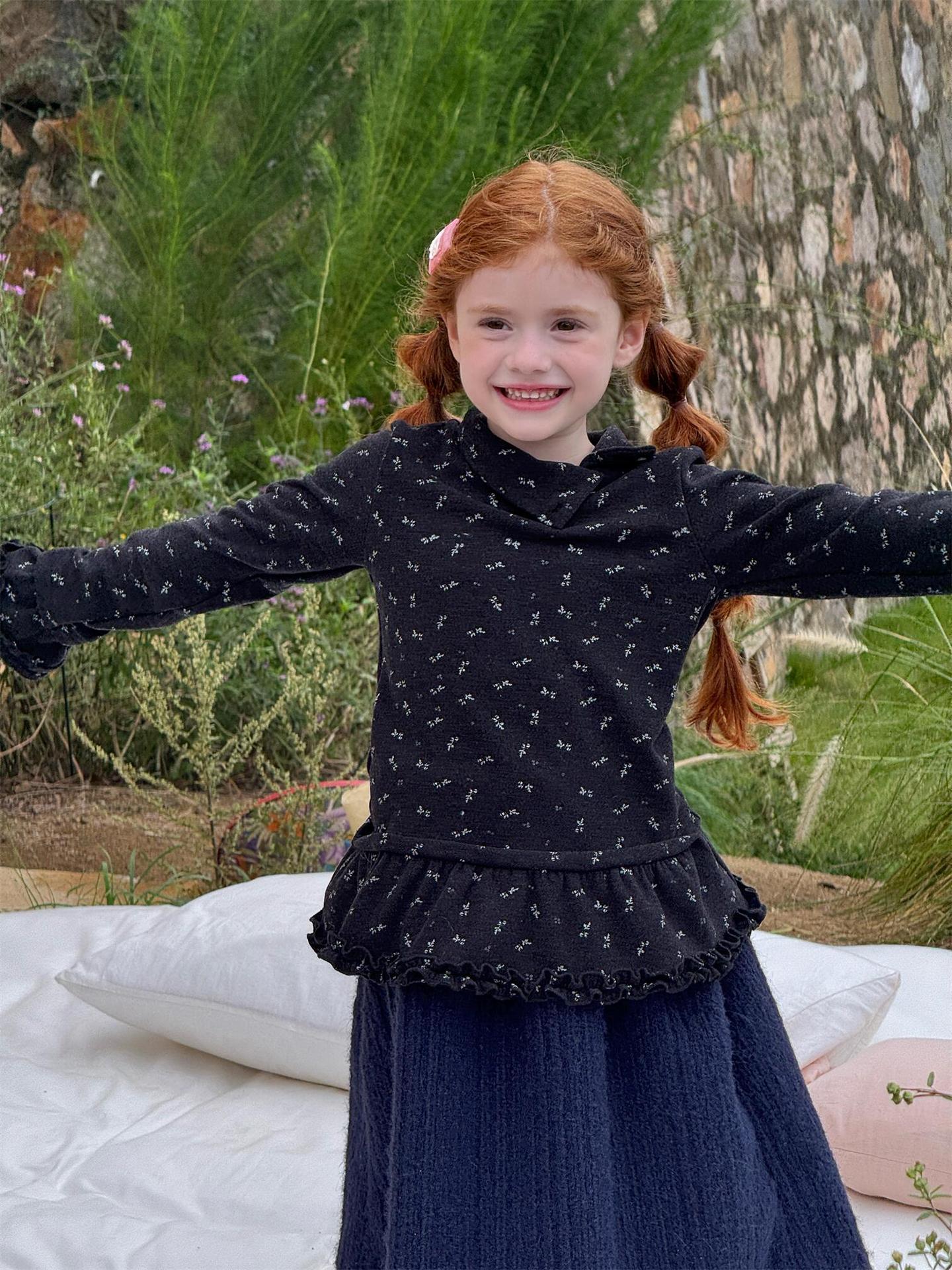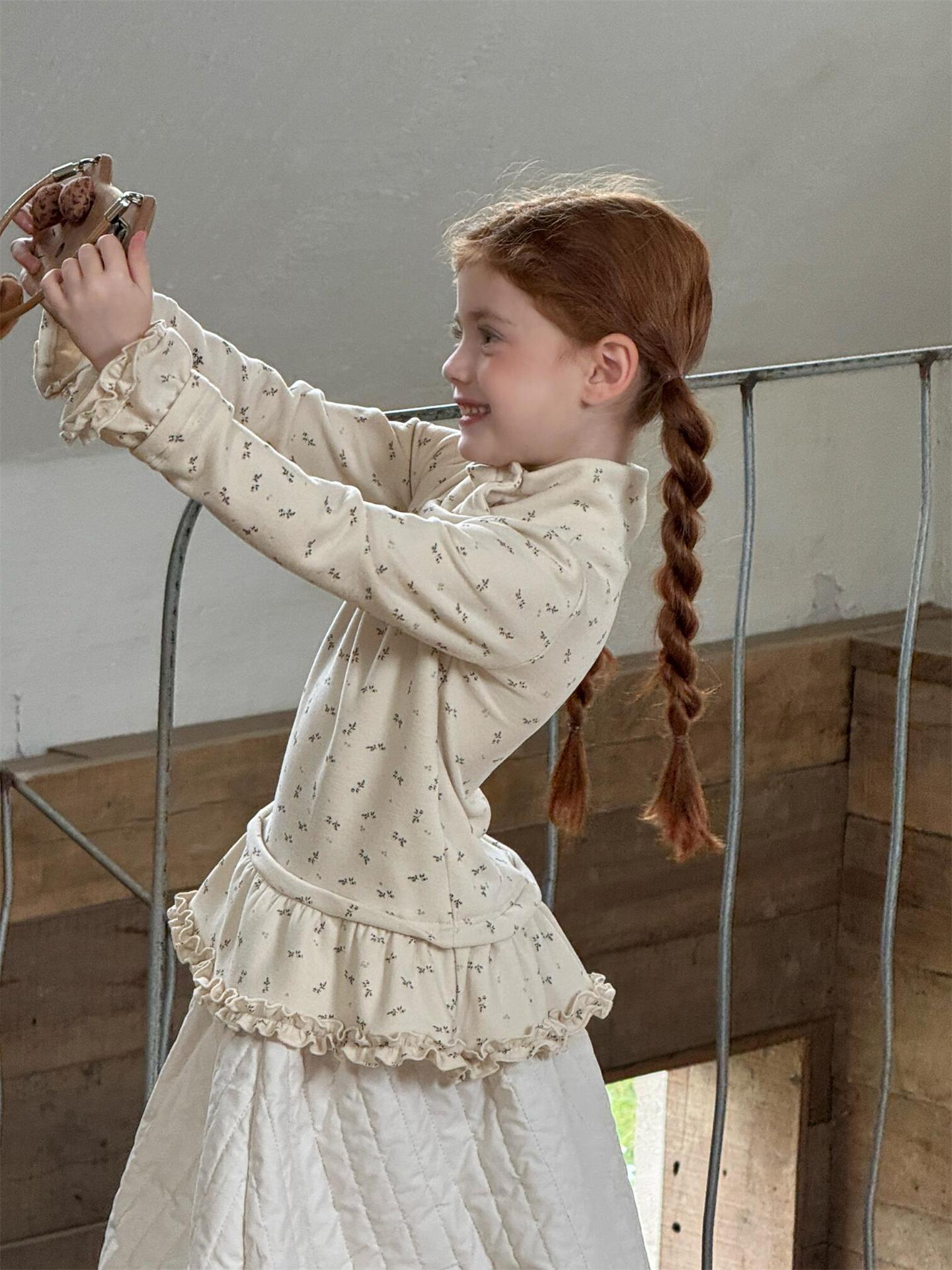 柔らかな肌触りでインナーとして活躍する長袖ハイネックTシャツは、全面にあしらわれた繊細な花柄が愛らしさを添えます。裾のフリルデザインがレイヤードスタイルに軽やかなアクセントを加え、上から重ねるトップスやワンピースとの組み合わせも楽しめます。内側は起毛素材で暖かく仕上げられたこのベースウェアは、寒い季節のコーディネートに欠かせない子ども服です。