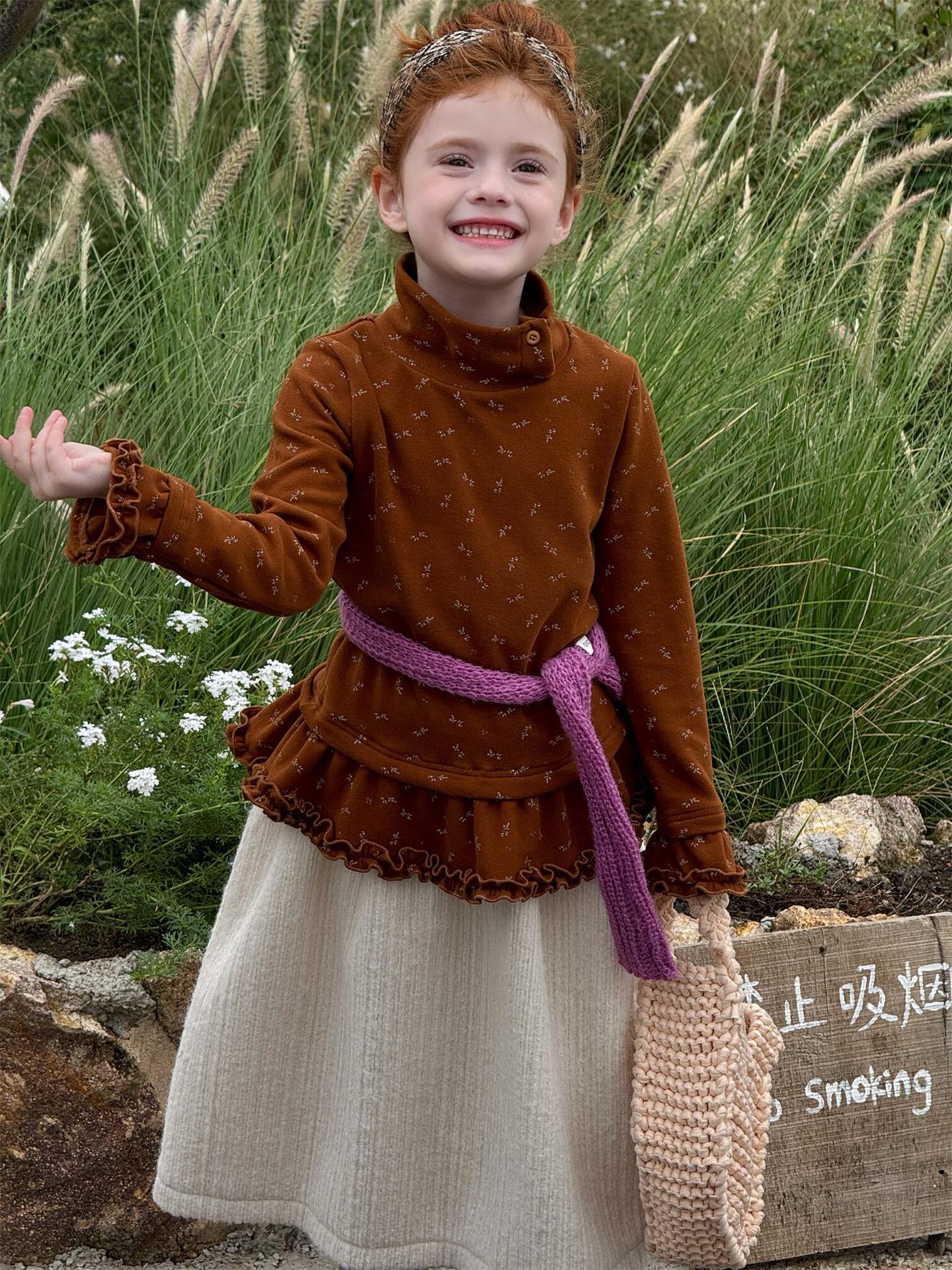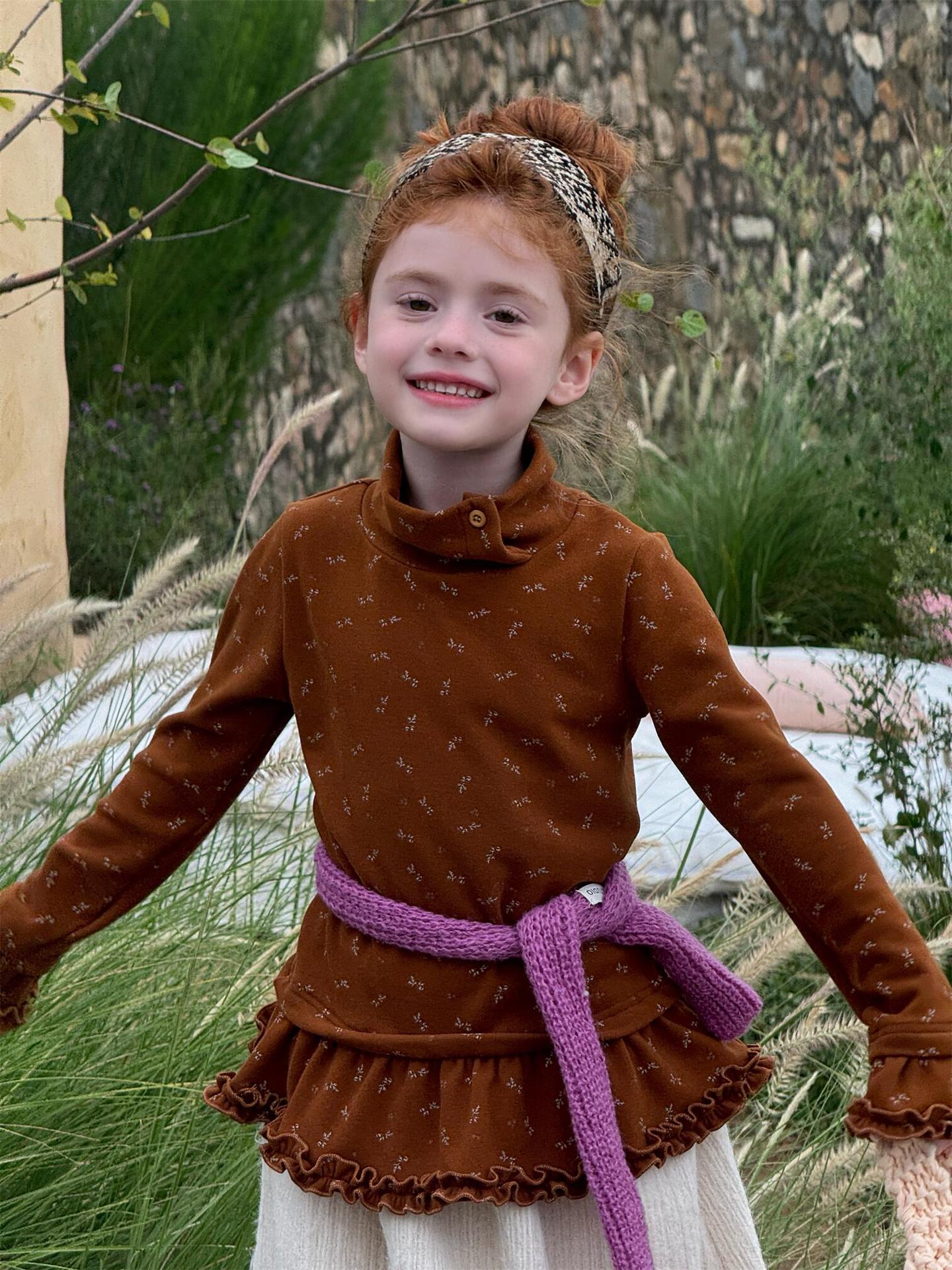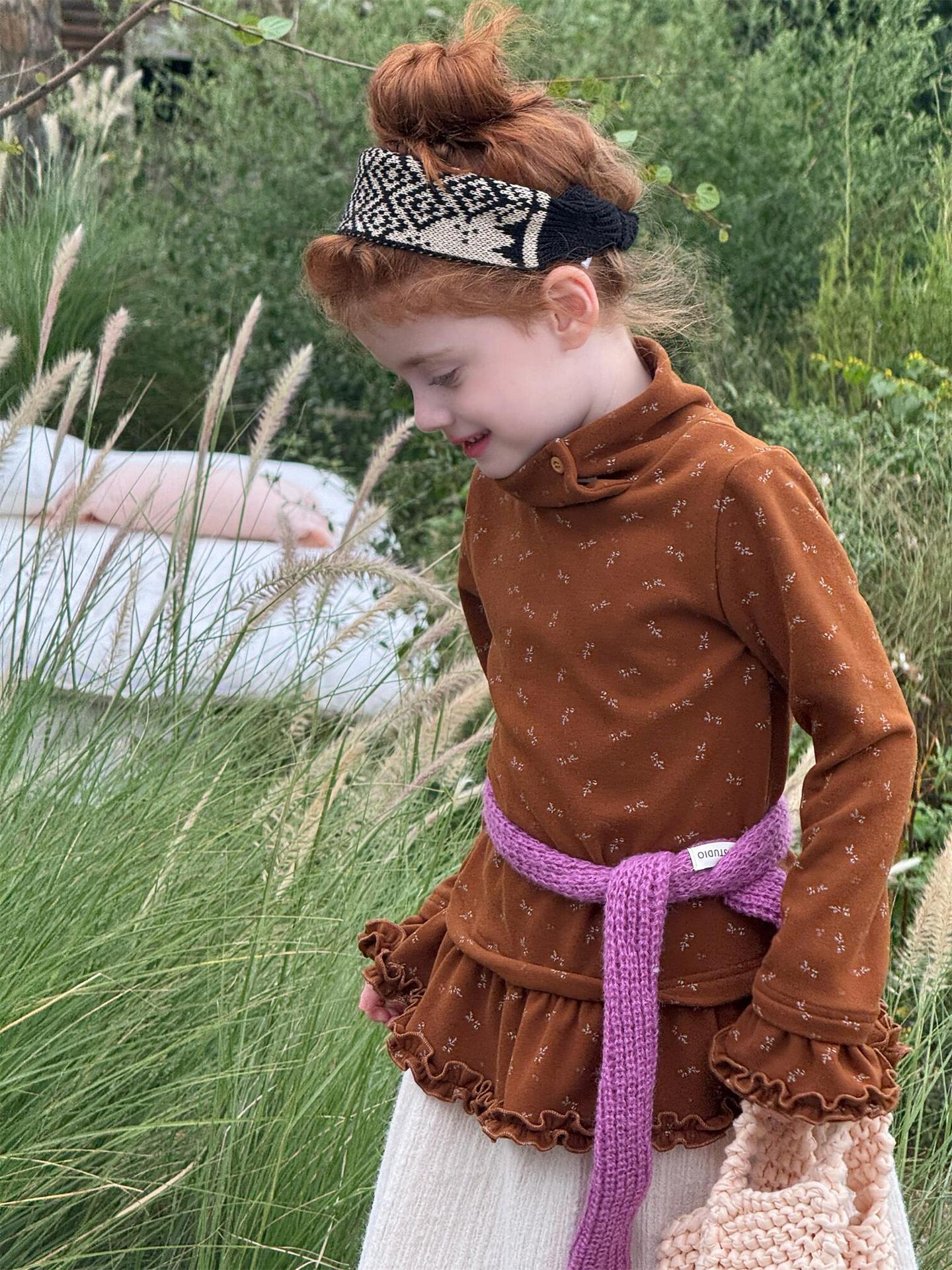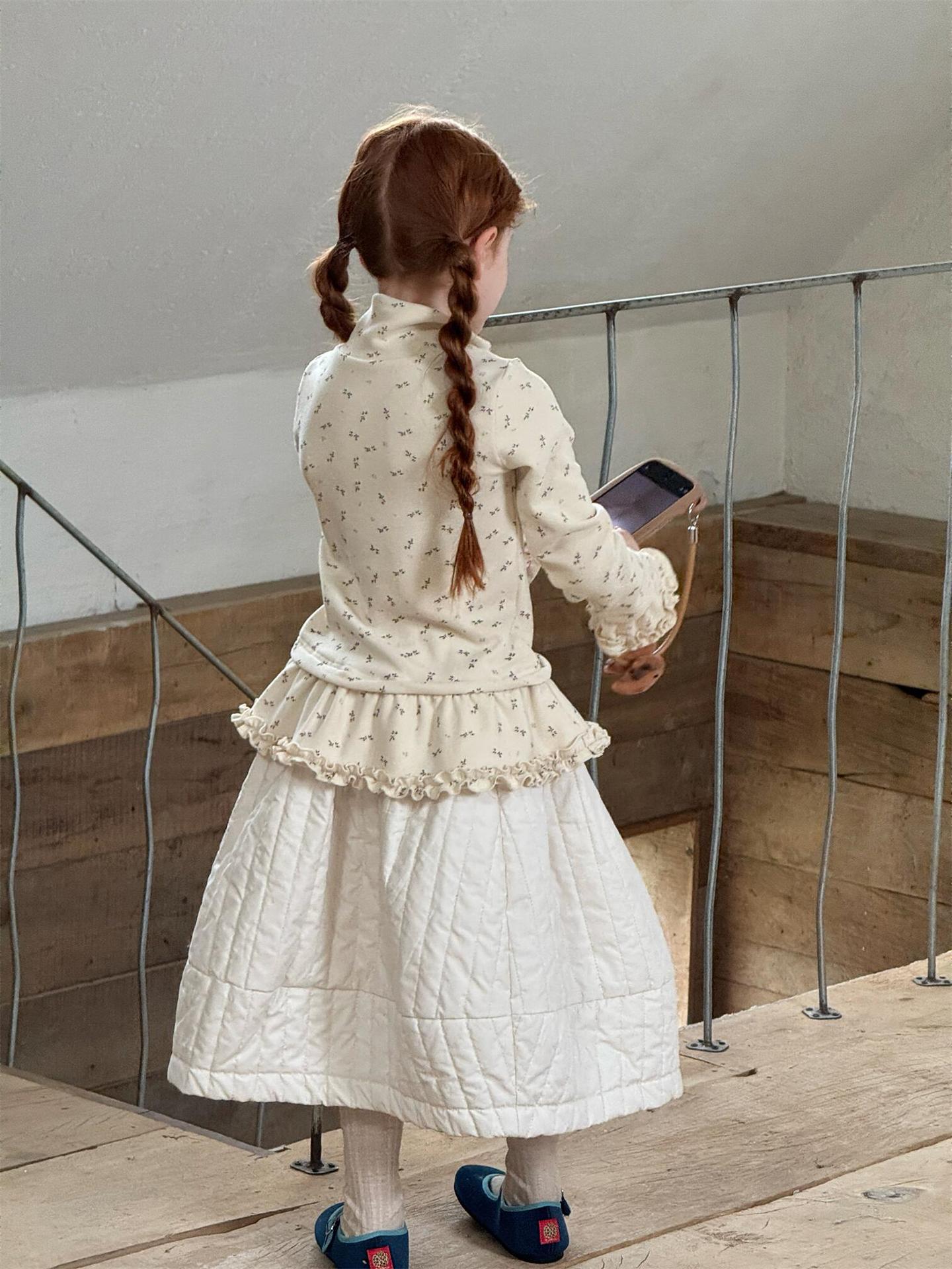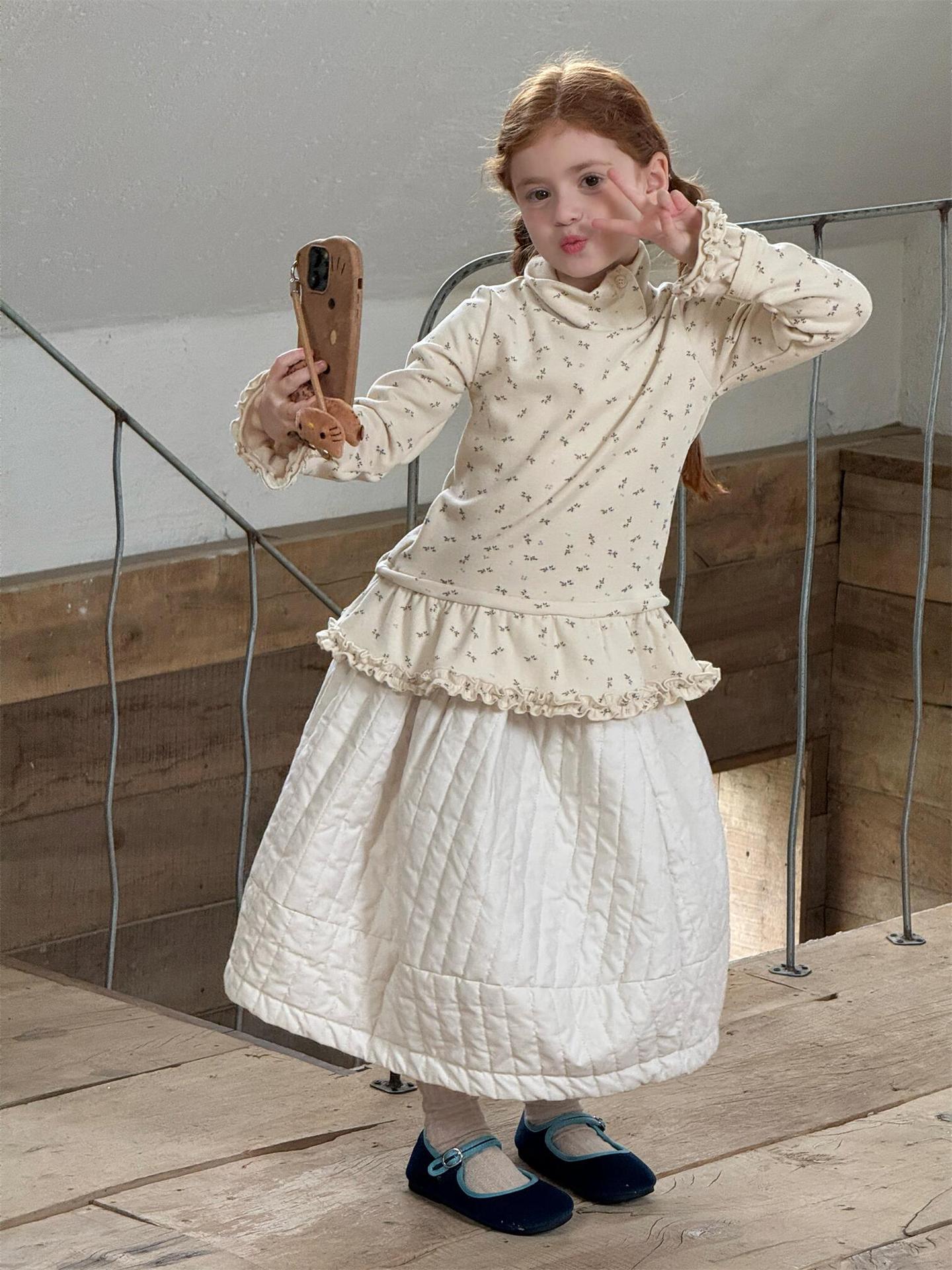 柔らかな肌触りでインナーとして活躍する長袖ハイネックTシャツは、全面にあしらわれた繊細な花柄が愛らしさを添えます。裾のフリルデザインがレイヤードスタイルに軽やかなアクセントを加え、上から重ねるトップスやワンピースとの組み合わせも楽しめます。内側は起毛素材で暖かく仕上げられたこのベースウェアは、寒い季節のコーディネートに欠かせない子ども服です。