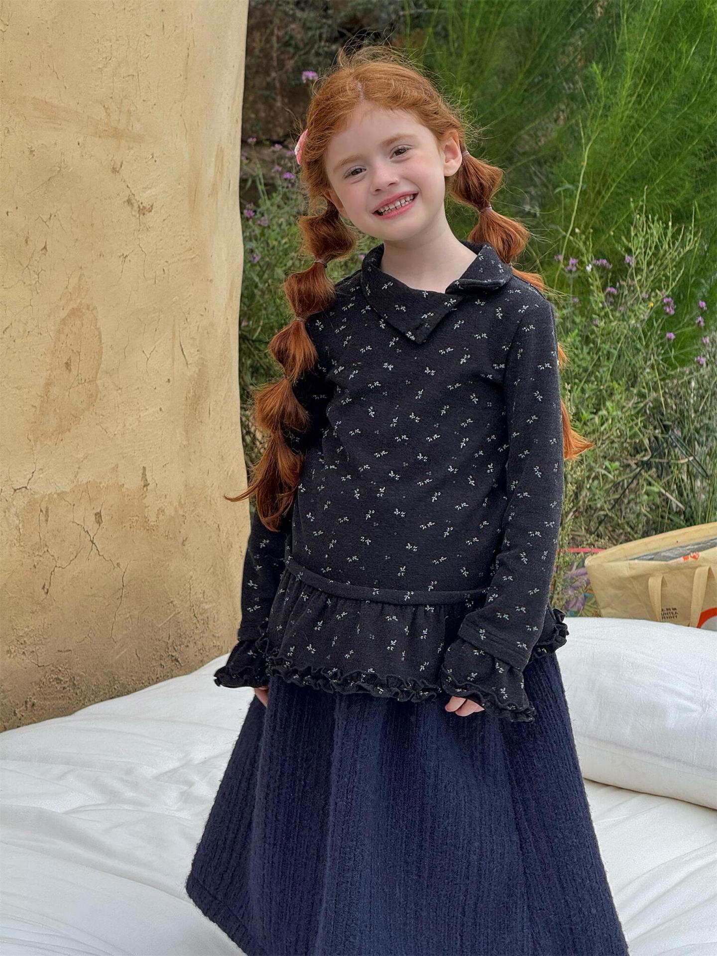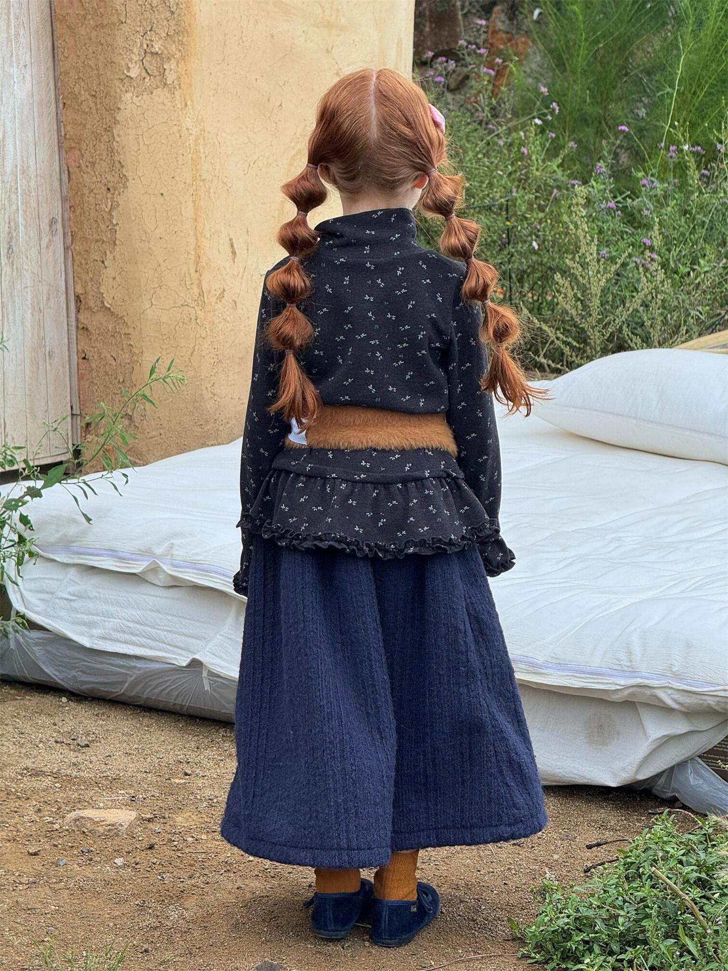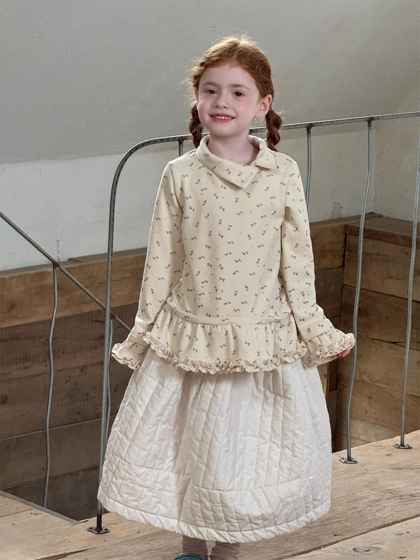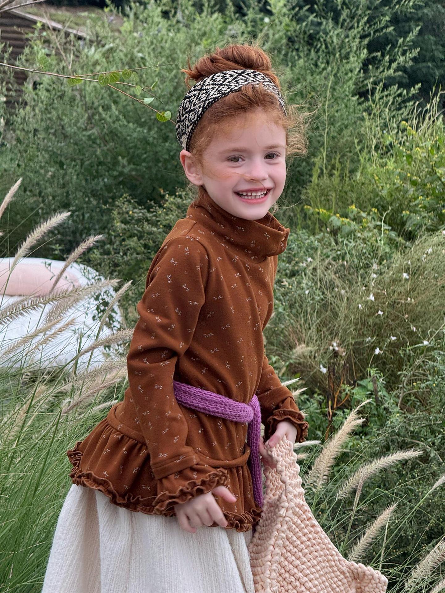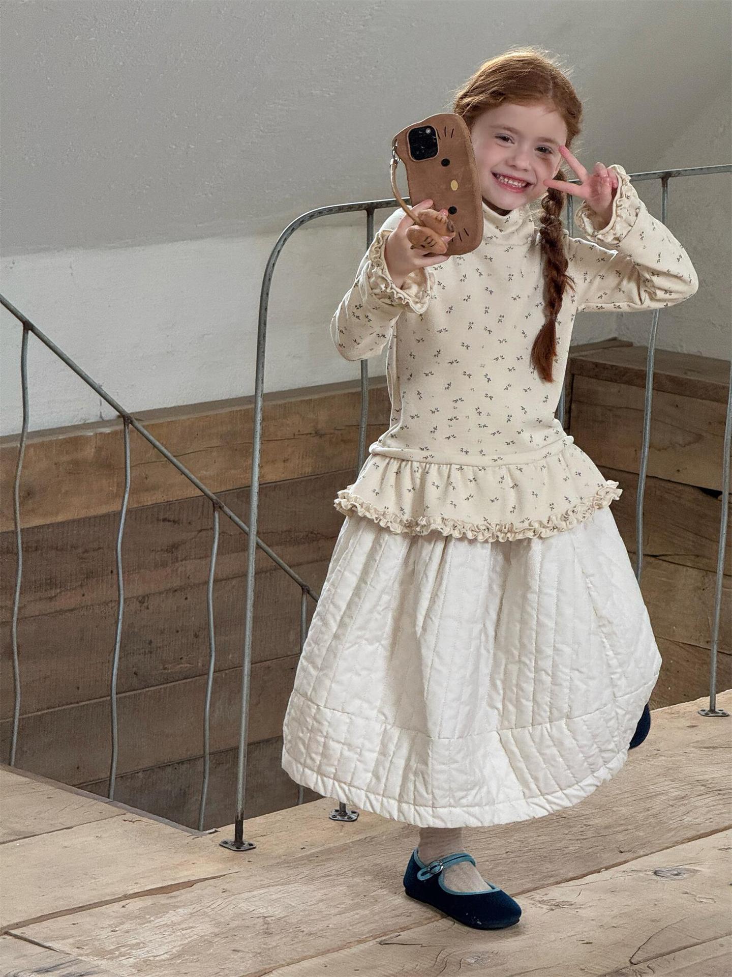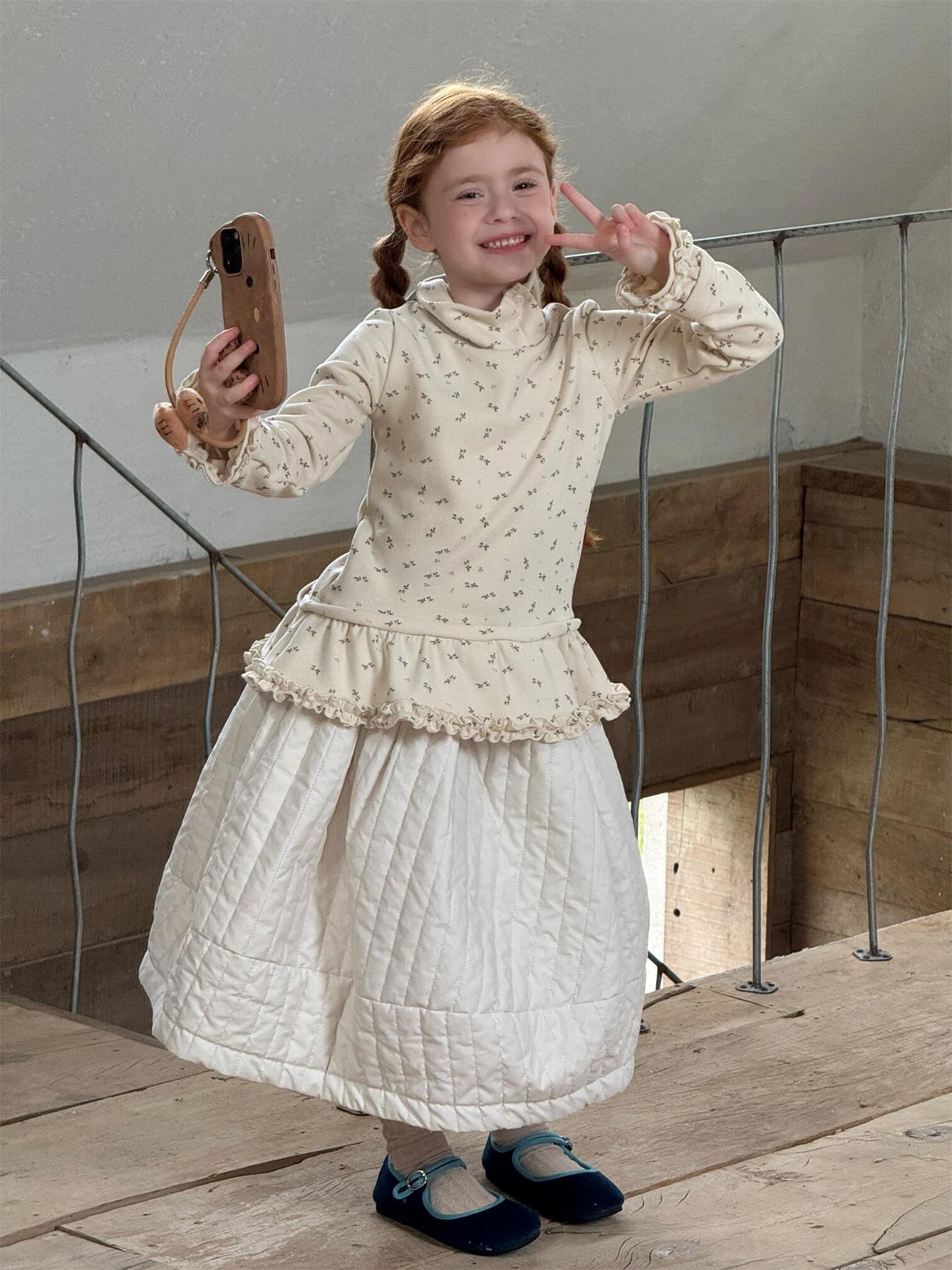 柔らかな肌触りでインナーとして活躍する長袖ハイネックTシャツは、全面にあしらわれた繊細な花柄が愛らしさを添えます。裾のフリルデザインがレイヤードスタイルに軽やかなアクセントを加え、上から重ねるトップスやワンピースとの組み合わせも楽しめます。内側は起毛素材で暖かく仕上げられたこのベースウェアは、寒い季節のコーディネートに欠かせない子ども服です。