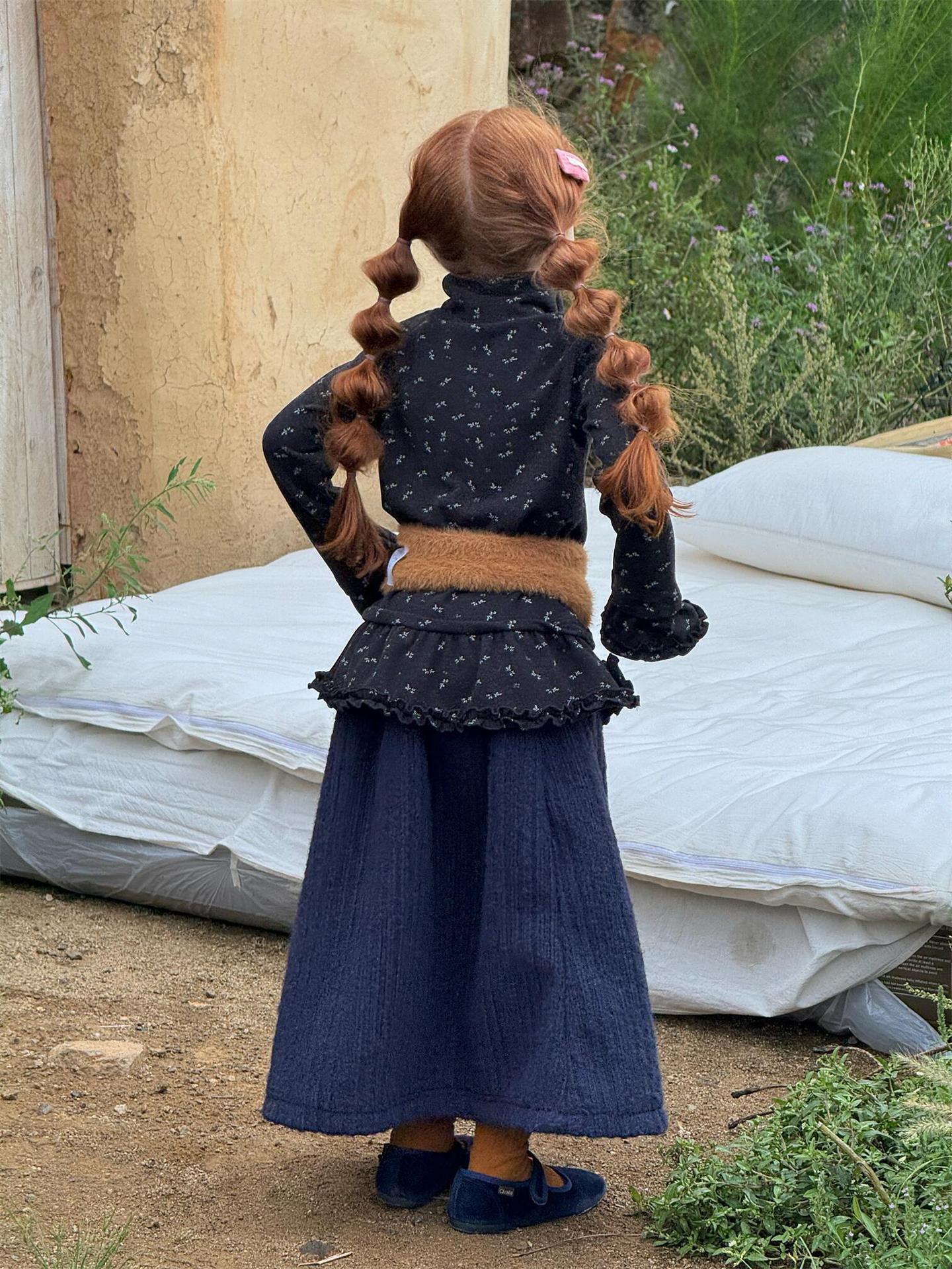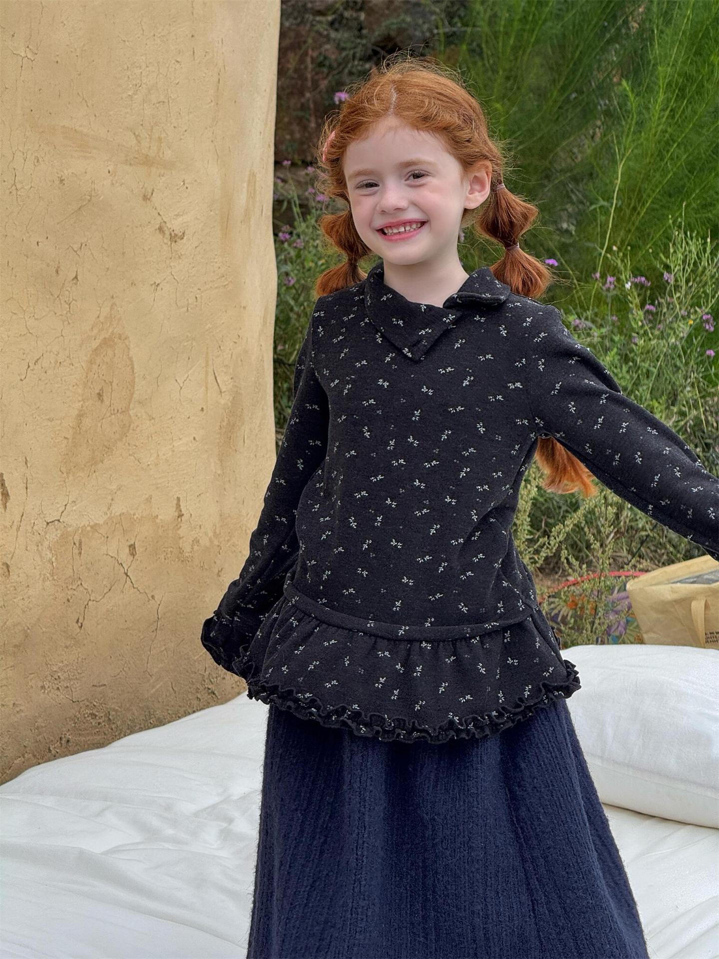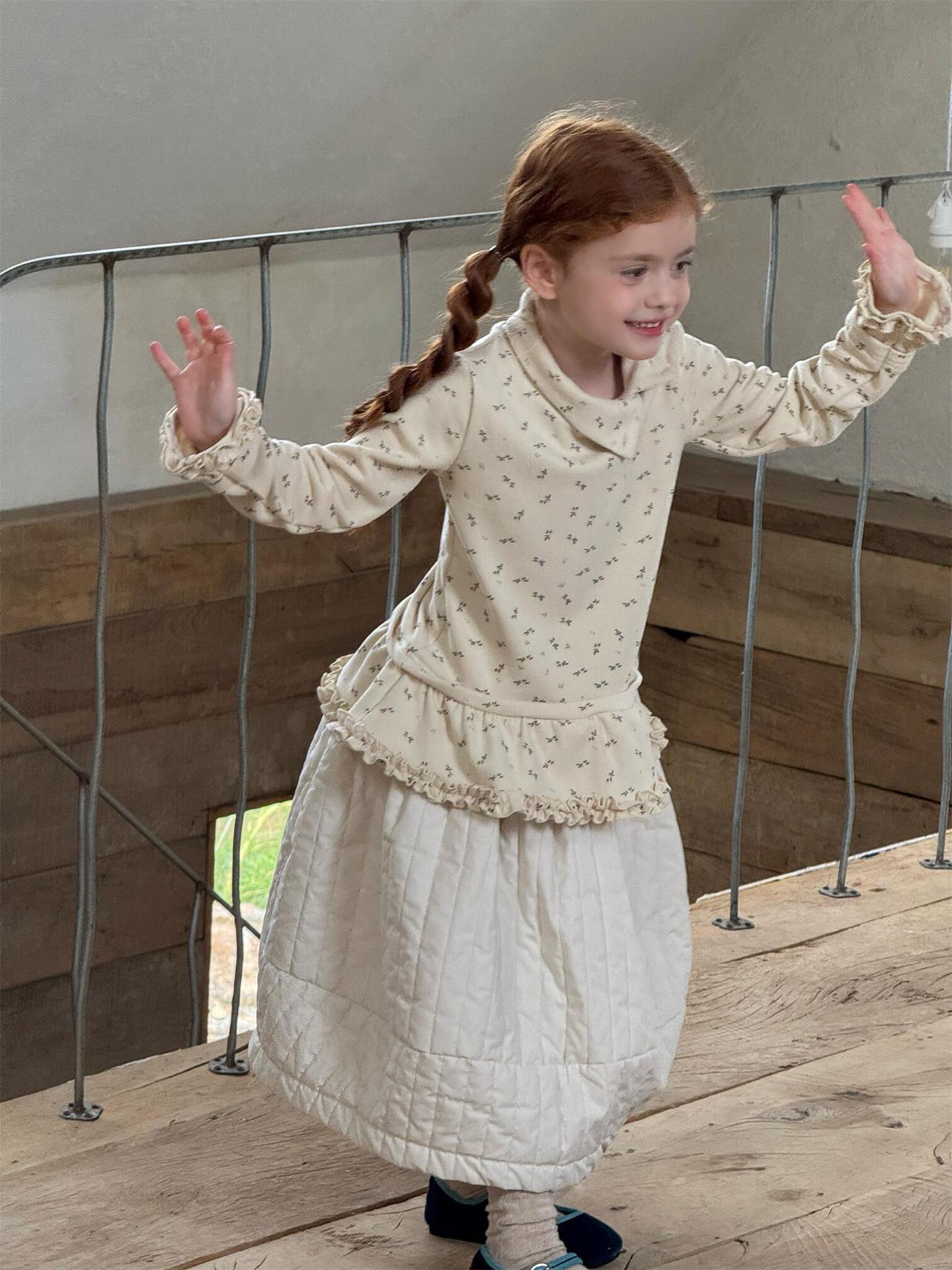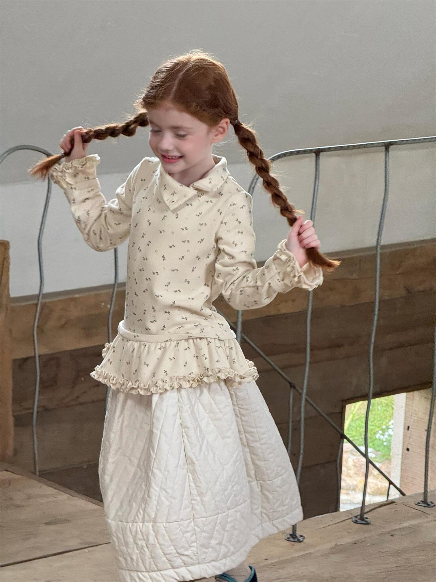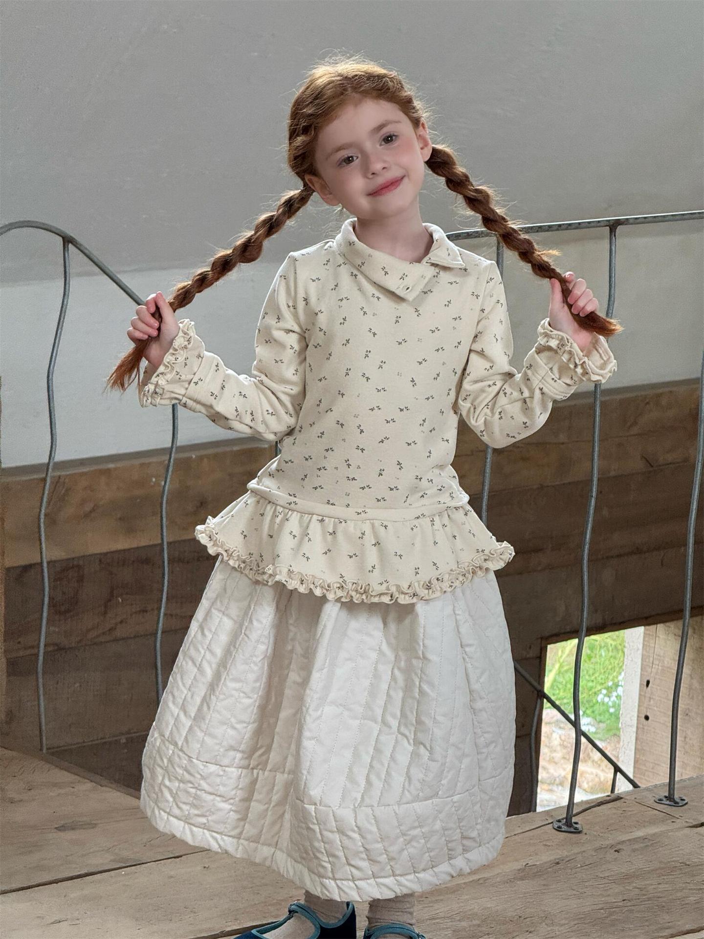 柔らかな肌触りでインナーとして活躍する長袖ハイネックTシャツは、全面にあしらわれた繊細な花柄が愛らしさを添えます。裾のフリルデザインがレイヤードスタイルに軽やかなアクセントを加え、上から重ねるトップスやワンピースとの組み合わせも楽しめます。内側は起毛素材で暖かく仕上げられたこのベースウェアは、寒い季節のコーディネートに欠かせない子ども服です。