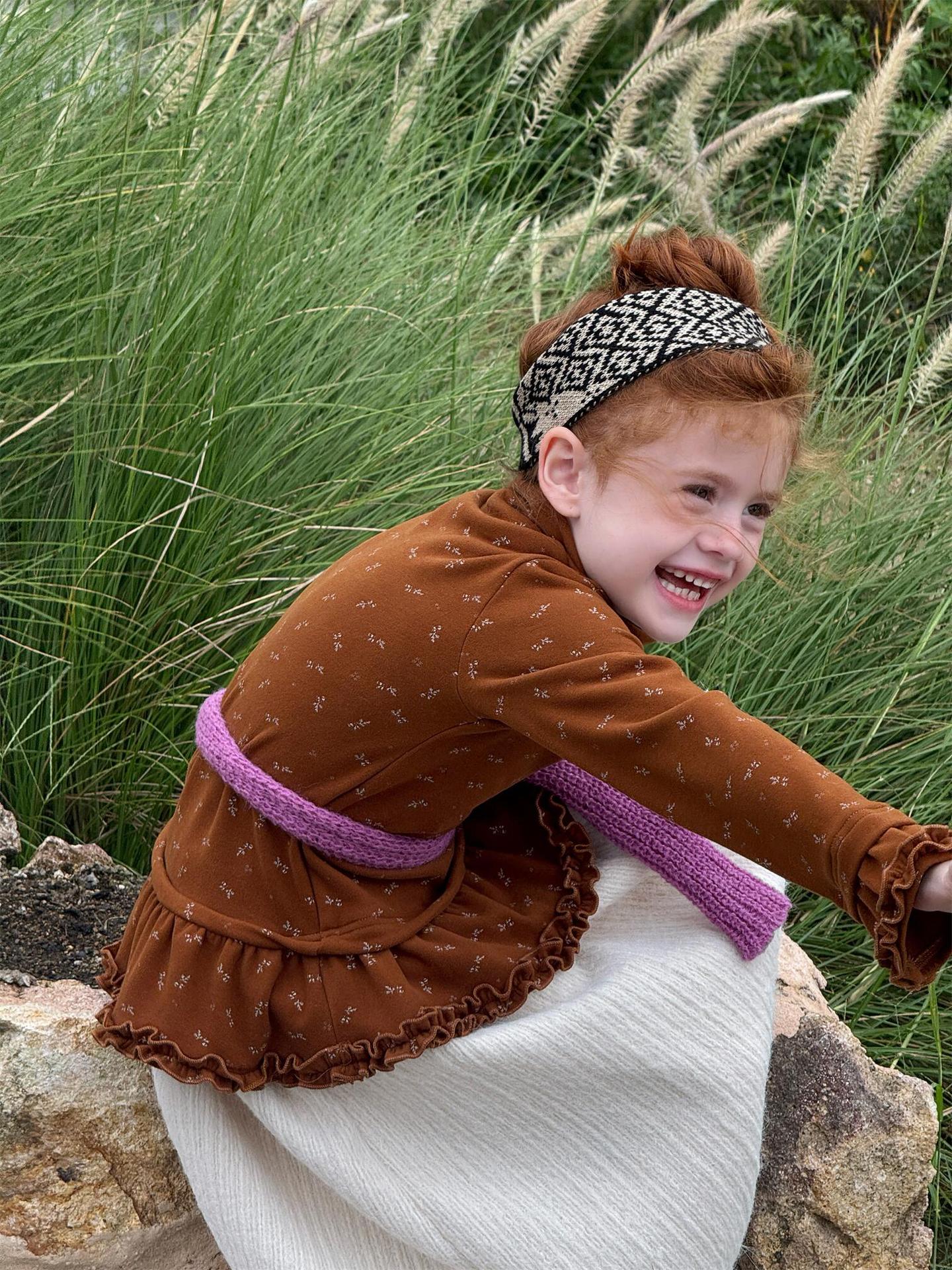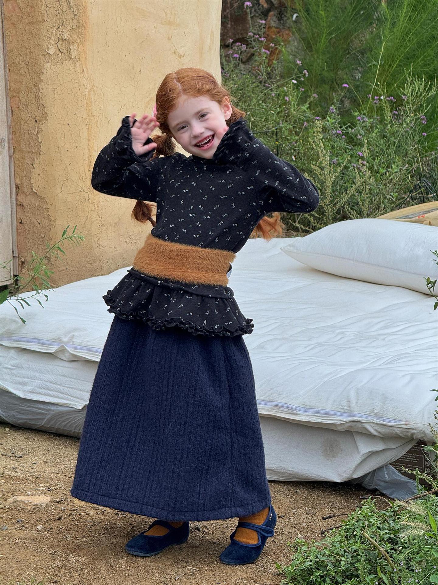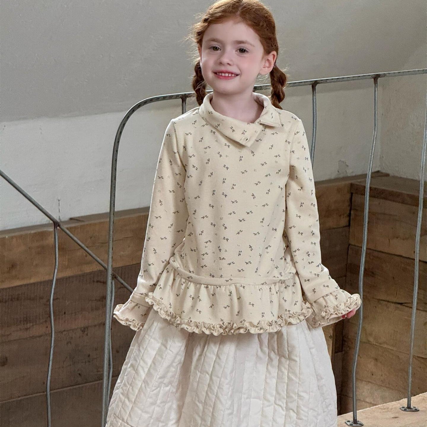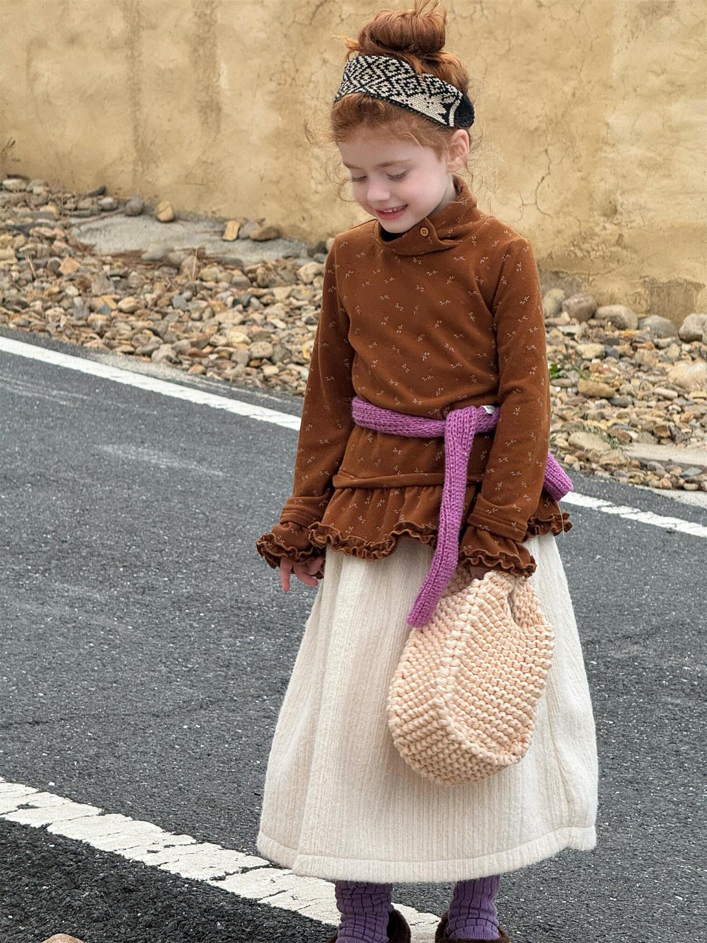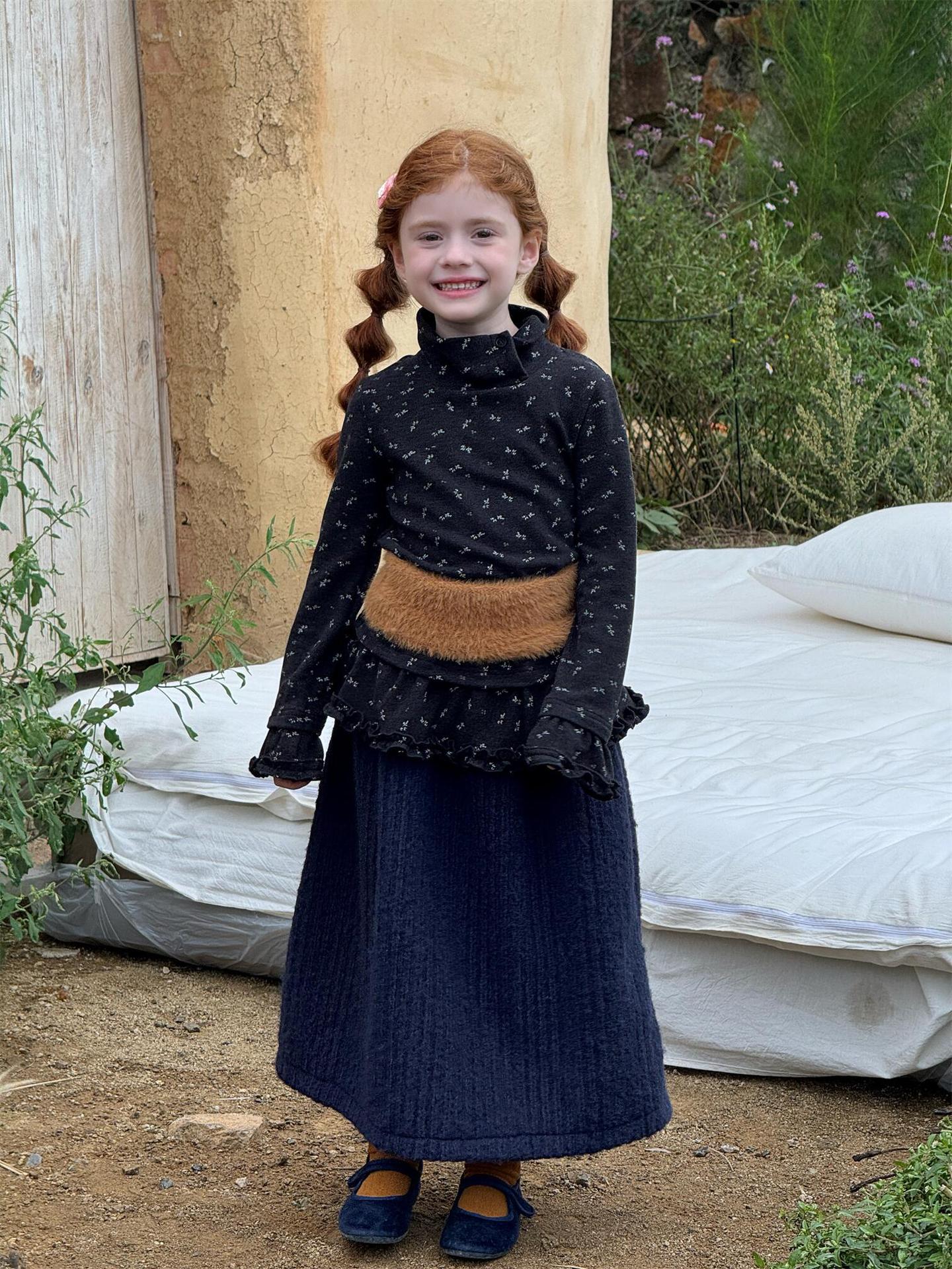 柔らかな肌触りでインナーとして活躍する長袖ハイネックTシャツは、全面にあしらわれた繊細な花柄が愛らしさを添えます。裾のフリルデザインがレイヤードスタイルに軽やかなアクセントを加え、上から重ねるトップスやワンピースとの組み合わせも楽しめます。内側は起毛素材で暖かく仕上げられたこのベースウェアは、寒い季節のコーディネートに欠かせない子ども服です。