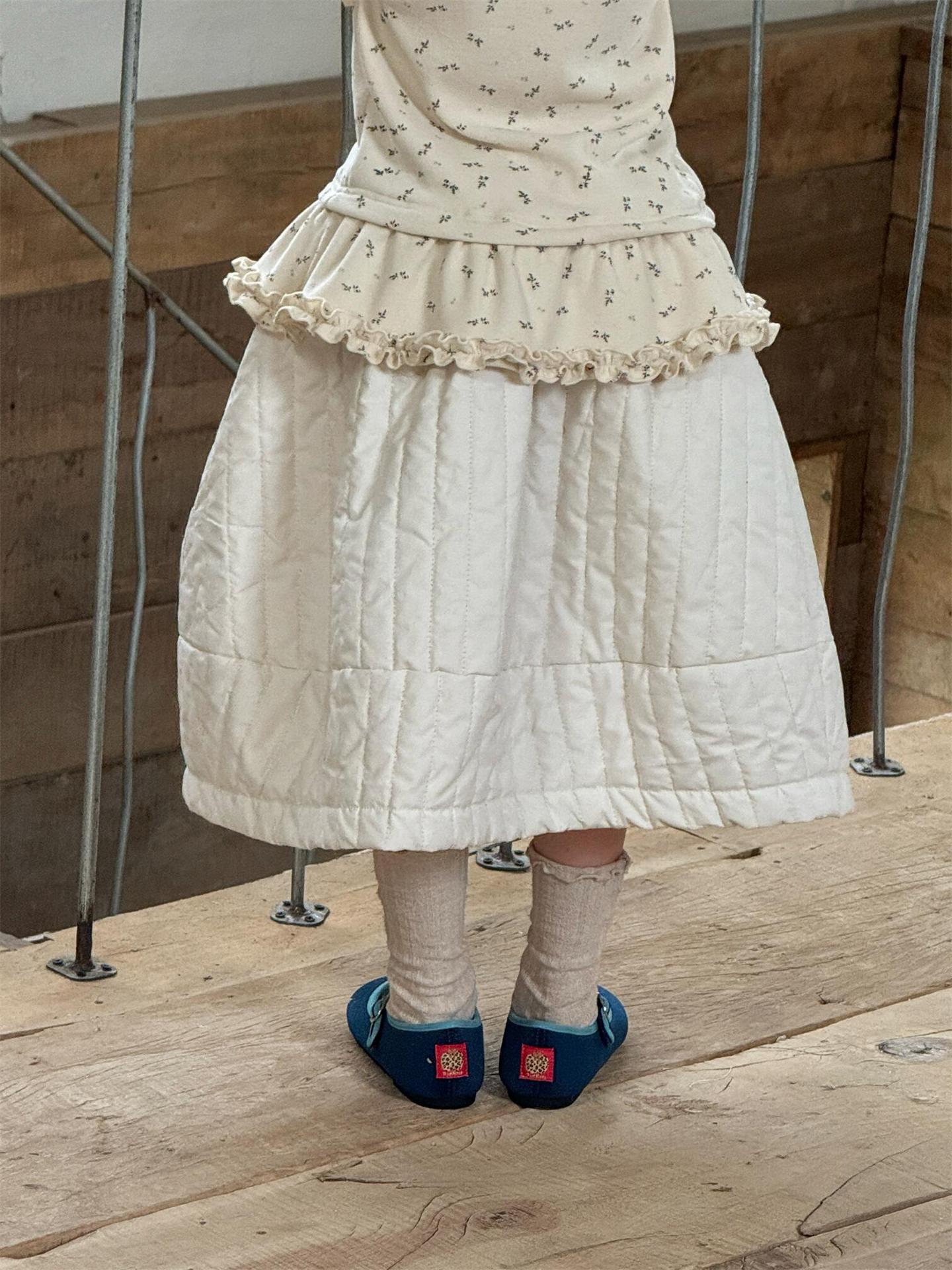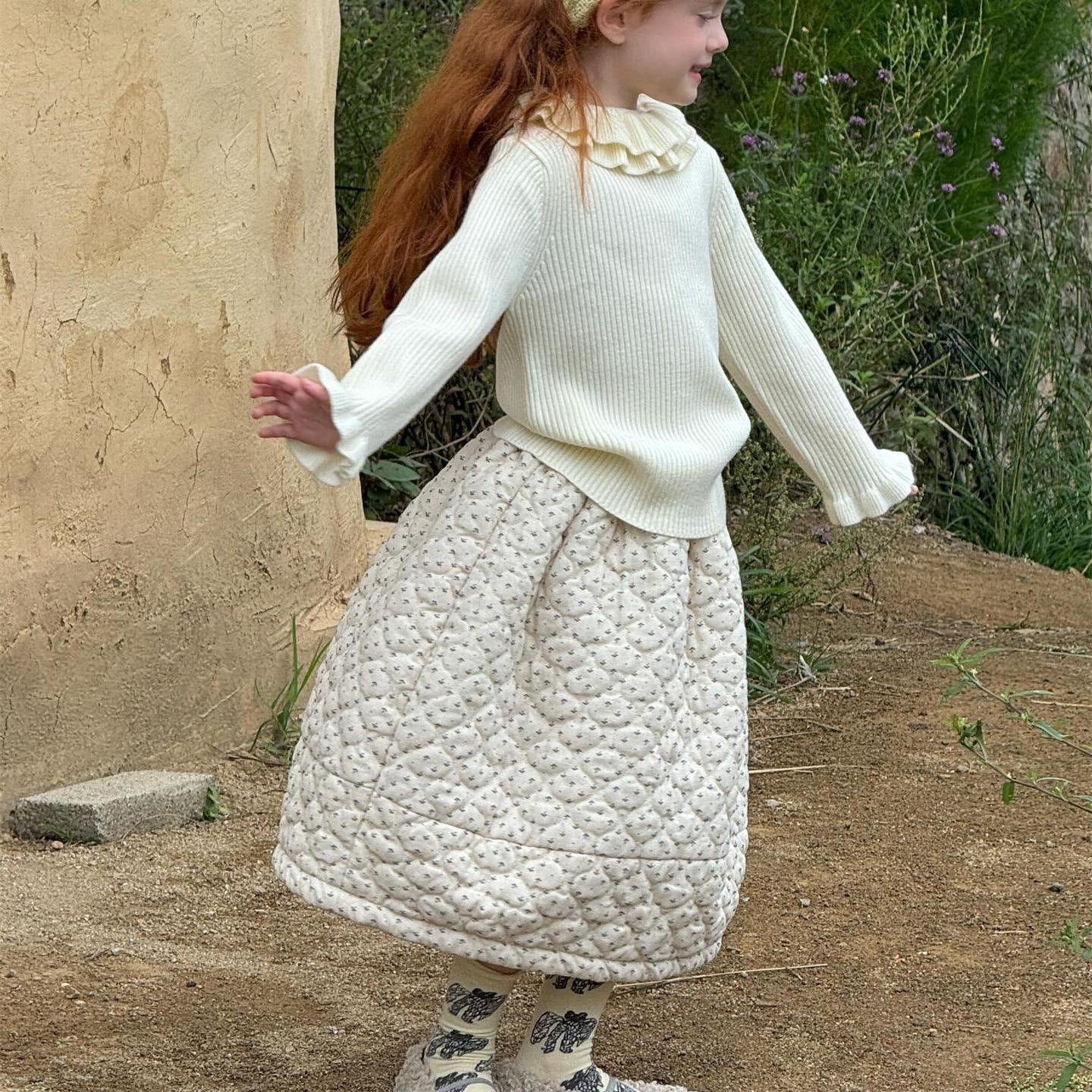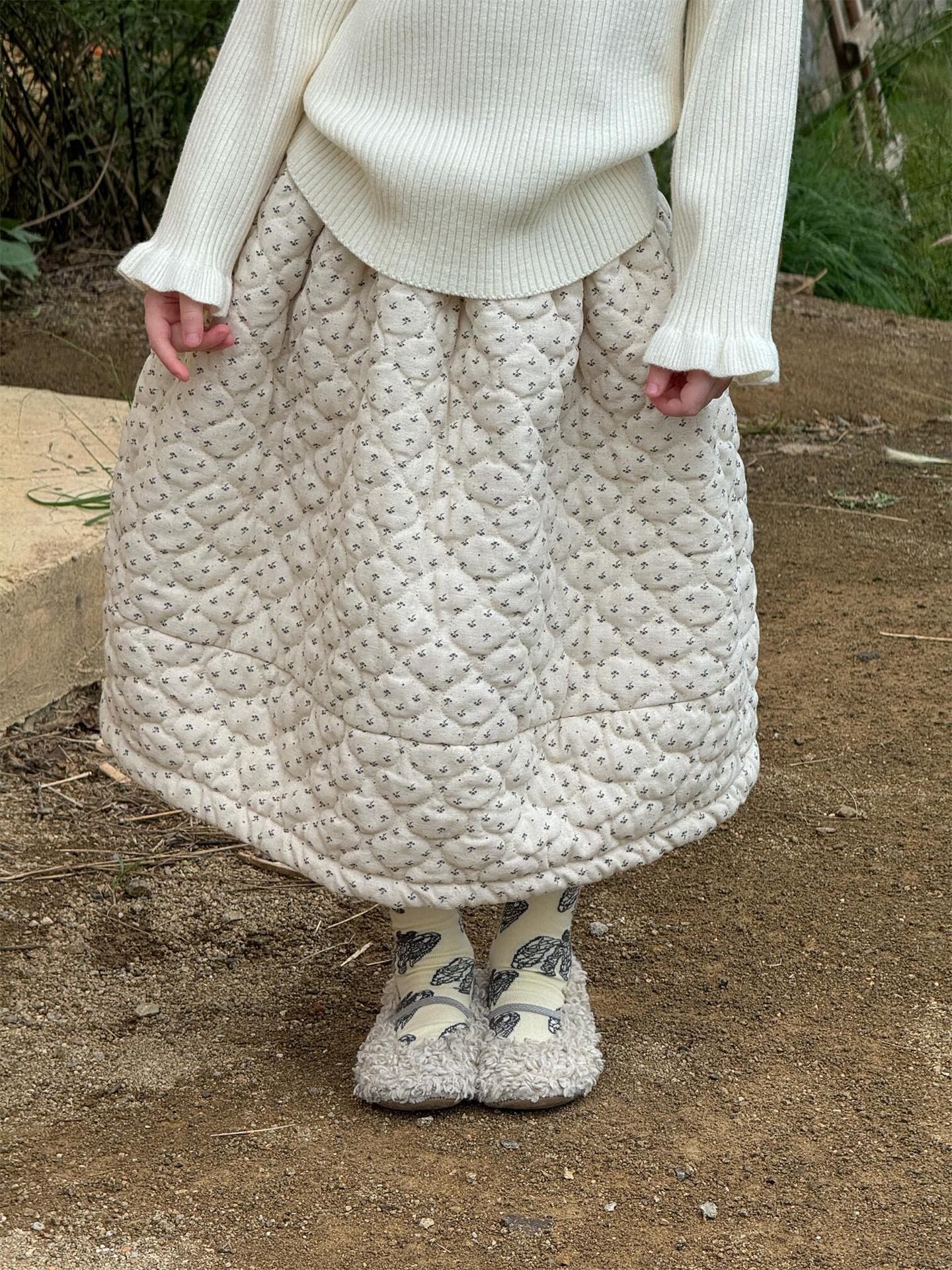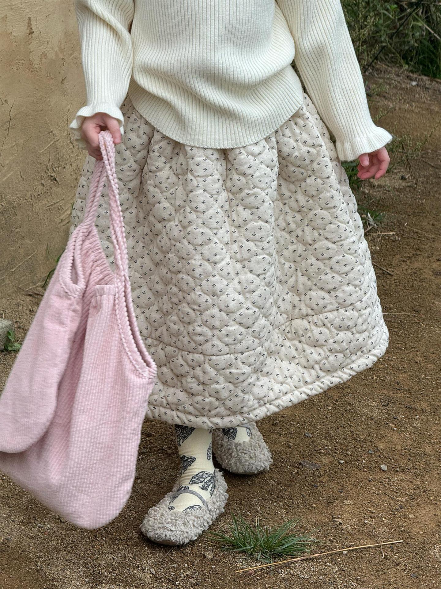 厚手のキルティング素材を使用したミモレ丈のスカートは、寒い季節にぴったりの暖かさと快適な着心地を提供します。シンプルな無地と華やかな花柄のバリエーションから選べるこのキルトスカートは、コーディネートの主役になる存在感があり、着こなしに深みを与えます。様々なトップスと相性が良く、おしゃれなスタイルを完成させる子ども服のボトムスとして活躍します。