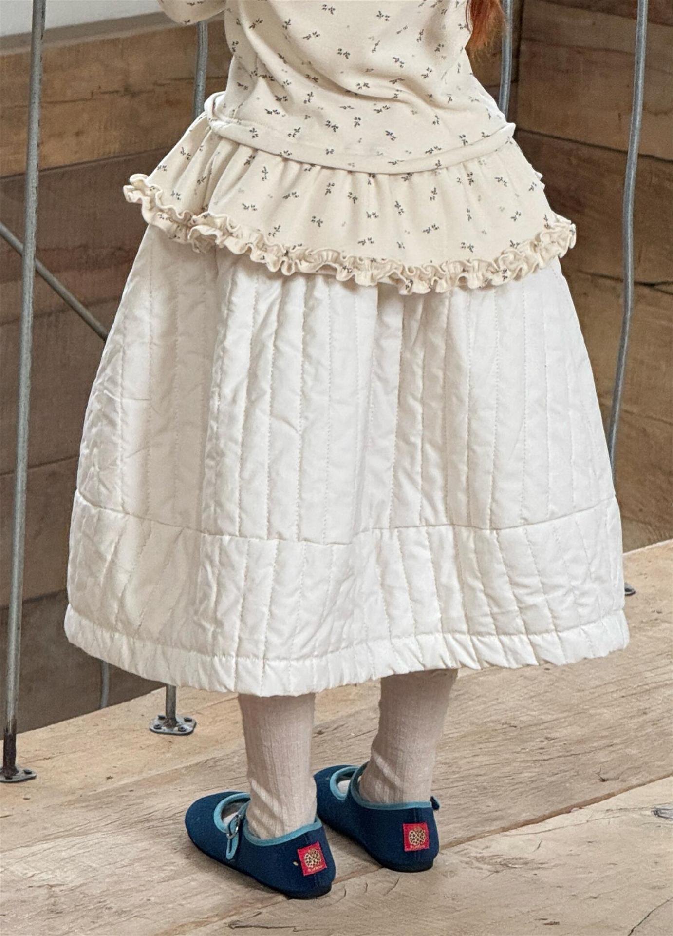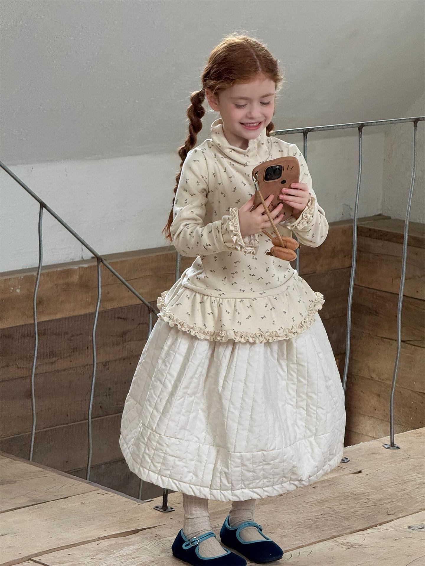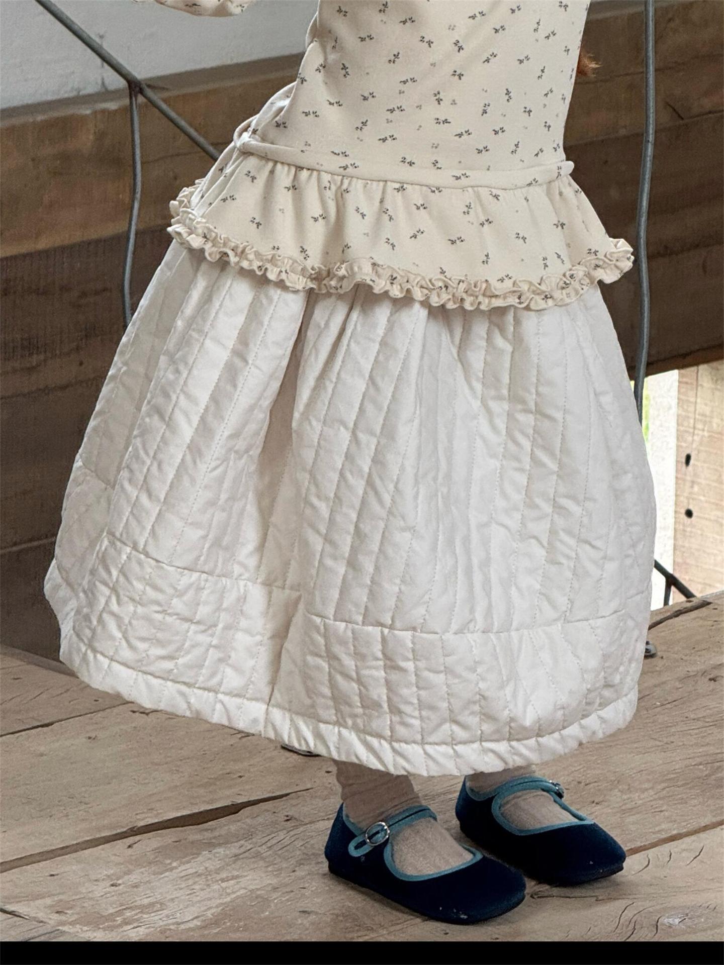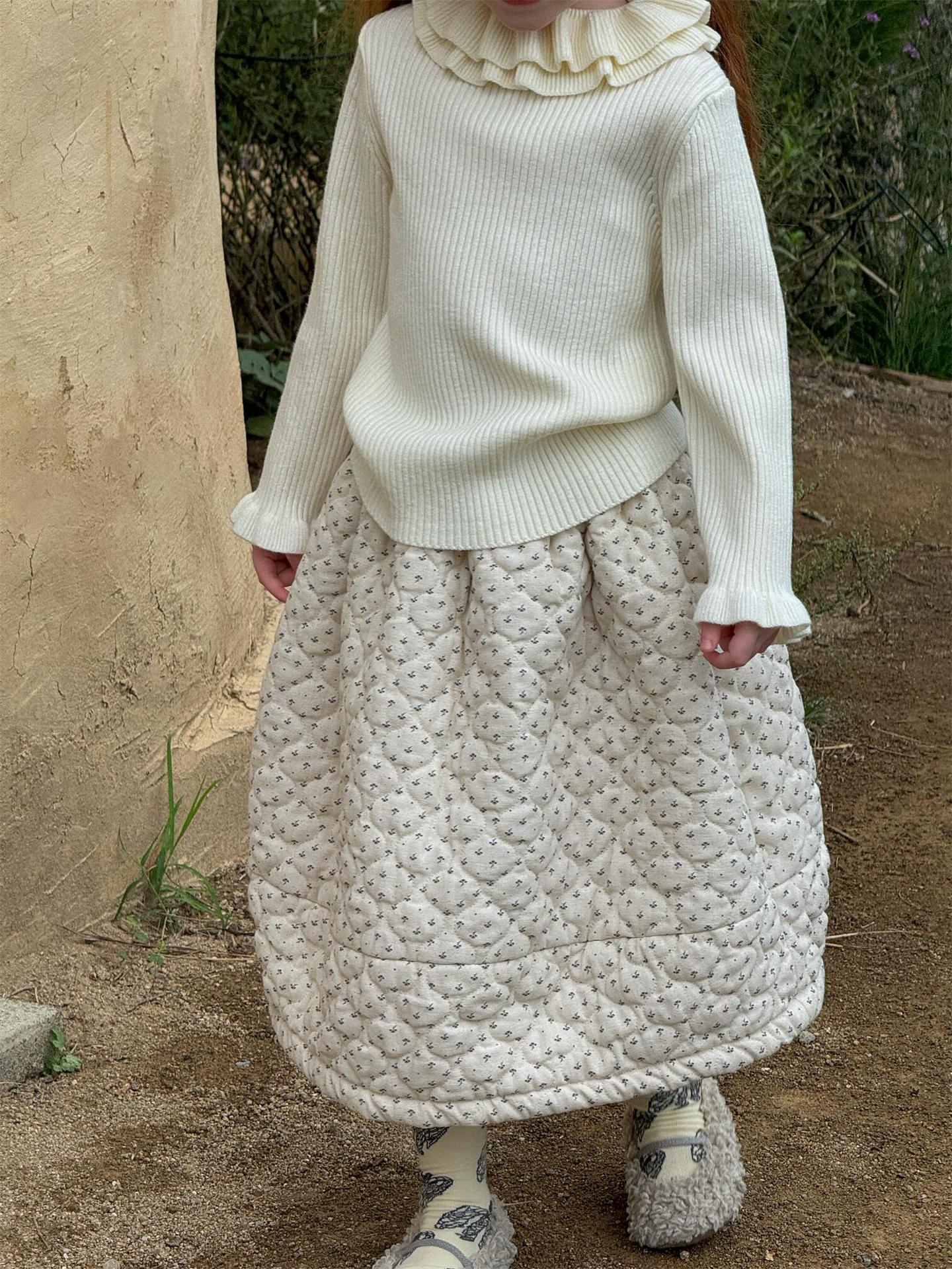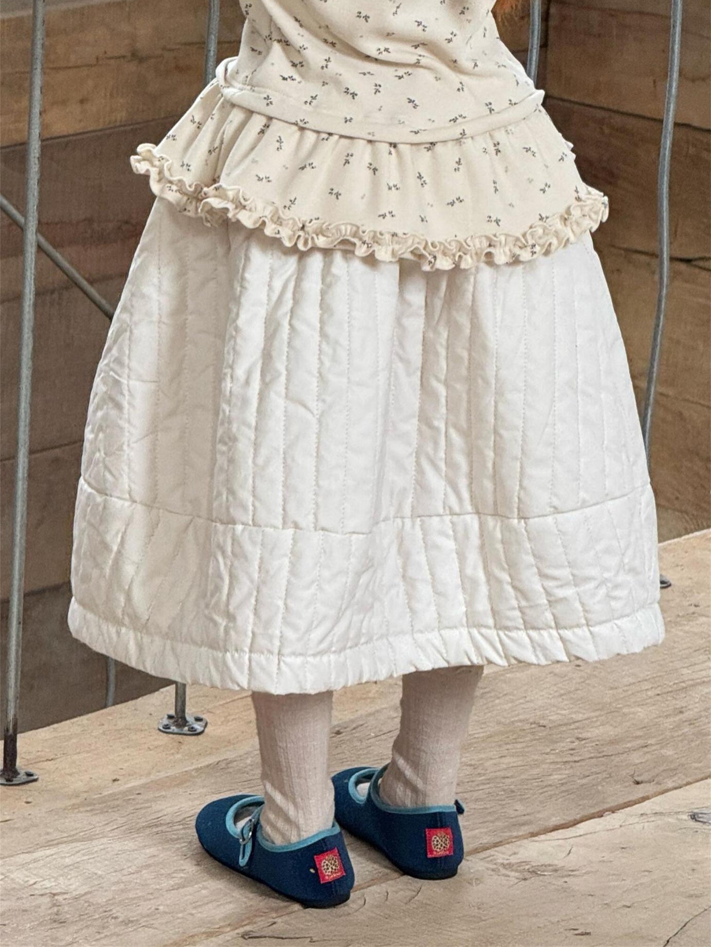 厚手のキルティング素材を使用したミモレ丈のスカートは、寒い季節にぴったりの暖かさと快適な着心地を提供します。シンプルな無地と華やかな花柄のバリエーションから選べるこのキルトスカートは、コーディネートの主役になる存在感があり、着こなしに深みを与えます。様々なトップスと相性が良く、おしゃれなスタイルを完成させる子ども服のボトムスとして活躍します。