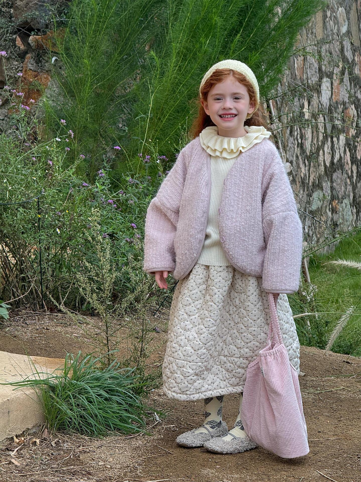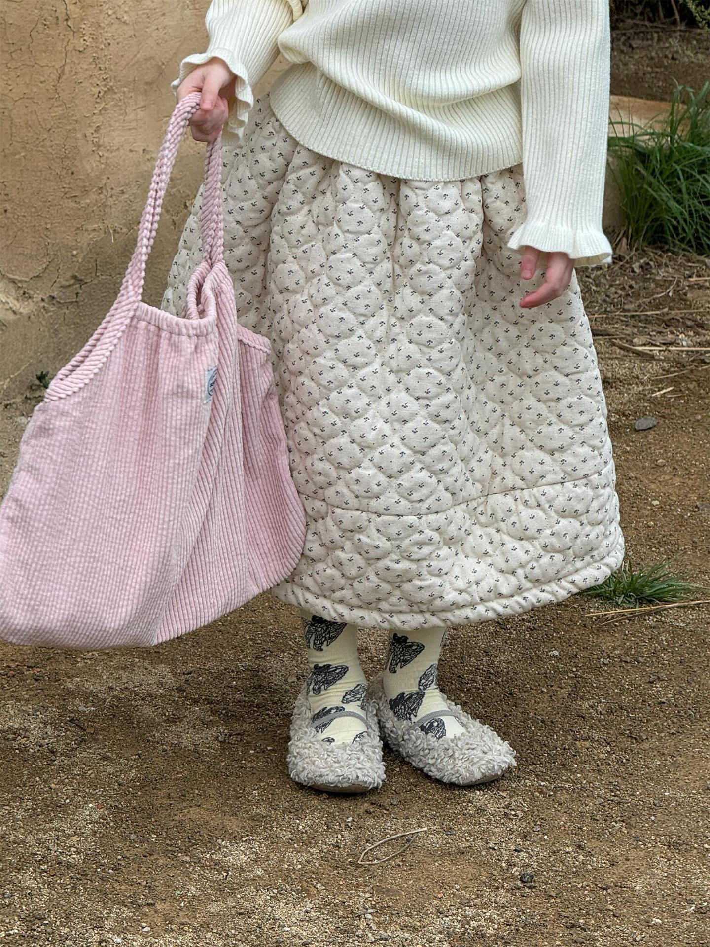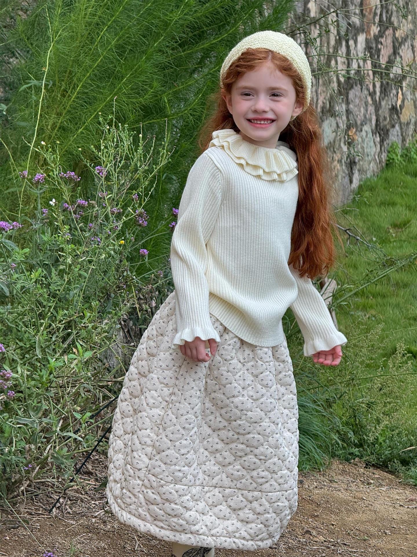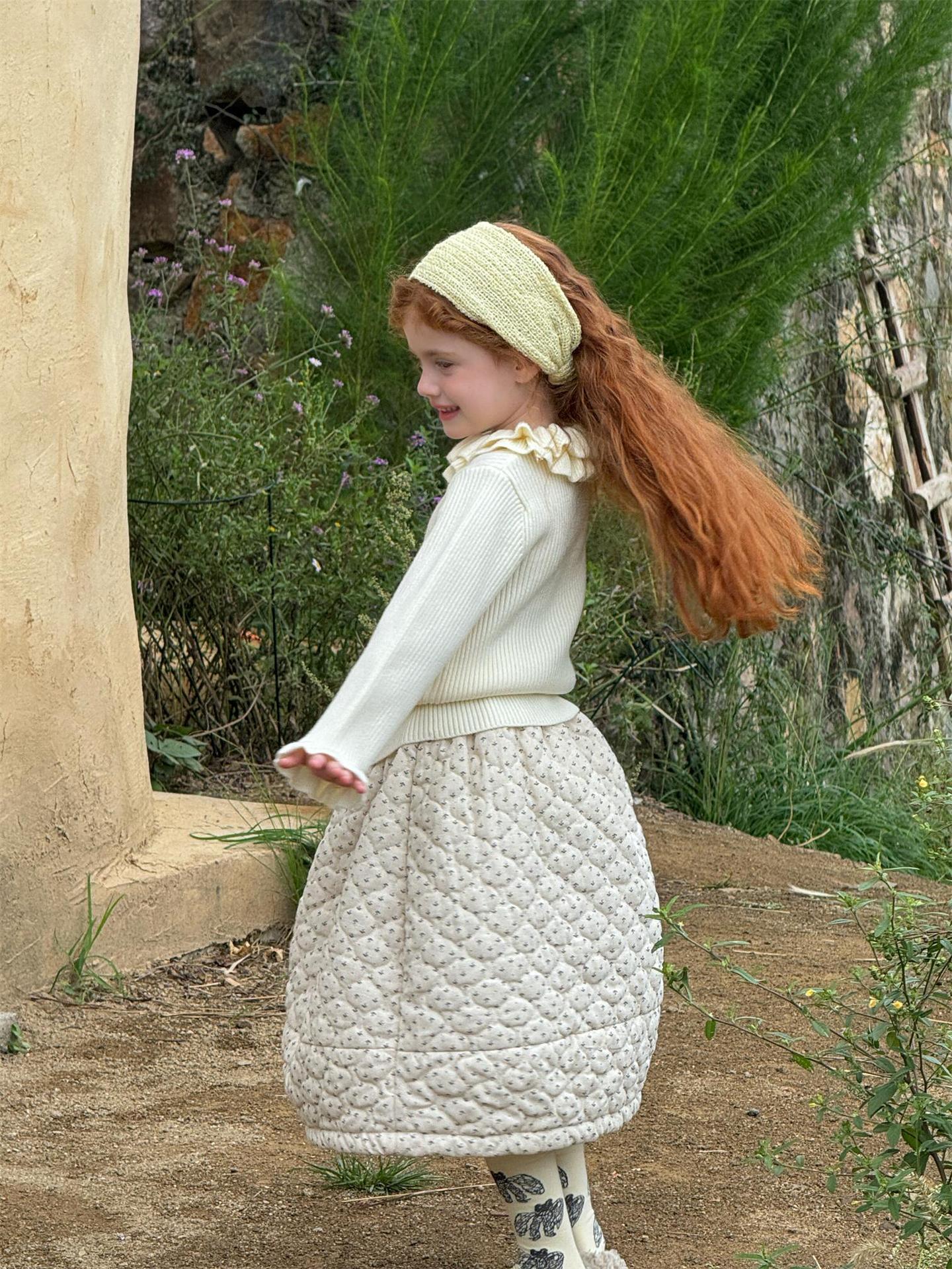 厚手のキルティング素材を使用したミモレ丈のスカートは、寒い季節にぴったりの暖かさと快適な着心地を提供します。シンプルな無地と華やかな花柄のバリエーションから選べるこのキルトスカートは、コーディネートの主役になる存在感があり、着こなしに深みを与えます。様々なトップスと相性が良く、おしゃれなスタイルを完成させる子ども服のボトムスとして活躍します。