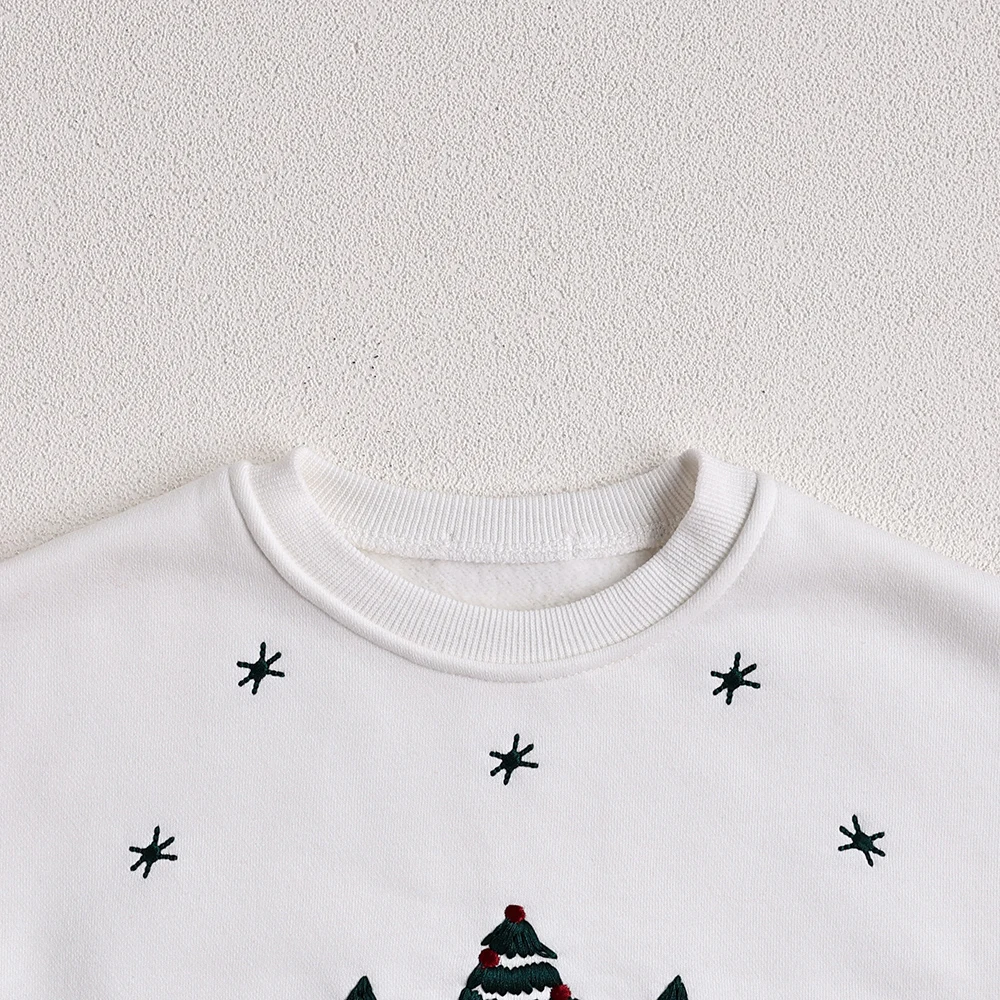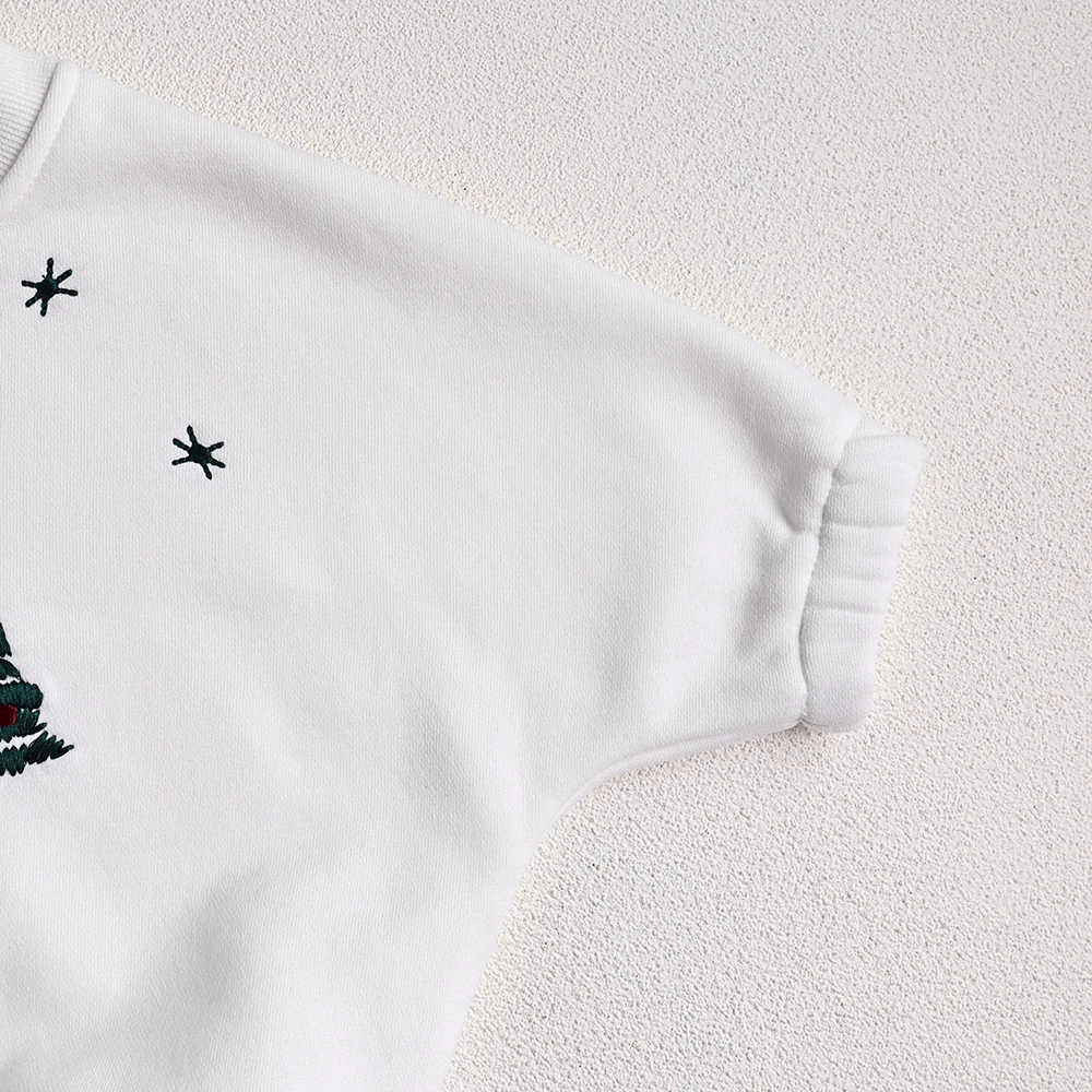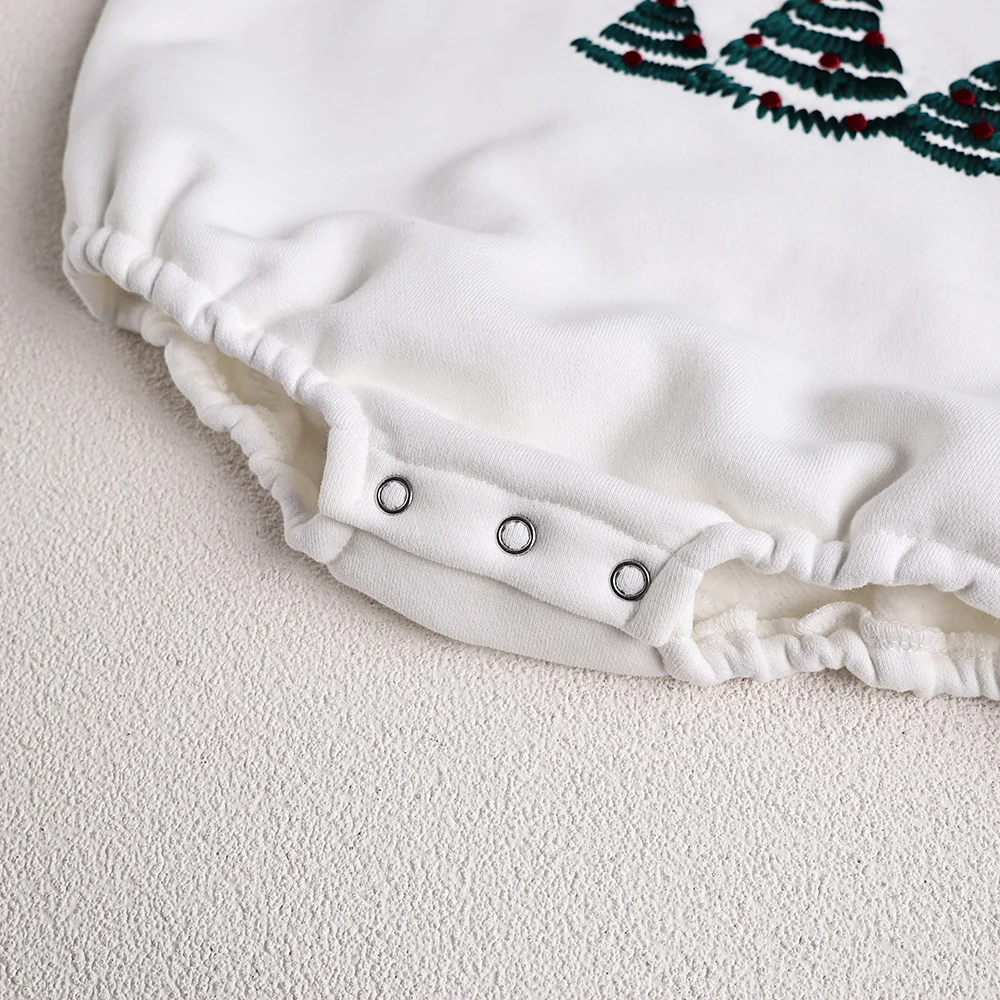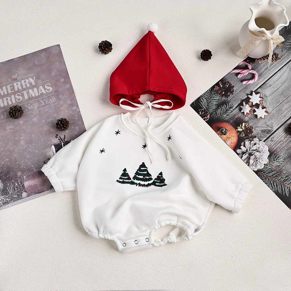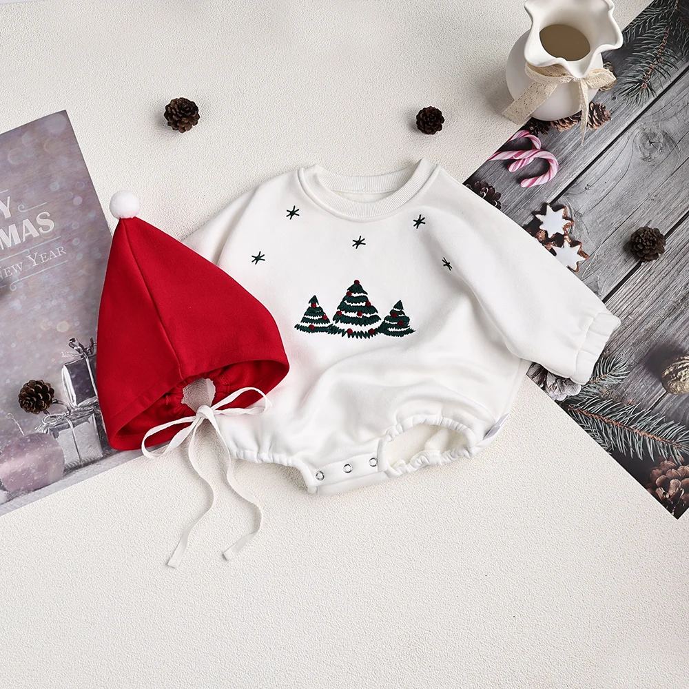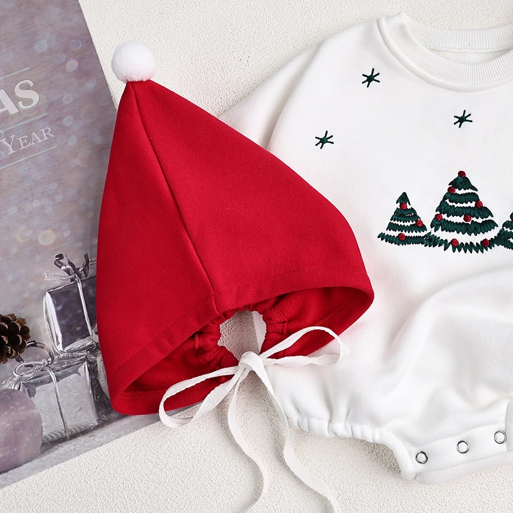 ベビー長袖ロンパース とんがり帽子セット クリスマス コスチューム 裏フリース もみの木 クリスマスツリープリント ホワイト ユニセックス 男の子 女の子 子供服