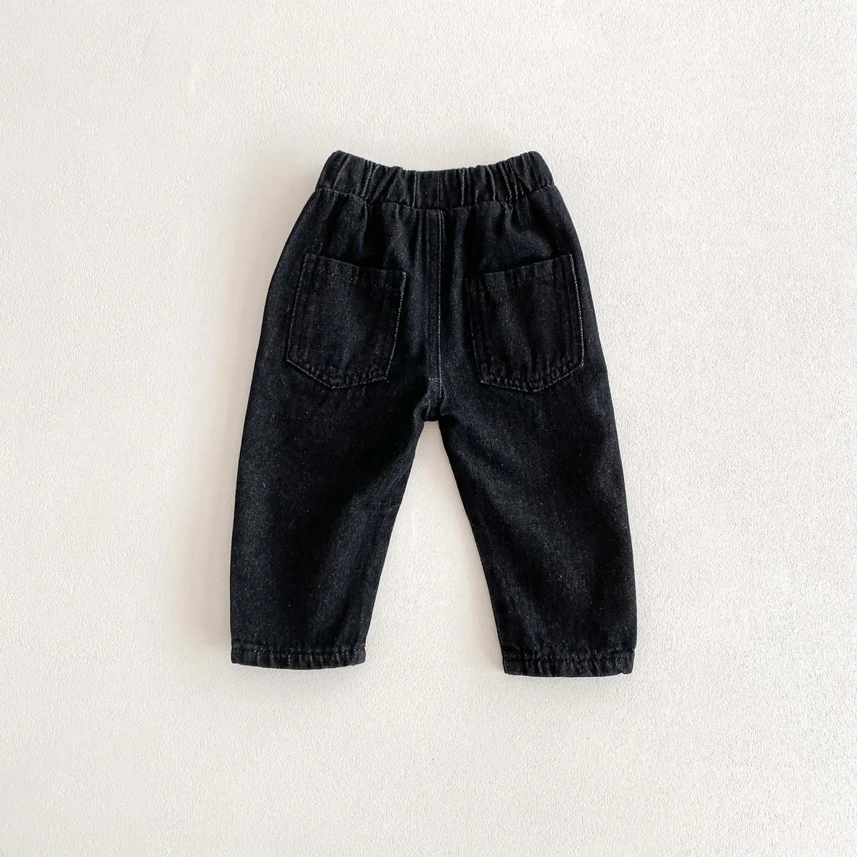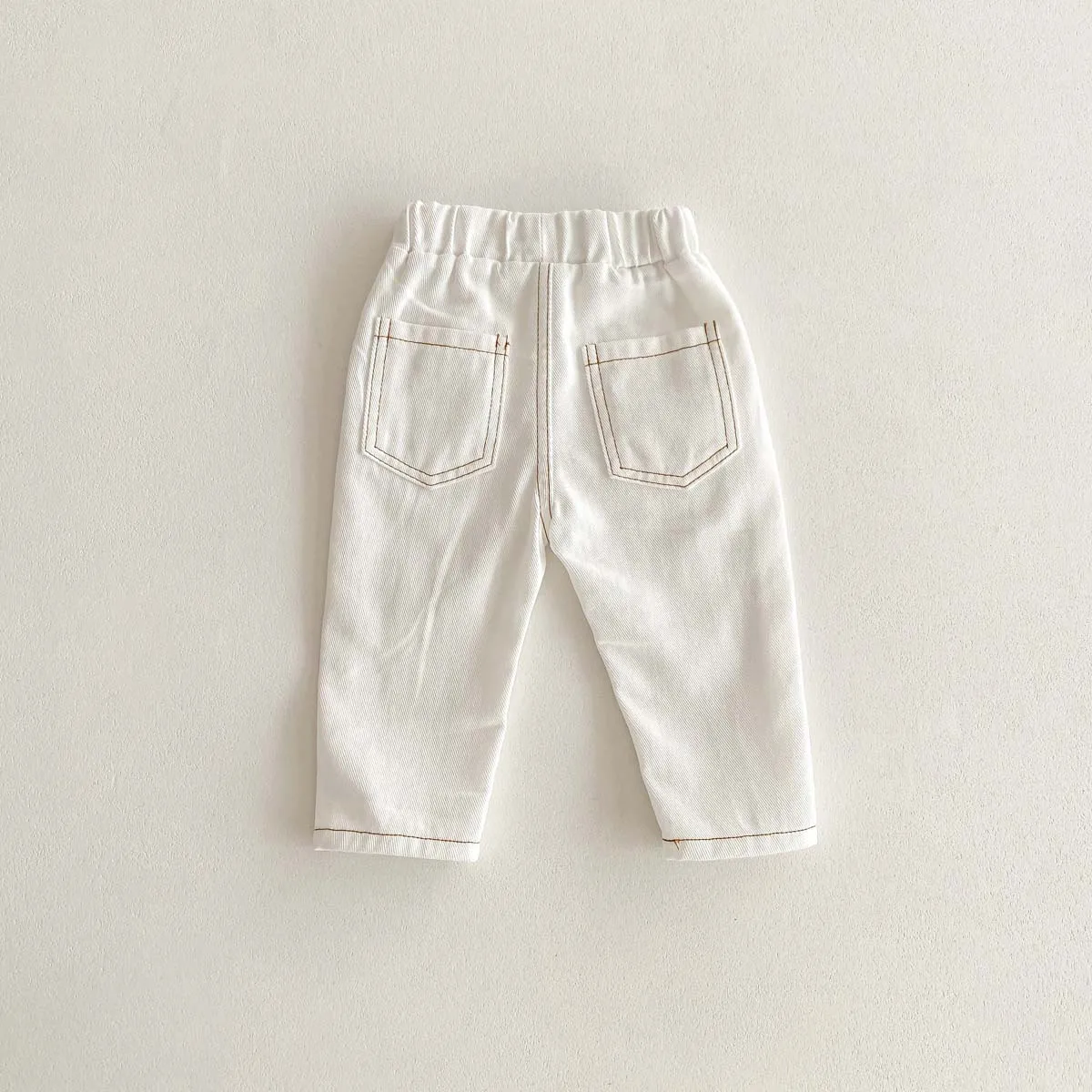 シンプルなデザインの子供用デニムパンツです。男の子にも女の子にも着せられ、幅広い年齢におすすめです。ブルー、ブラック、ホワイトの3種類から選べるので、お気に入りのカラーが選べます。ポケットが付いた、子供たちに優しいデザインになっています。シンプルながらも、どんなトップスとも合わせやすいので、子供たちの日常着としておすすめです。