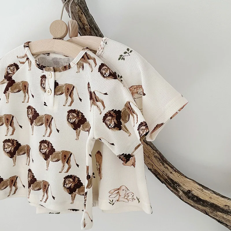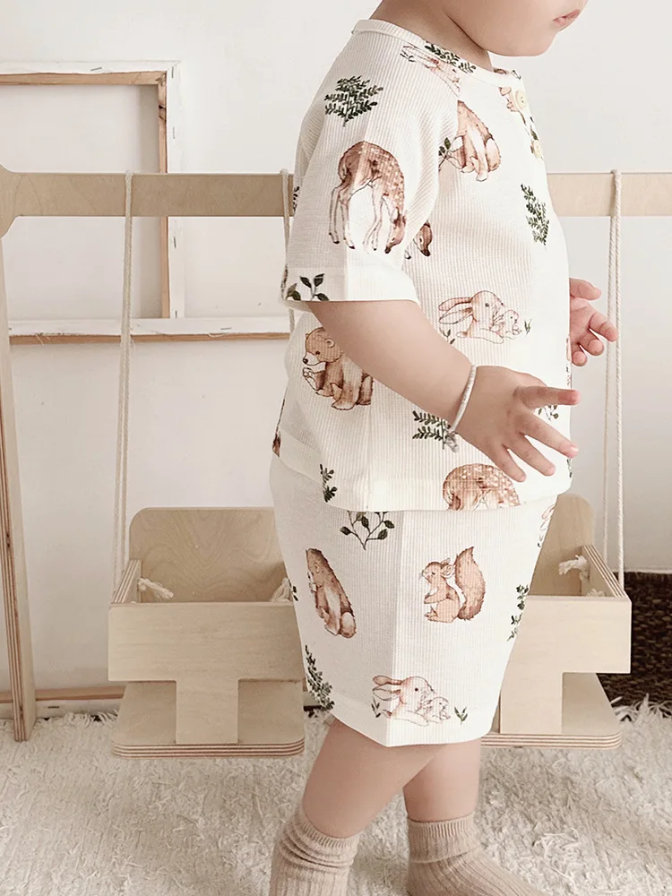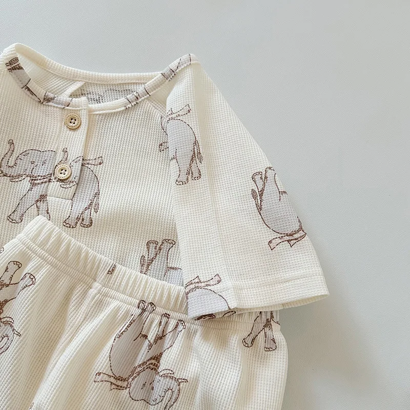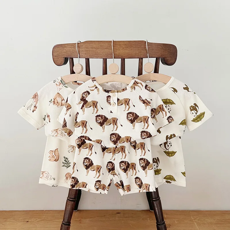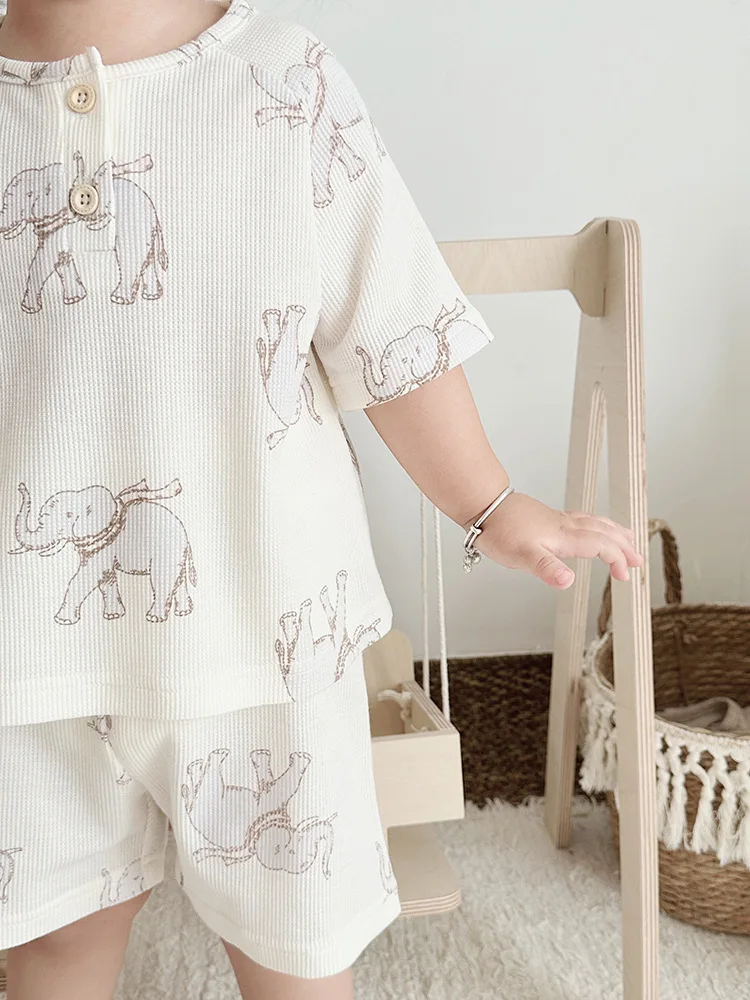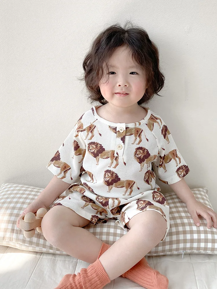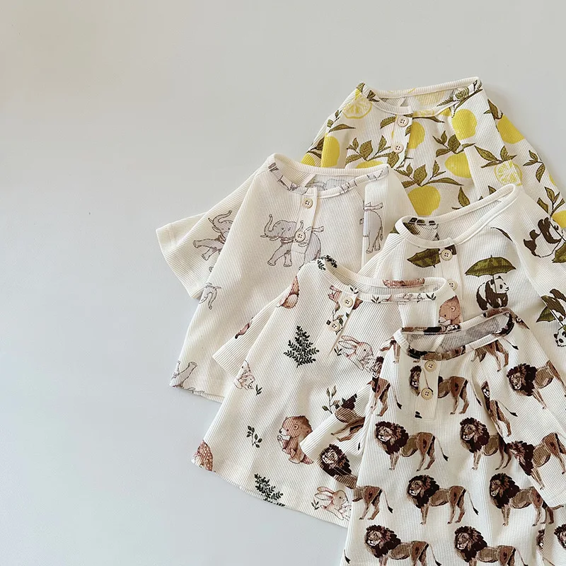 キッズパジャマセット ワッフル 半袖Tシャツ+ハーフパンツ アニマルプリント柄【mh0004594】