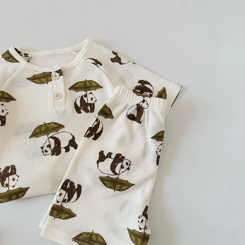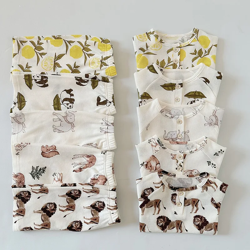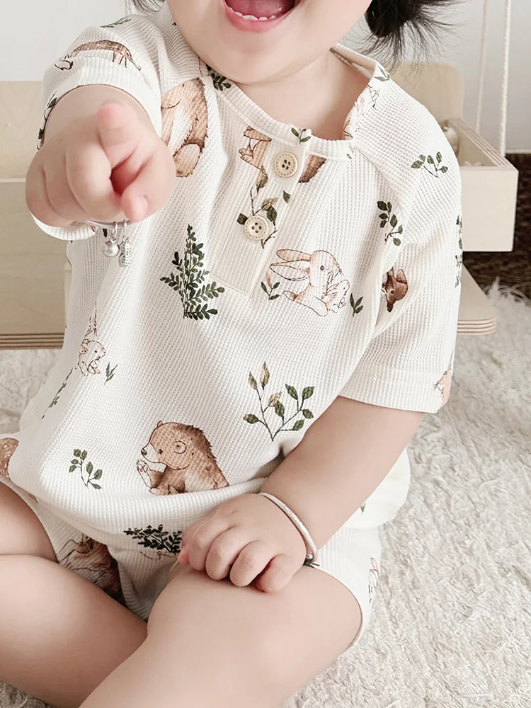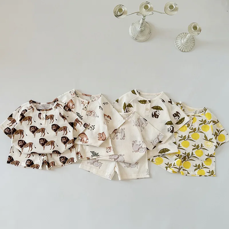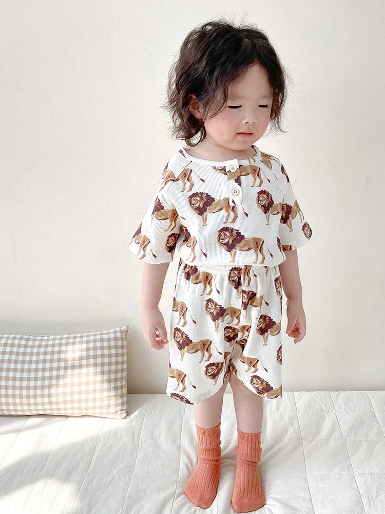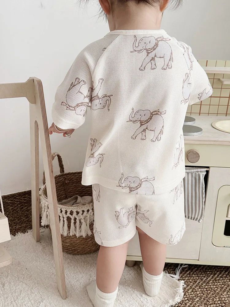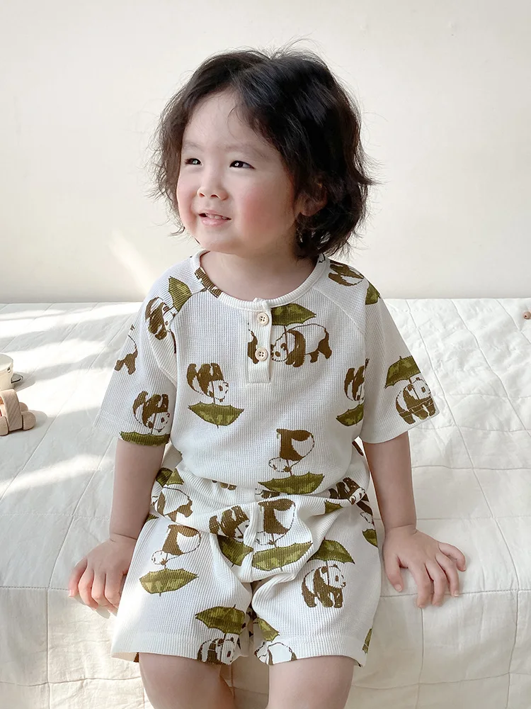 キッズパジャマセット ワッフル 半袖Tシャツ+ハーフパンツ アニマルプリント柄【mh0004594】