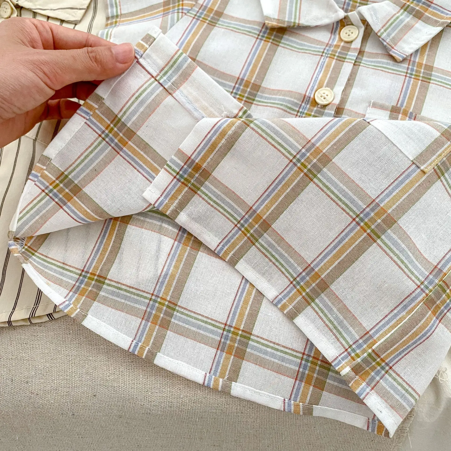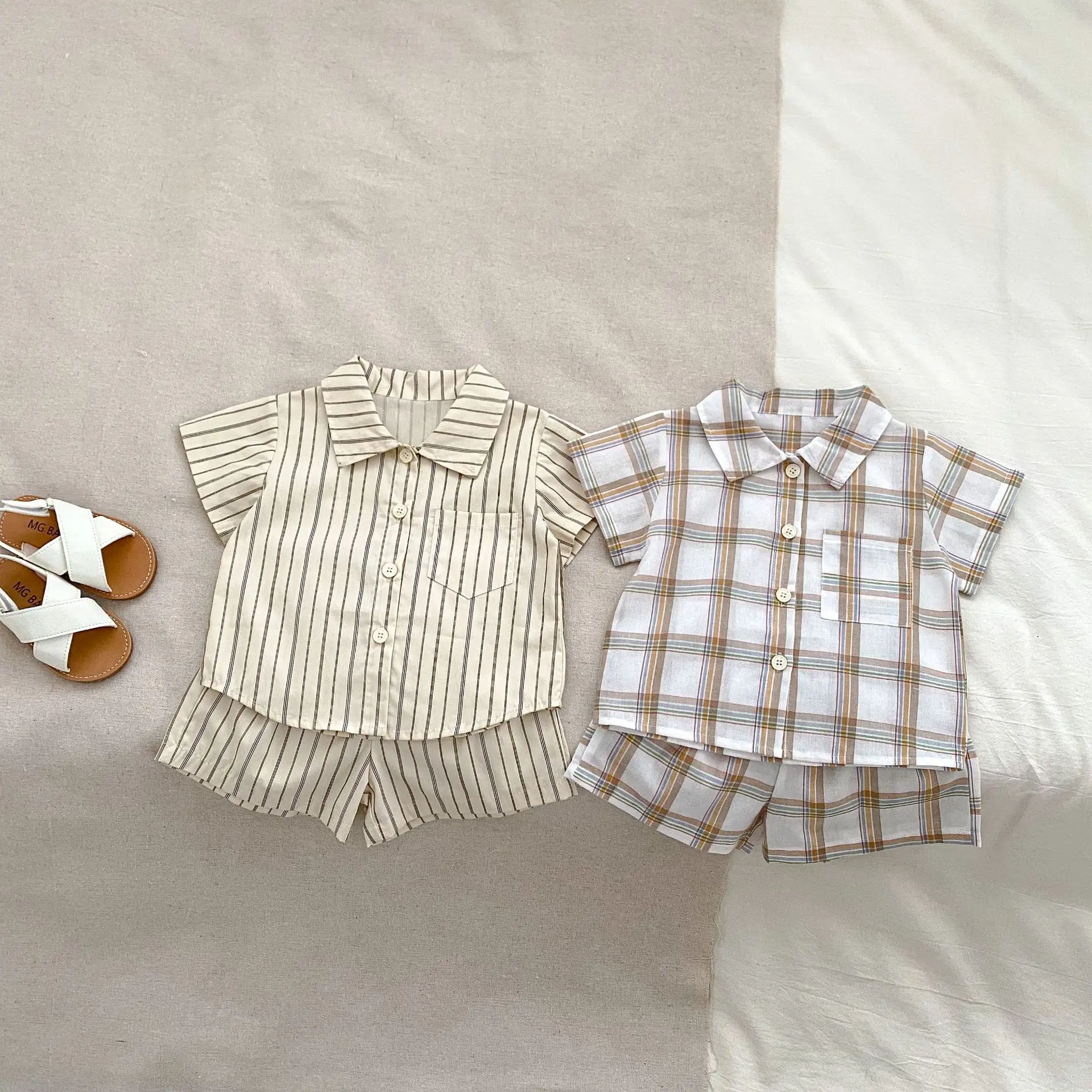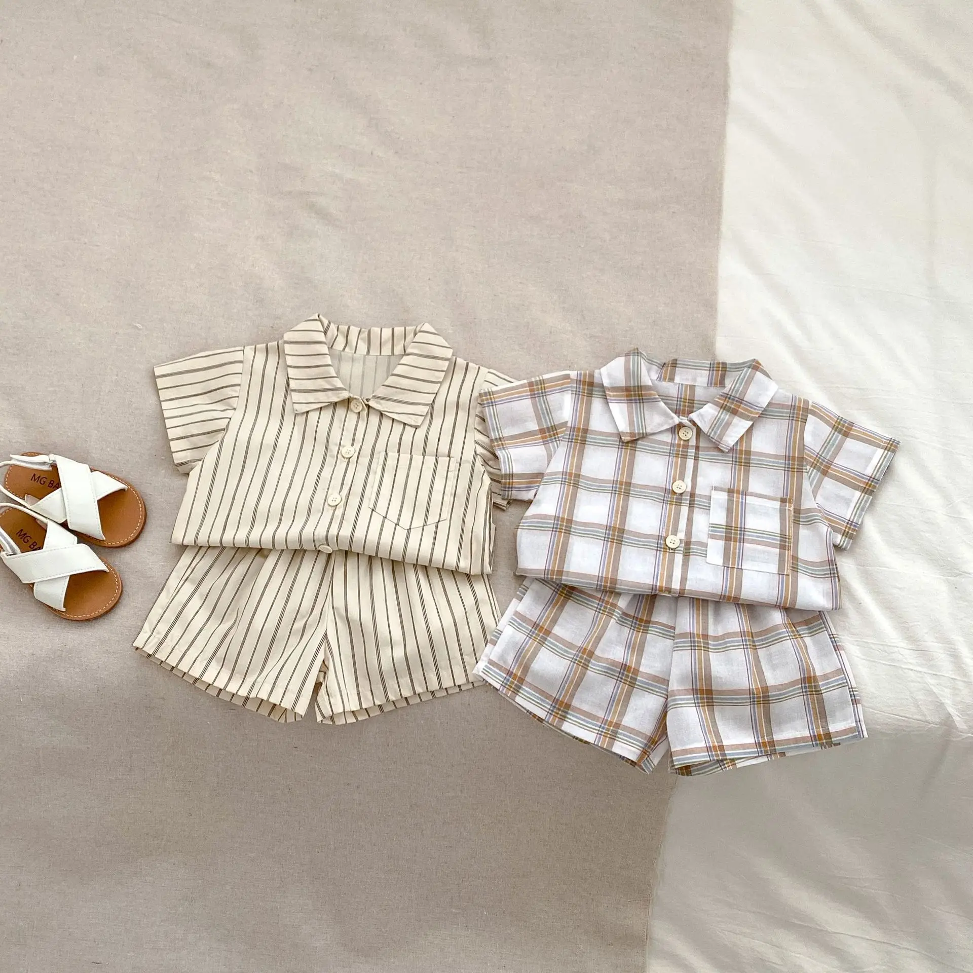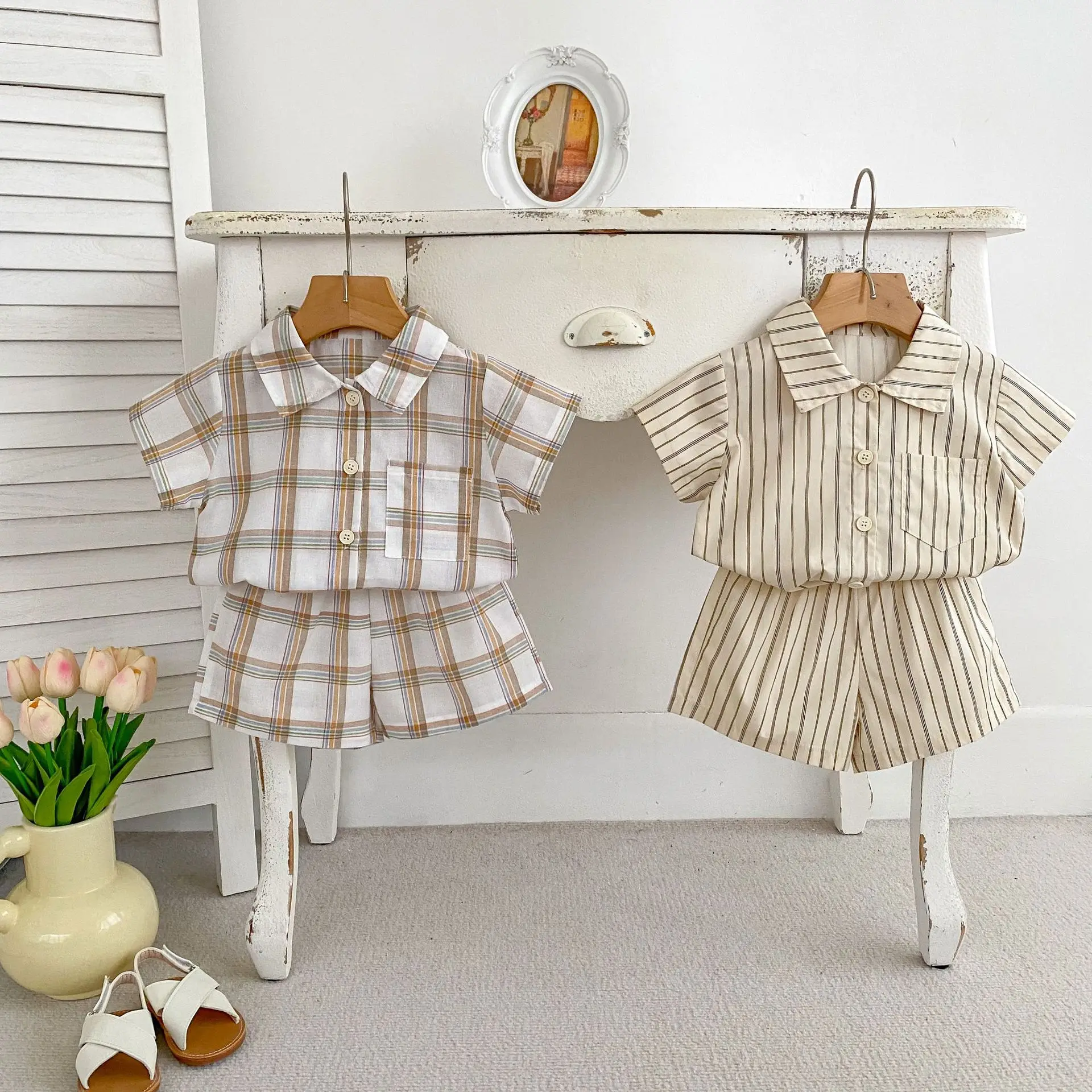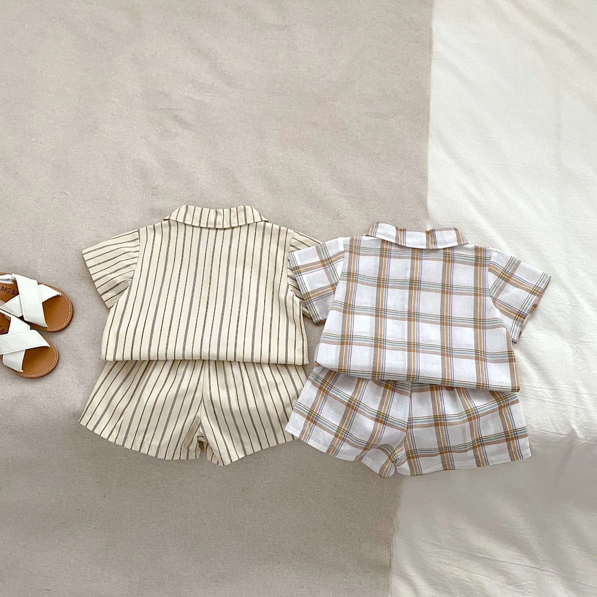 ベビーキッズセットアップ 2点セット 半袖シャツ+ショートパンツ ストライプ/レトロチェック【mh0005483】