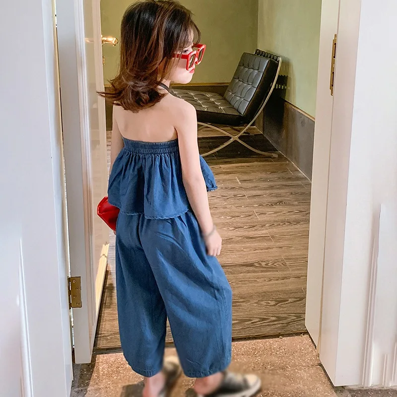 デニム素材のおしゃれなキッズセットアップ!夏の暑さを吹き飛ばすオフショルダートップスと、動きやすいルーズクロップドパンツの2点セットです。3-8歳の女の子にピッタリのデザインで、お洒落な着こなしを叶えます。涼しく、可愛く、おしゃれなアイテムです。