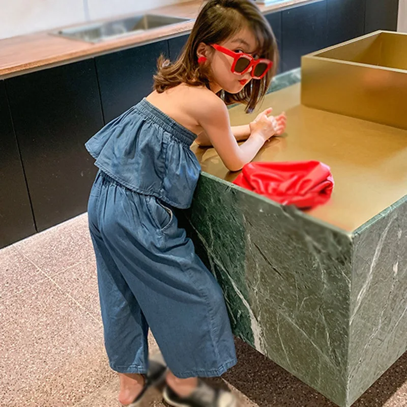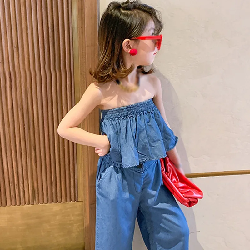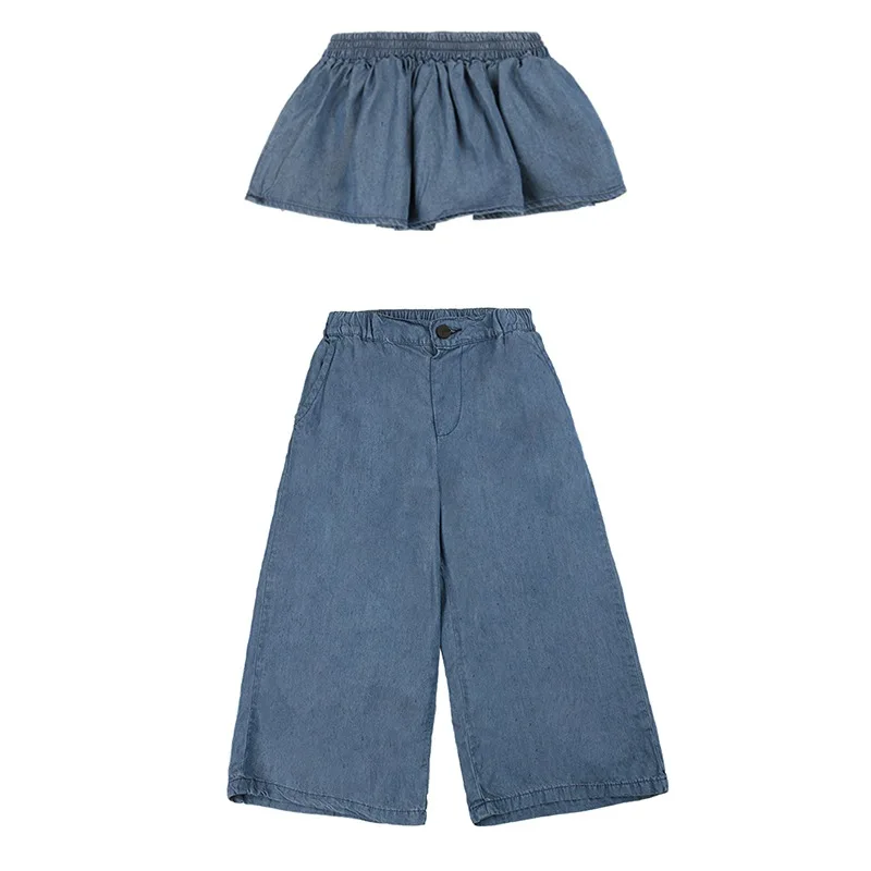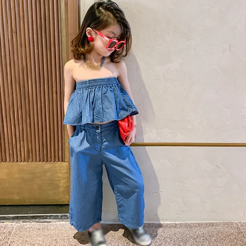 キッズセットアップ 2点セット デニム オフショルダートップス+ルーズクロップドパンツ【mh0005758】