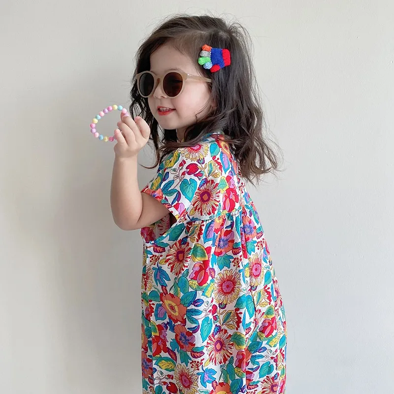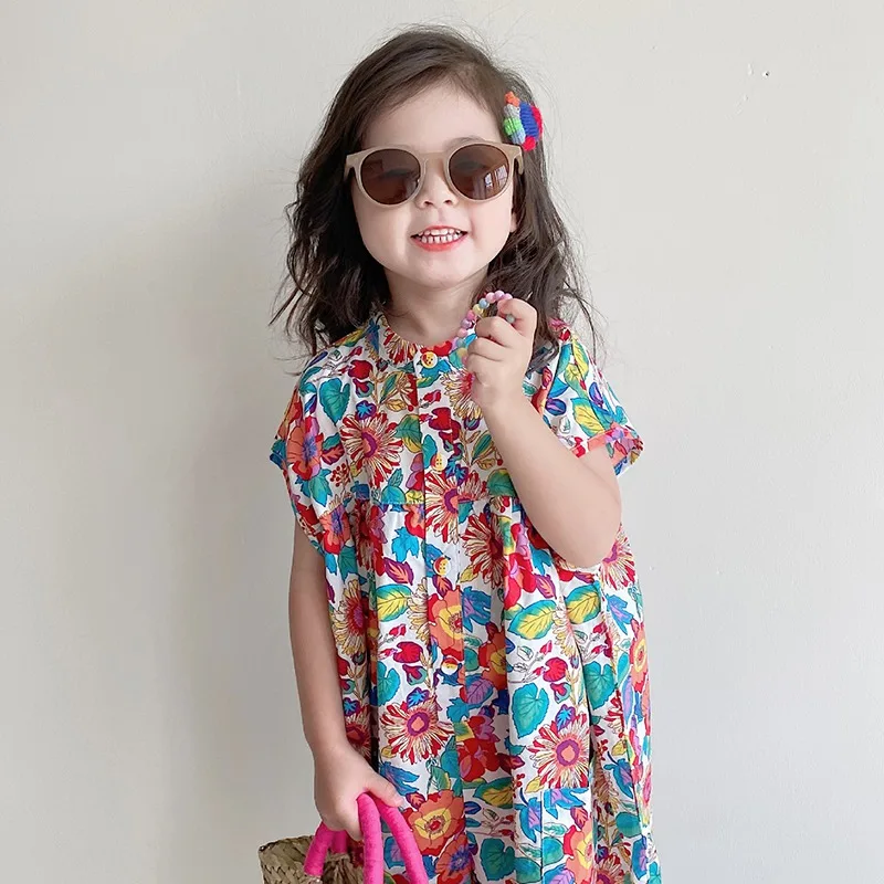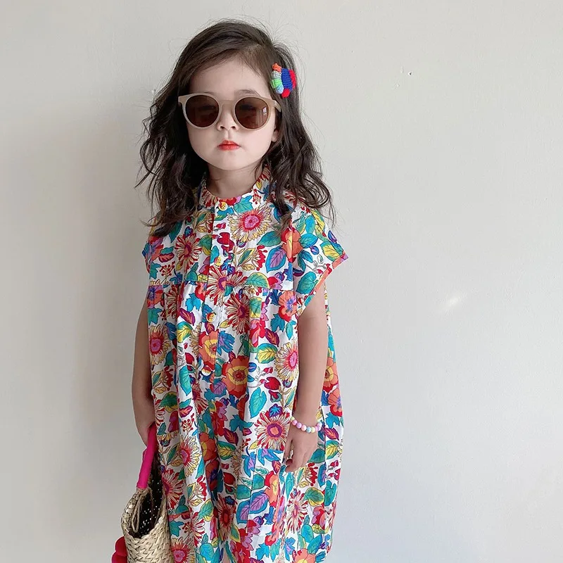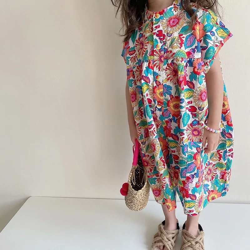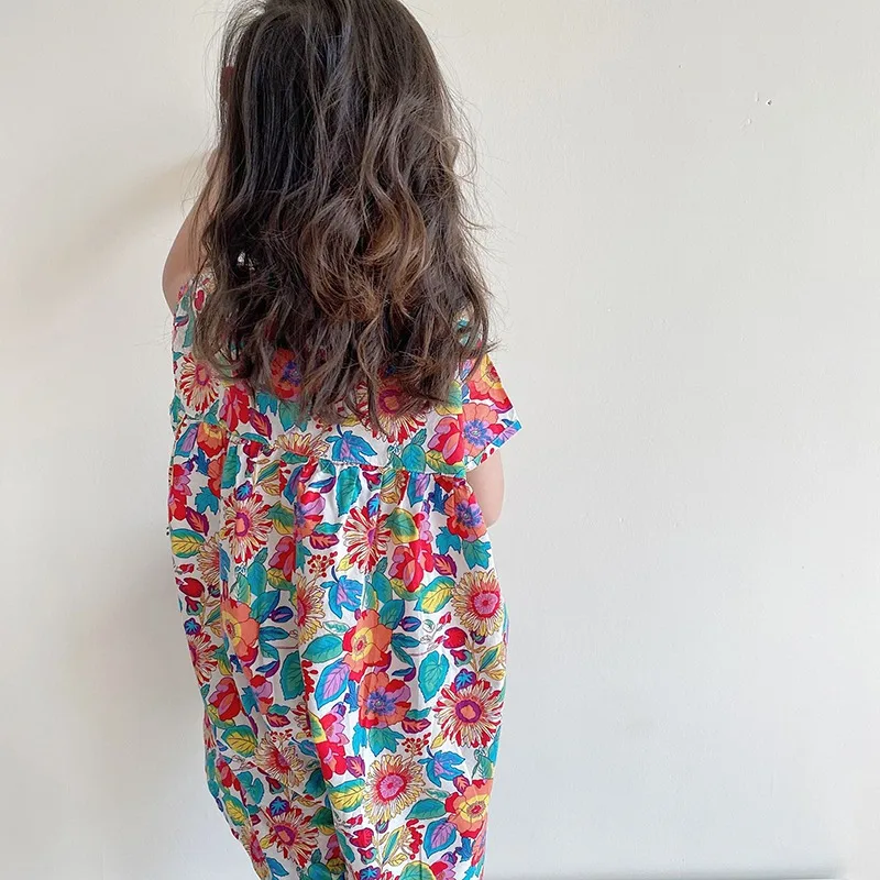 このキッズジャンプスー」は、夏の女の子のお洒落を叶えるアイテムです。きれいなフラワー花柄のプリントが可愛らしく、ショートスリーブのワイドレッグデザインで動きやすさも抜群。休日やイベントで活躍すること間違いなしの一着です。