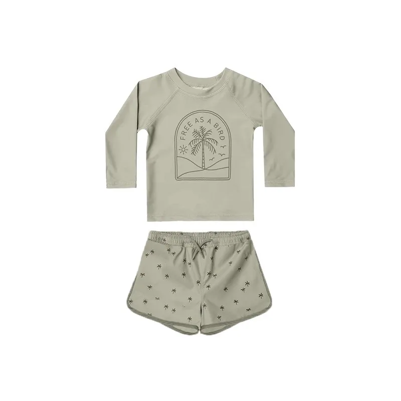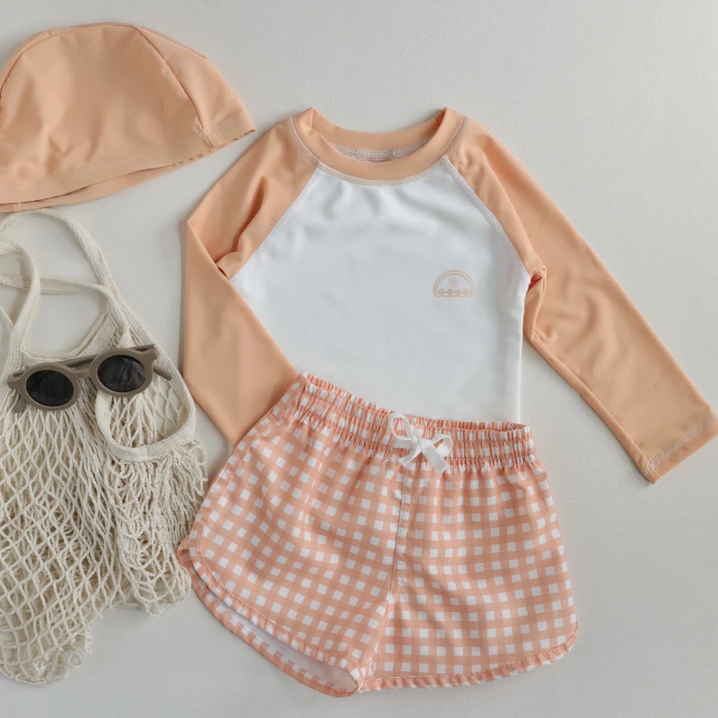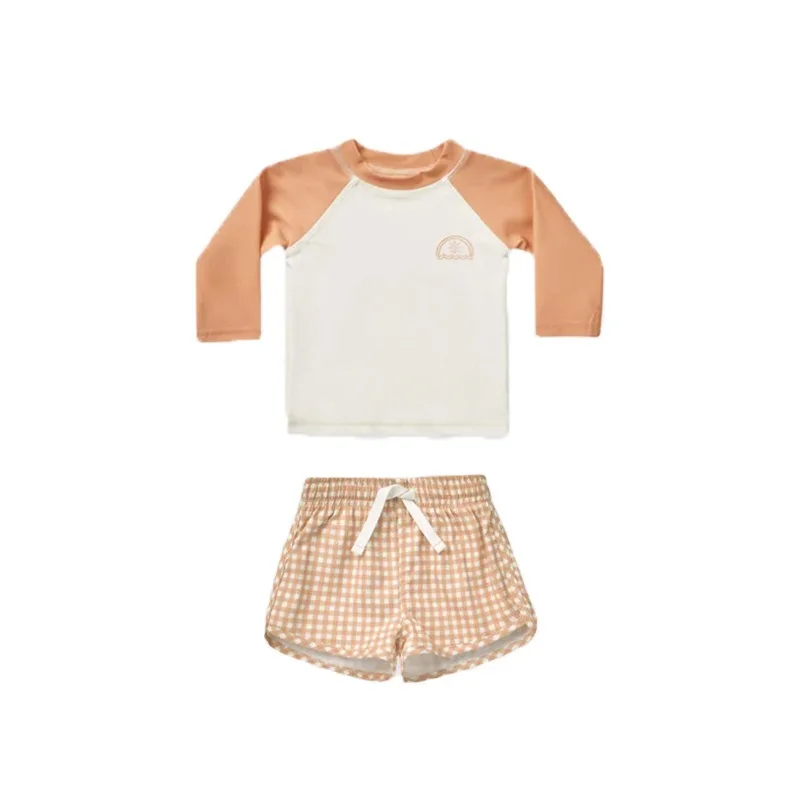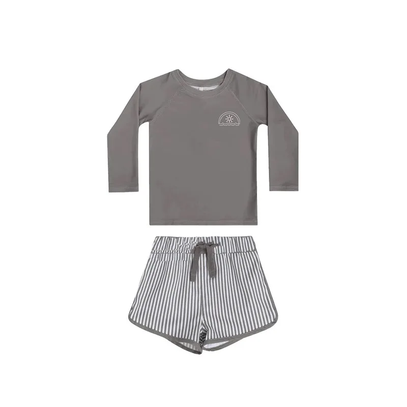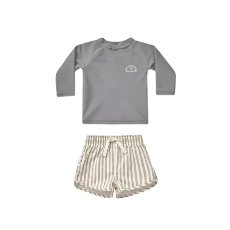 キッズ水着 ボーイズ 長袖 セパレート トップス+パンツ ストライプ/チェック スイムウェア【mh0005994】