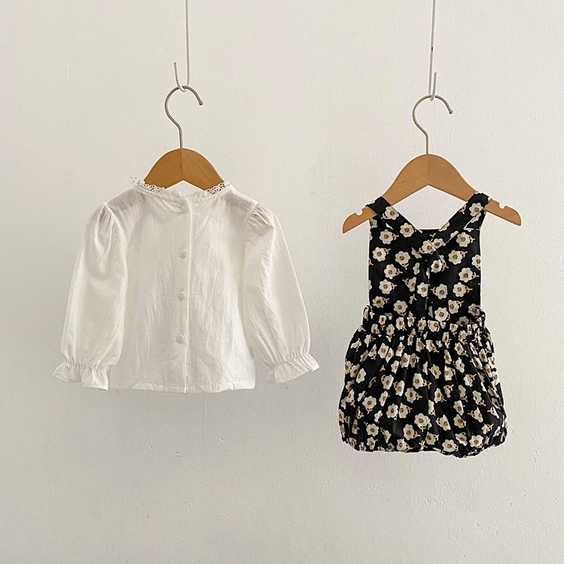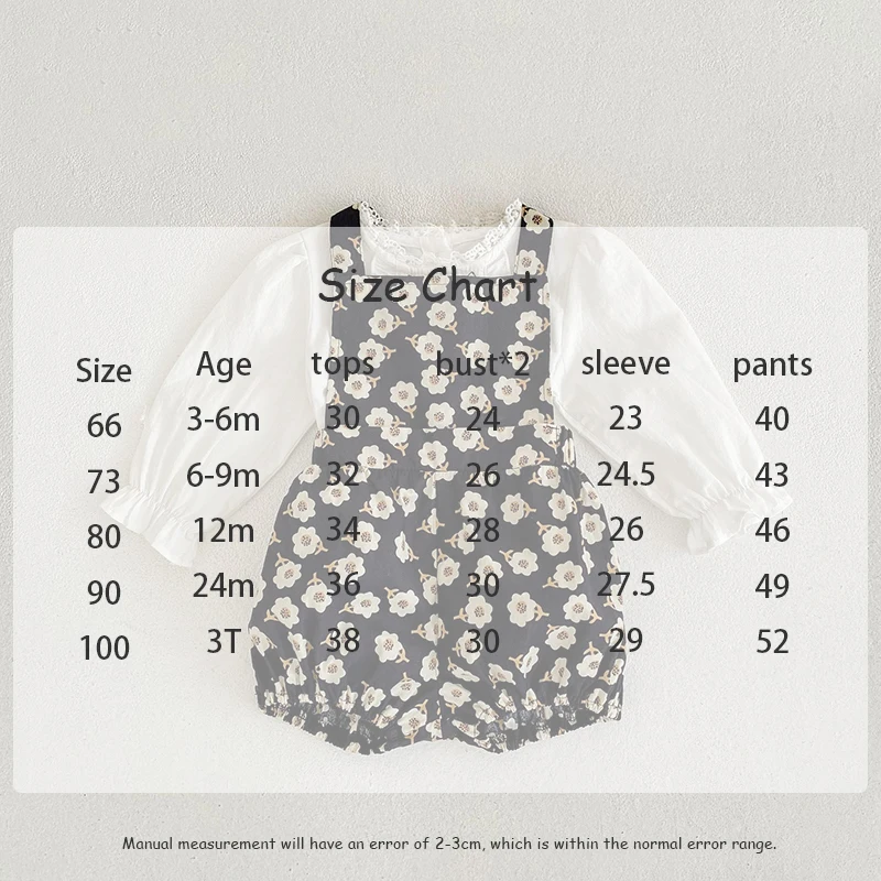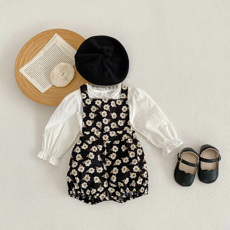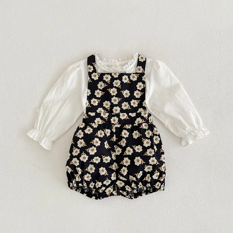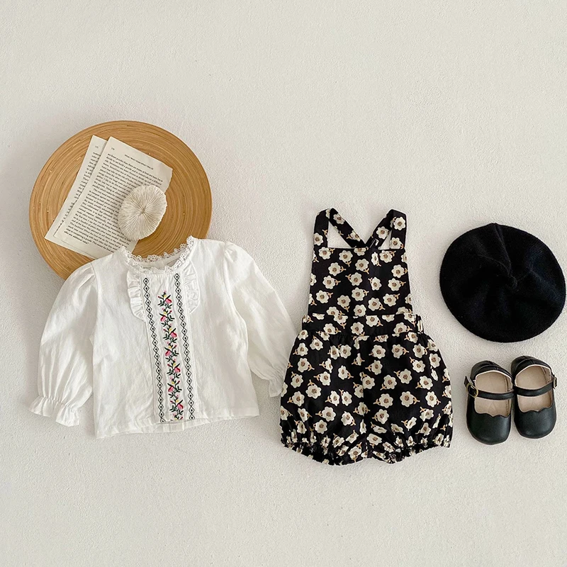 鮮やかな春の花柄のセットアップ。赤ちゃん用のフリル付き長袖ブラウスと、可愛らしいオーバーオールがセットになった2点セット。刺繍入りのシャツと柄付きのオーバーオールで、おしゃれな女の子のコーディネートにぴったり。上質な素材で肌触りも抜群です。