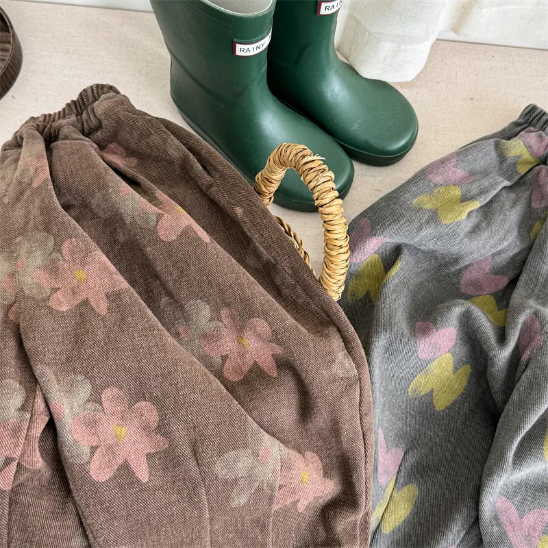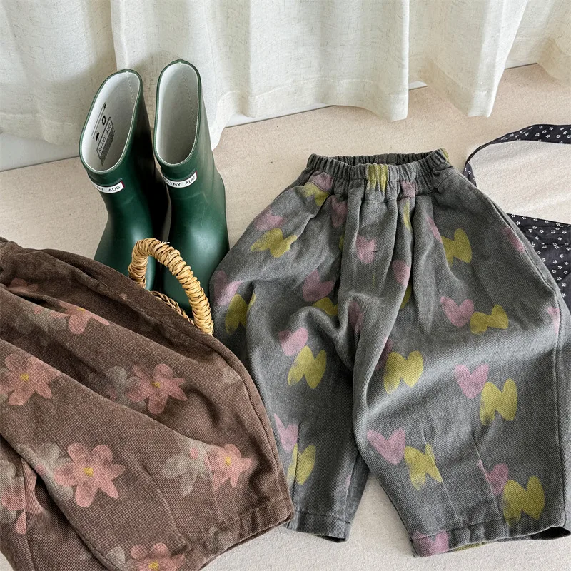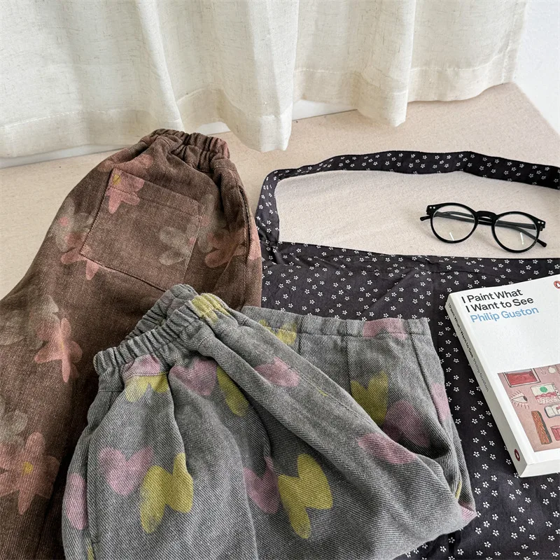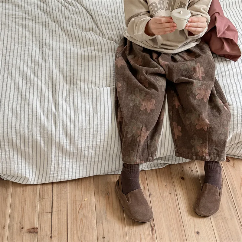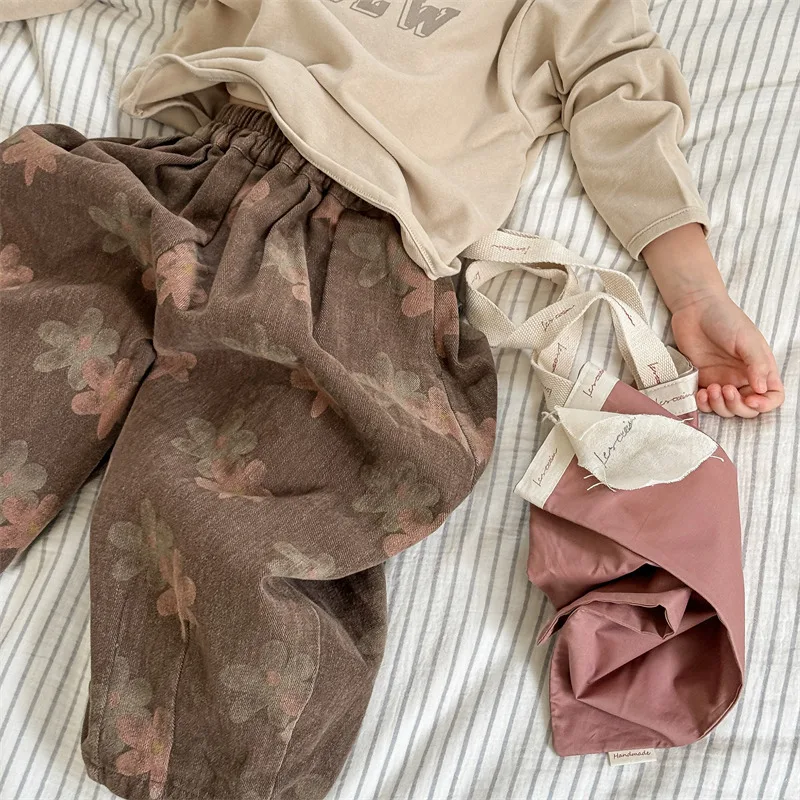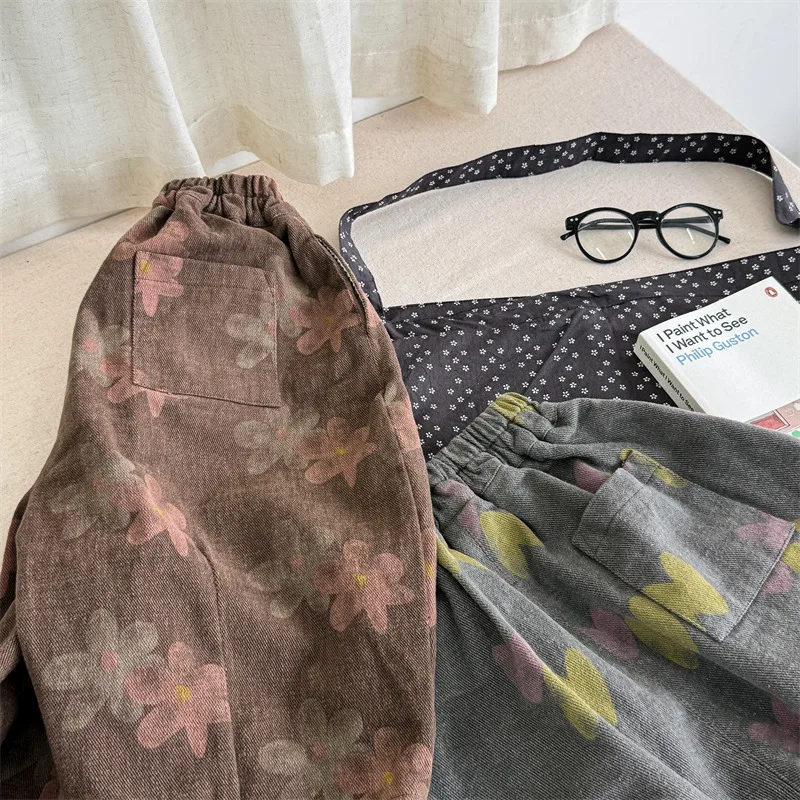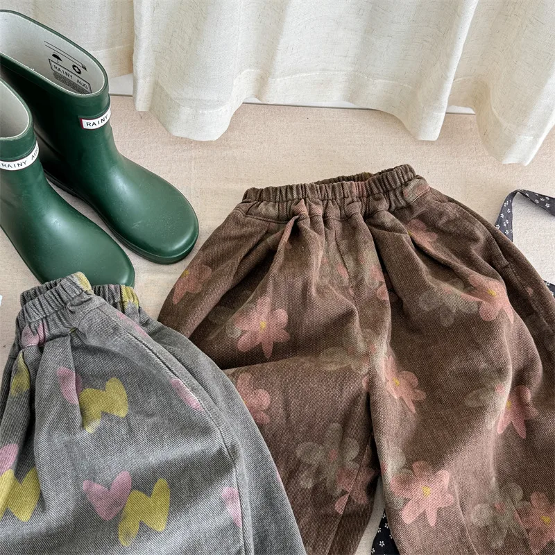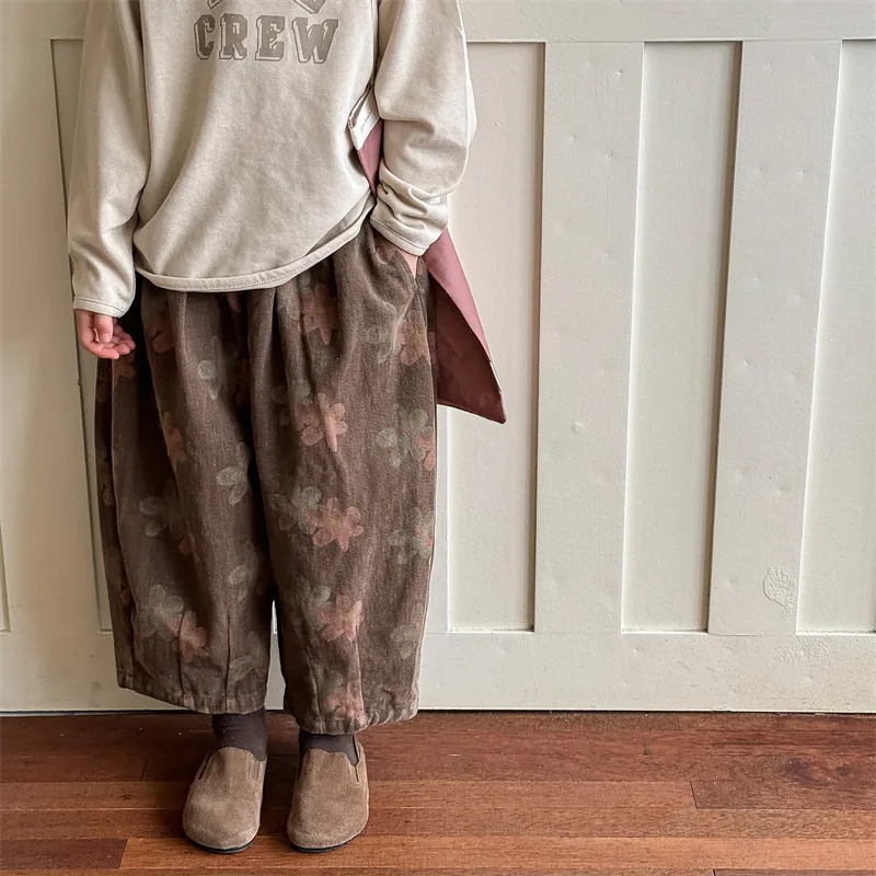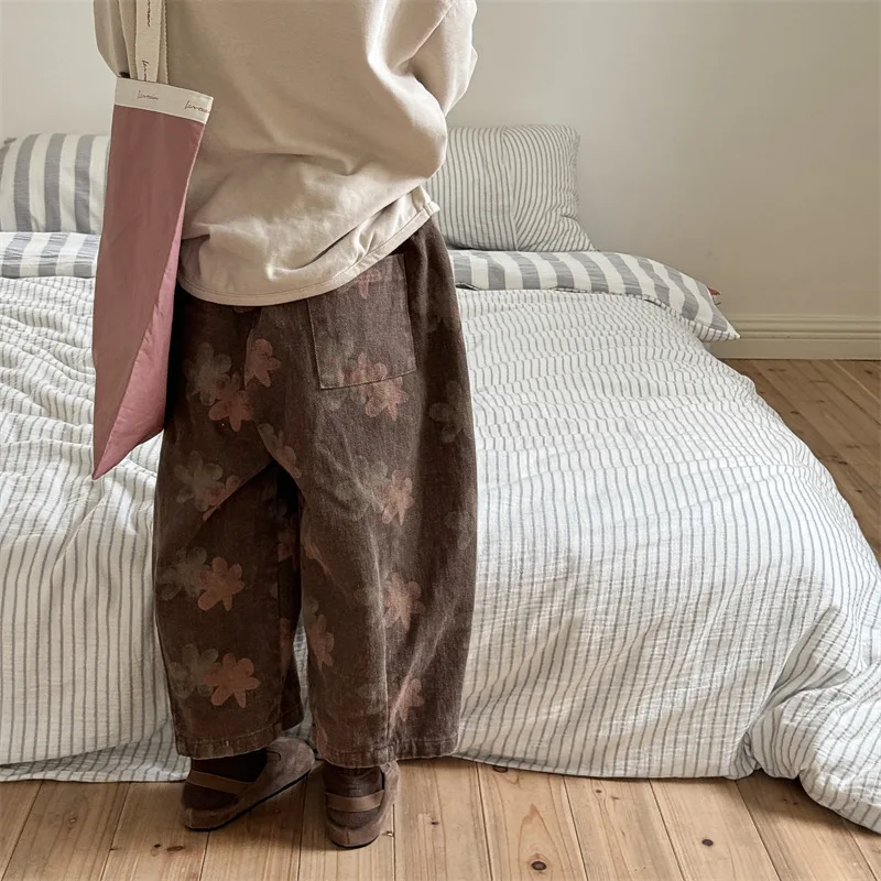 #キッズパンツ #レトロフラワープリント #ルーズワイドパンツ #子供服 #カジュアルスタイル #コットンパンツ
