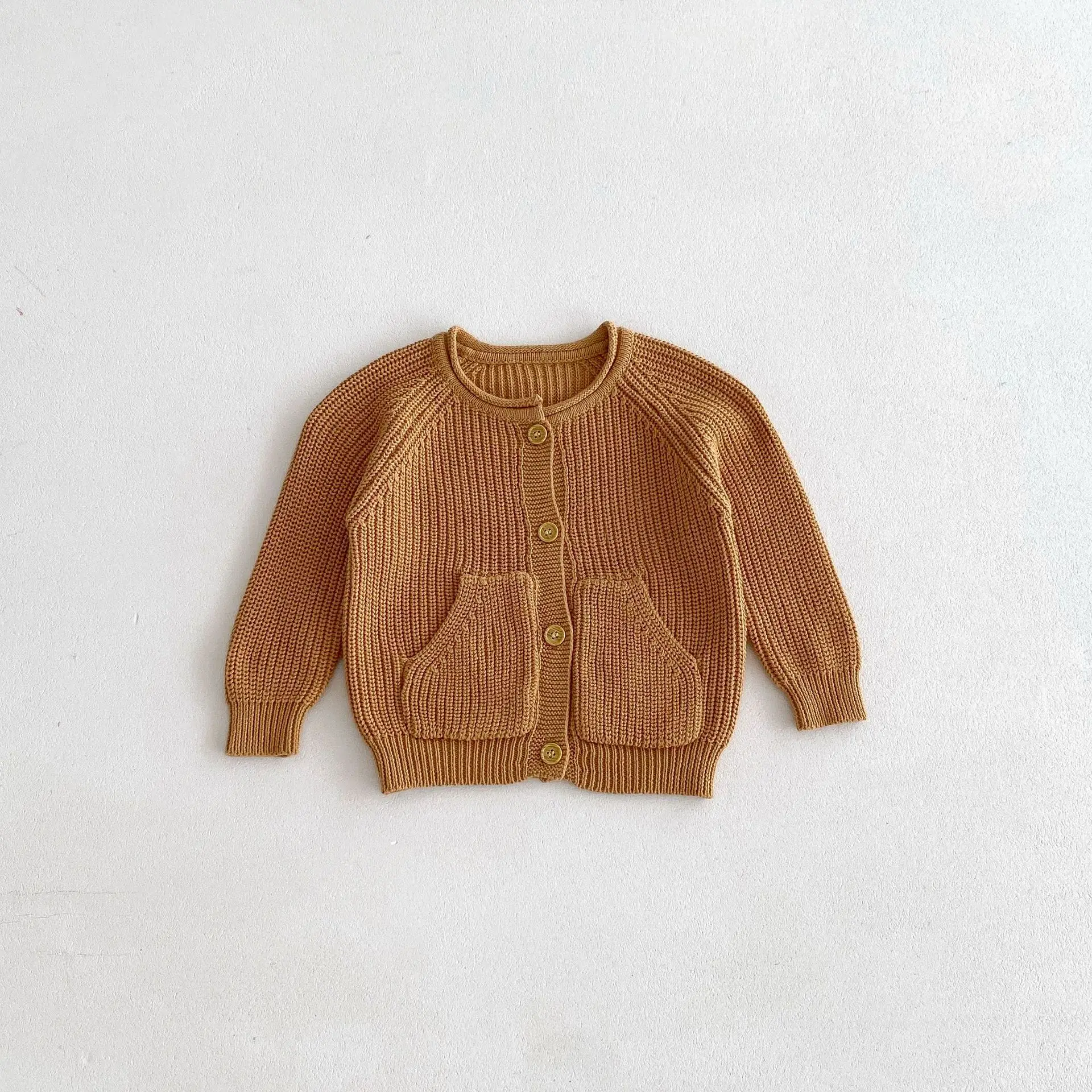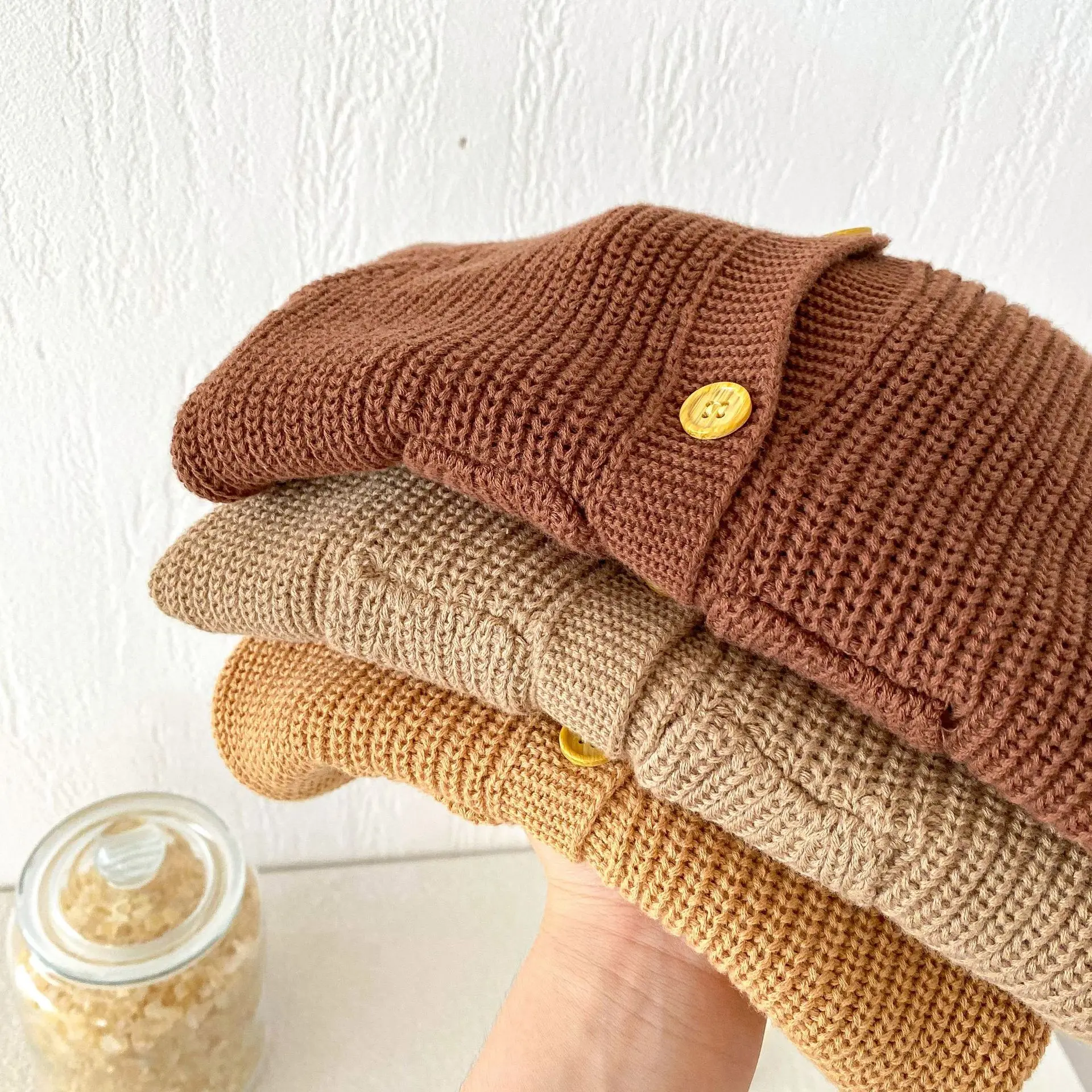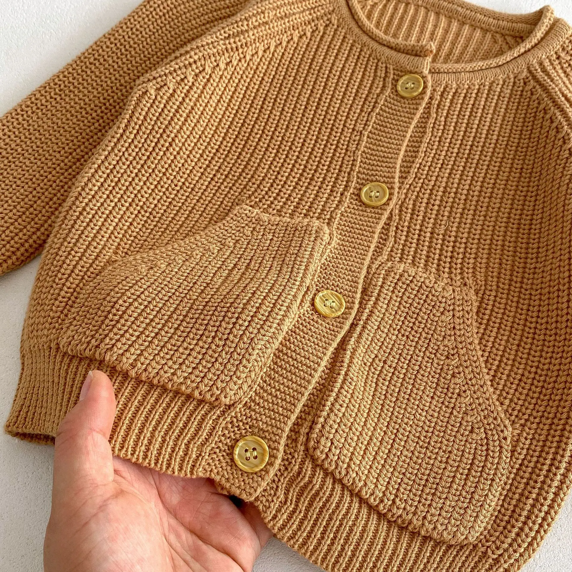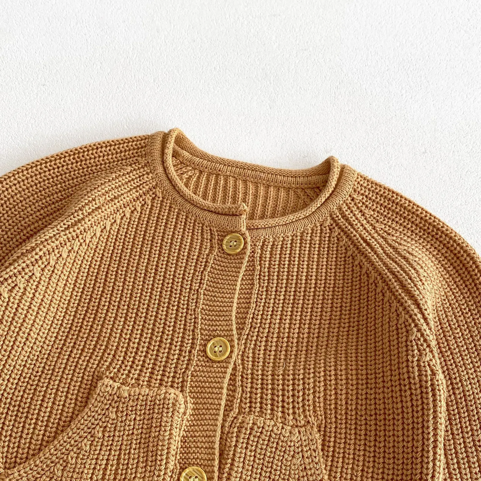 ポケット付きのキッズ用ニットカーディガンジャケットです。シンプルなデザインながらも、ヴィンテージ風の風合いが魅力。どんなスタイルにも合わせやすく、デイリーユースにぴったりです。柔らかい素材で着心地も良く、季節の変わり目にも活躍します。3つのカラーからお選びいただけるので、お子様のコーディネートに合わせてお楽しみいただけます。