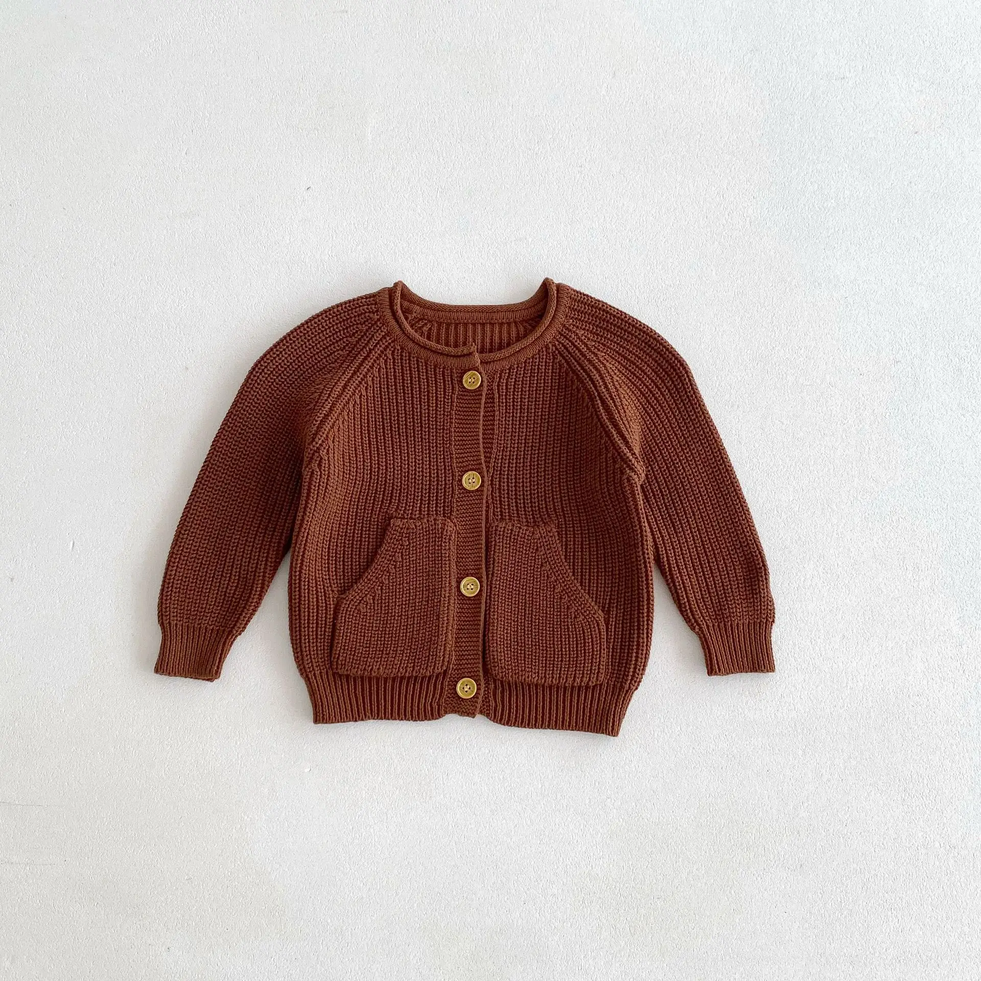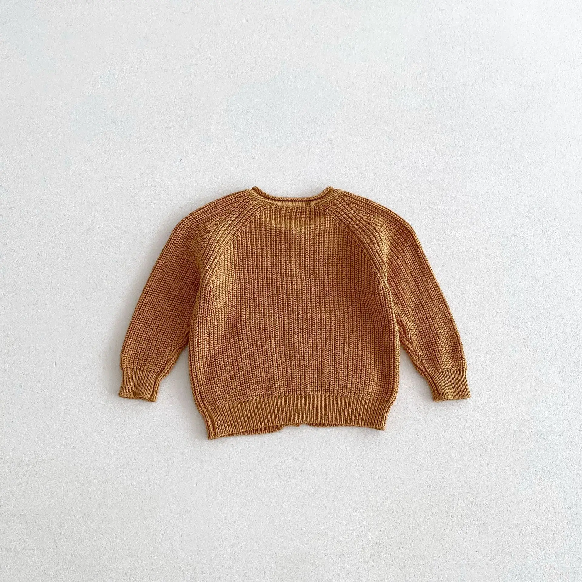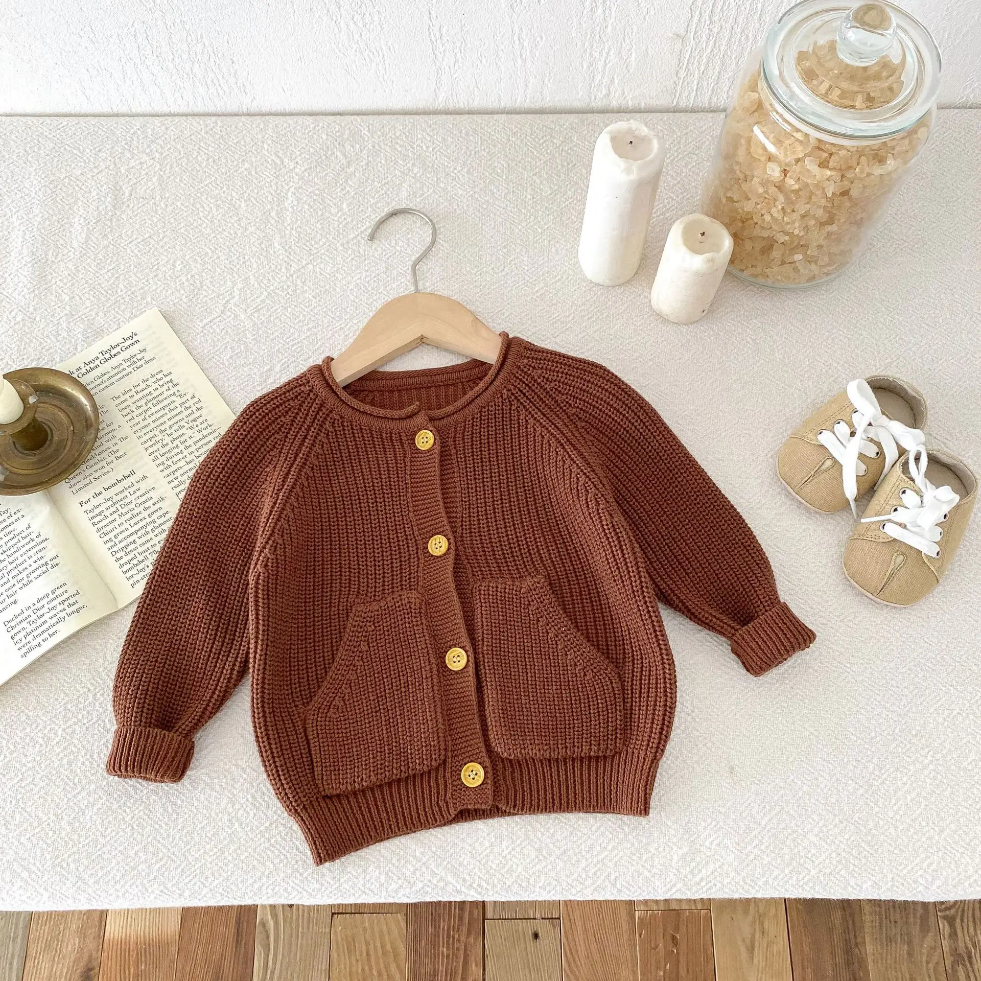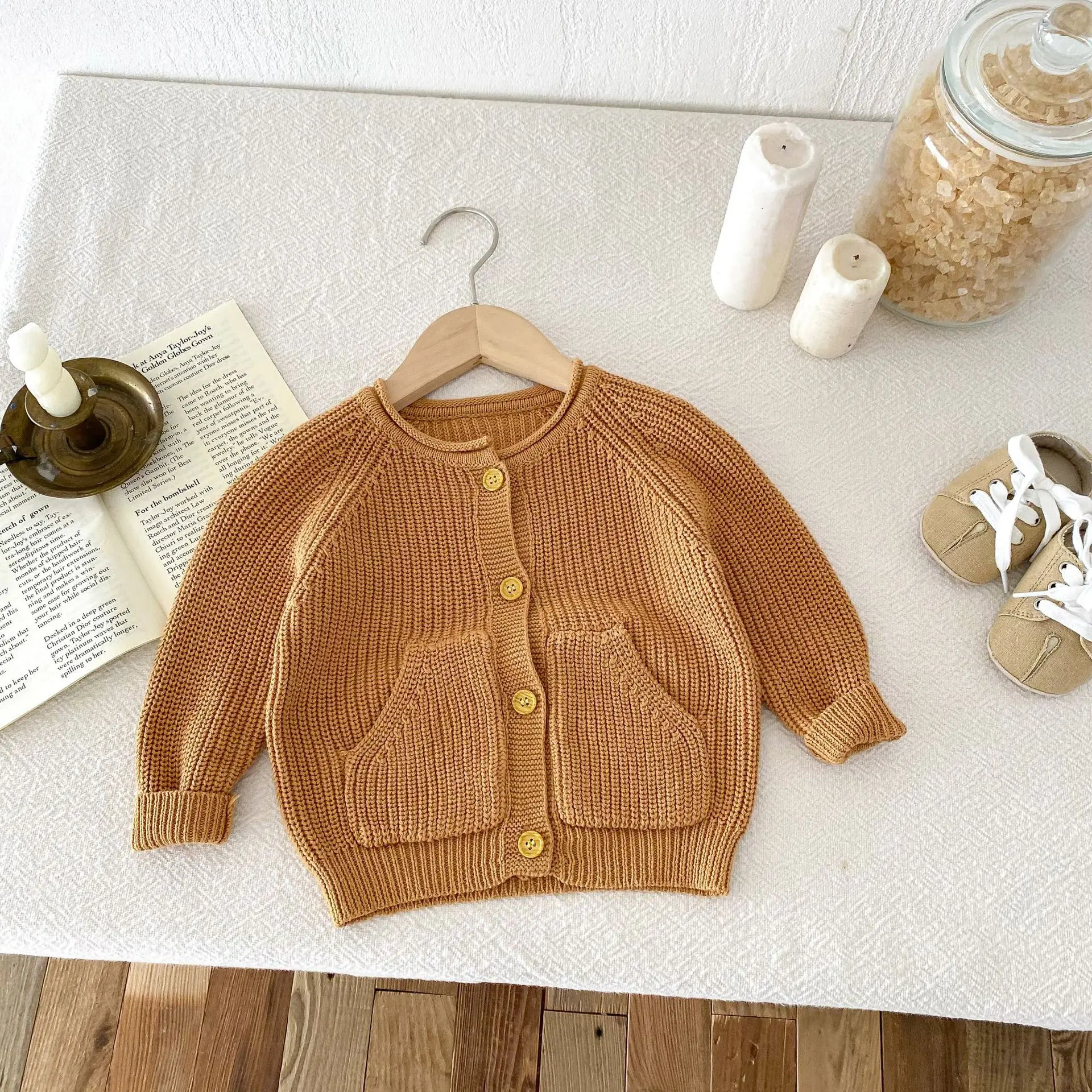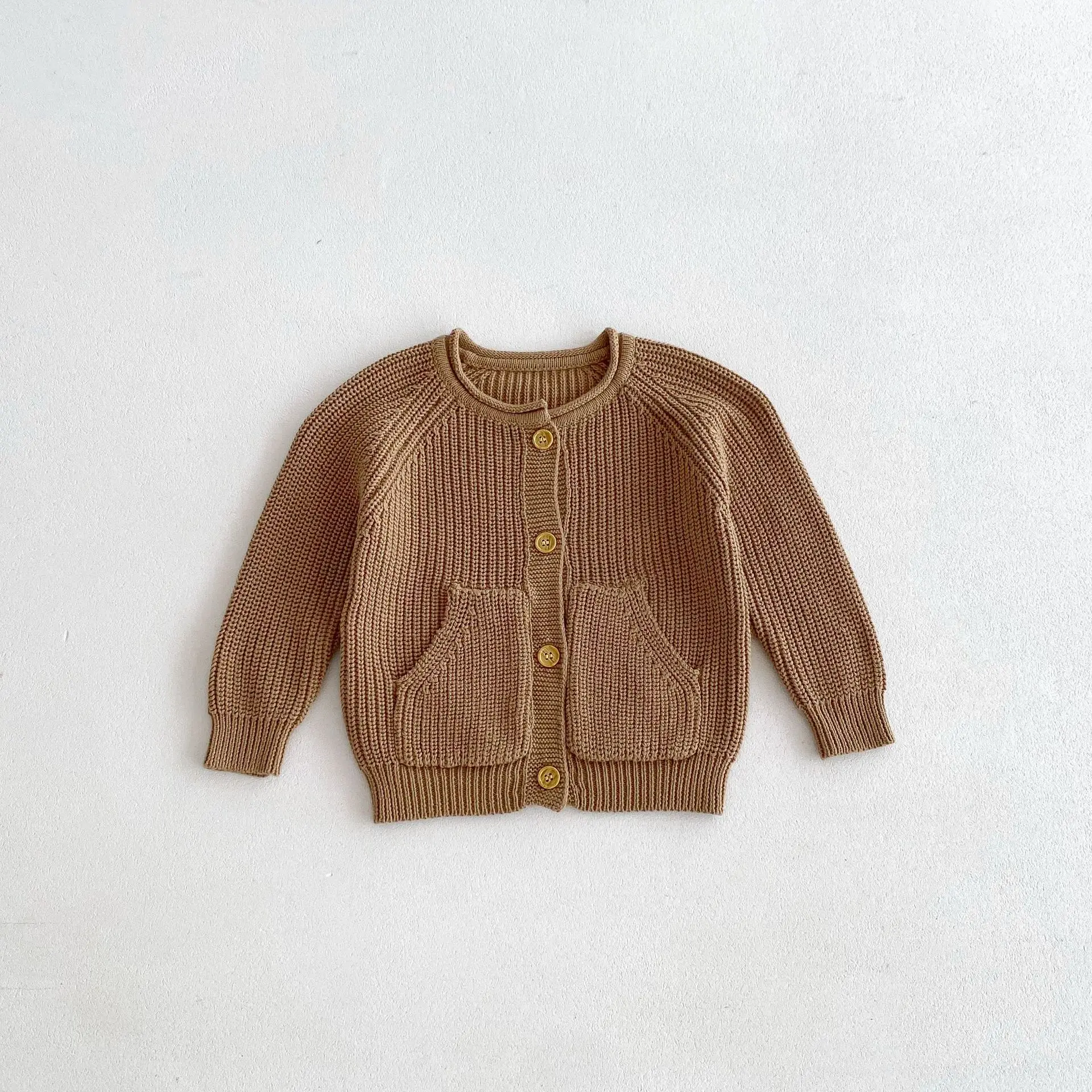 ポケット付きのキッズ用ニットカーディガンジャケットです。シンプルなデザインながらも、ヴィンテージ風の風合いが魅力。どんなスタイルにも合わせやすく、デイリーユースにぴったりです。柔らかい素材で着心地も良く、季節の変わり目にも活躍します。3つのカラーからお選びいただけるので、お子様のコーディネートに合わせてお楽しみいただけます。