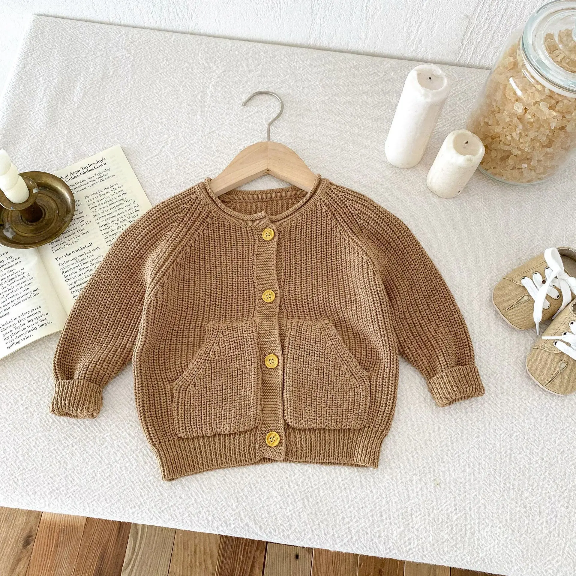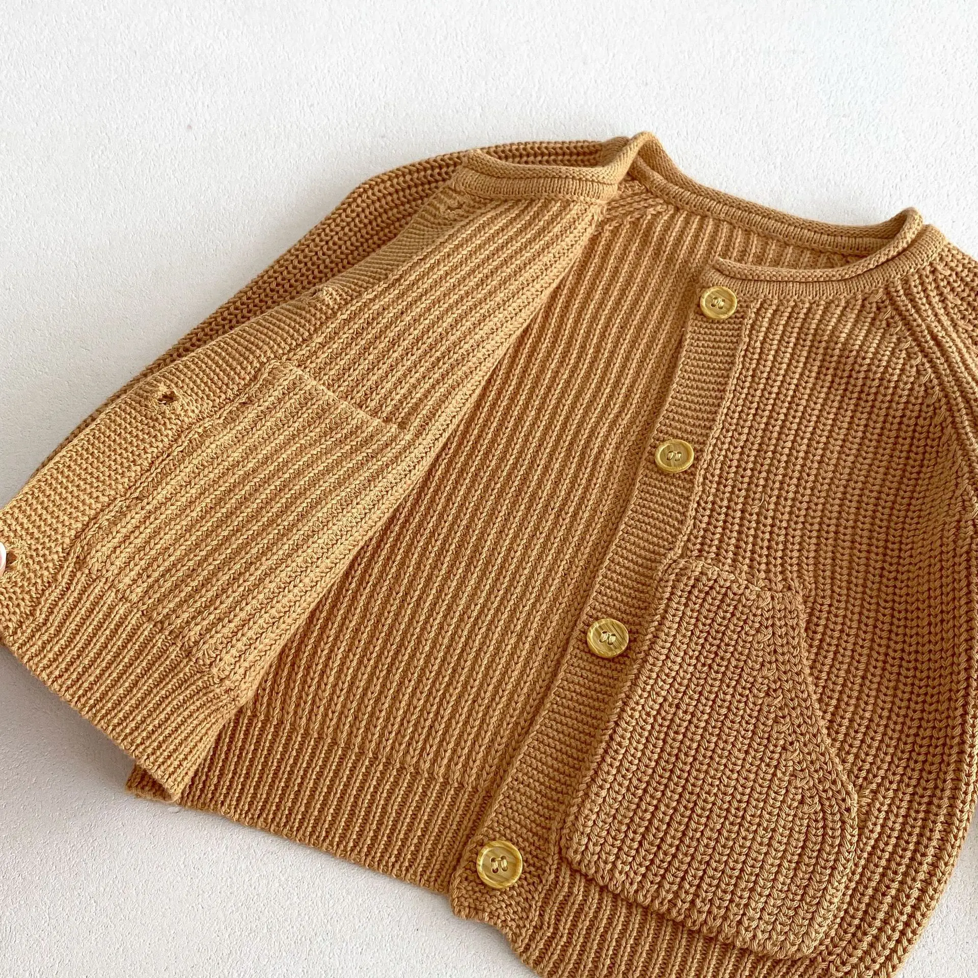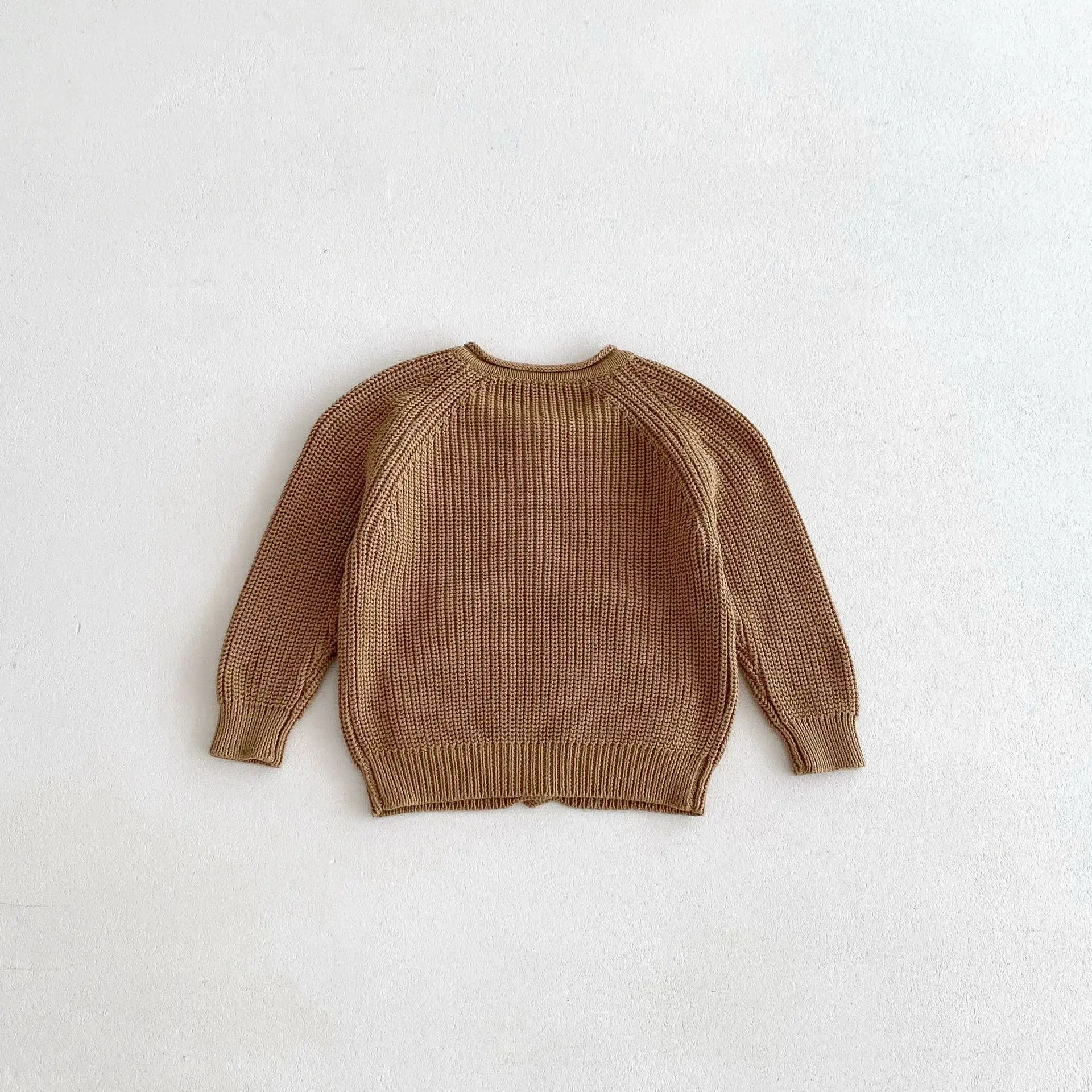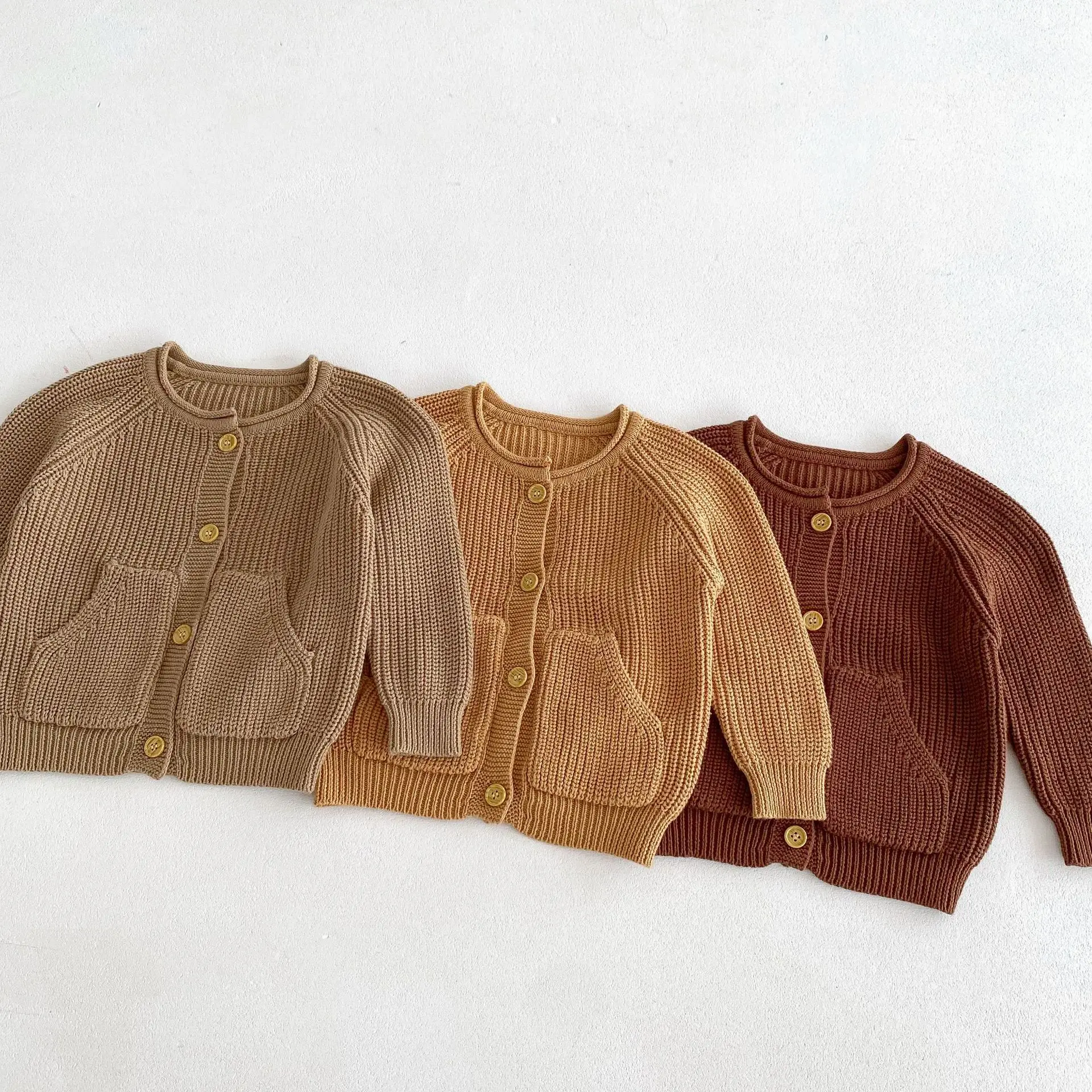 ポケット付きのキッズ用ニットカーディガンジャケットです。シンプルなデザインながらも、ヴィンテージ風の風合いが魅力。どんなスタイルにも合わせやすく、デイリーユースにぴったりです。柔らかい素材で着心地も良く、季節の変わり目にも活躍します。3つのカラーからお選びいただけるので、お子様のコーディネートに合わせてお楽しみいただけます。