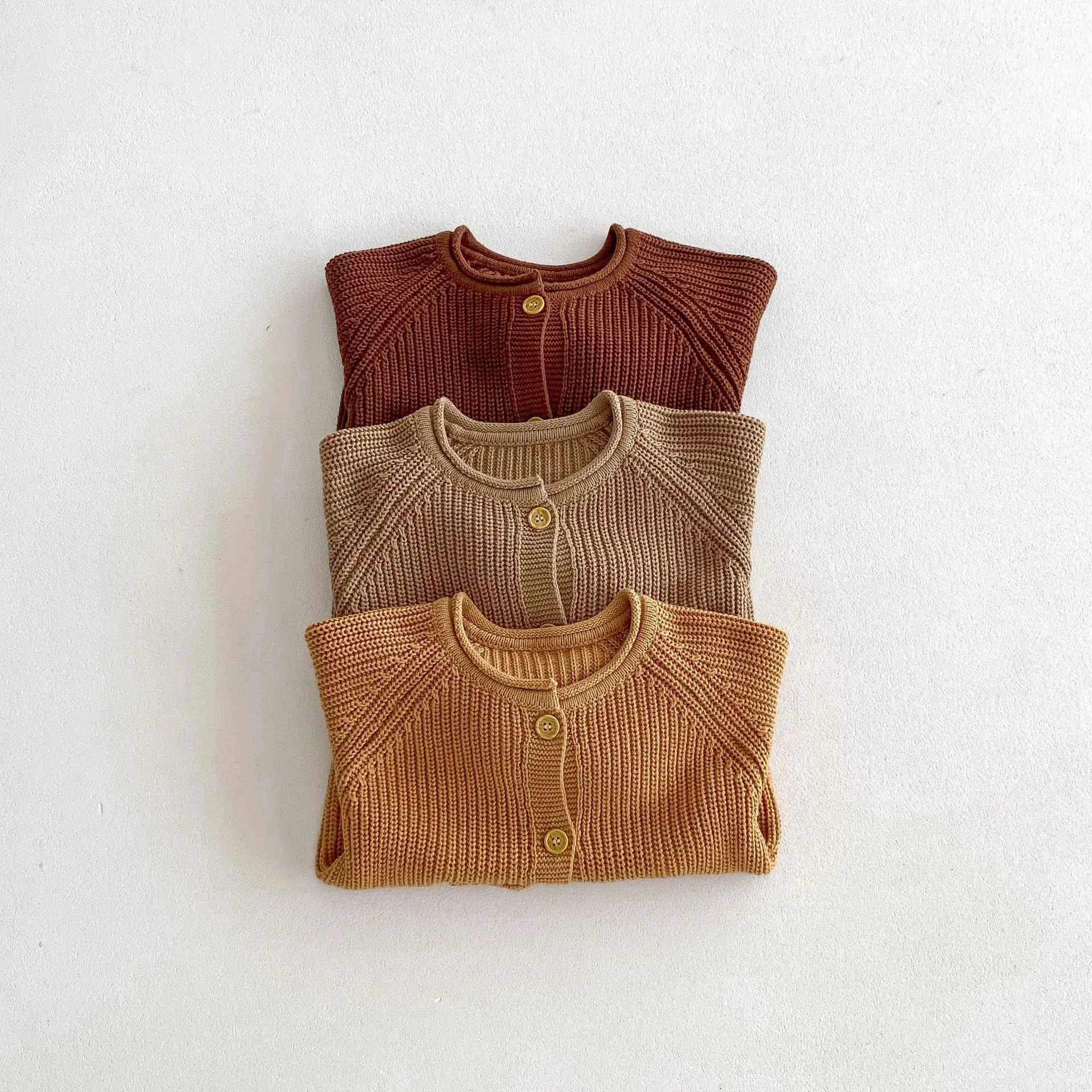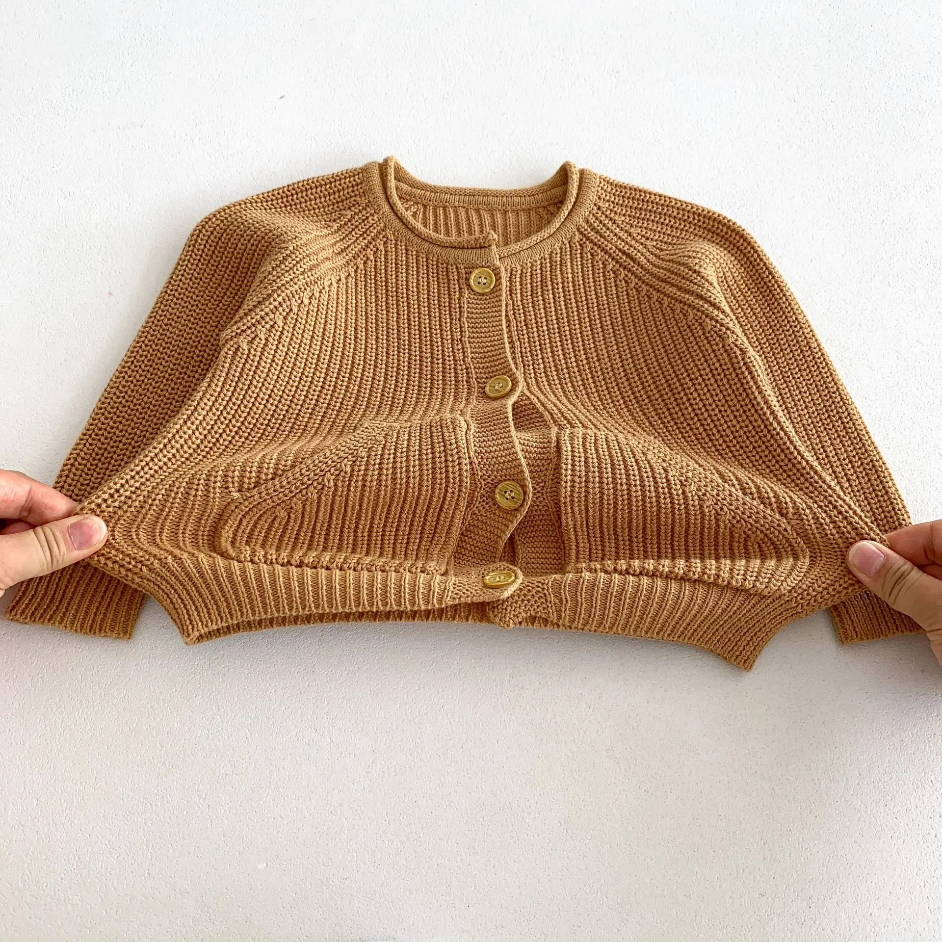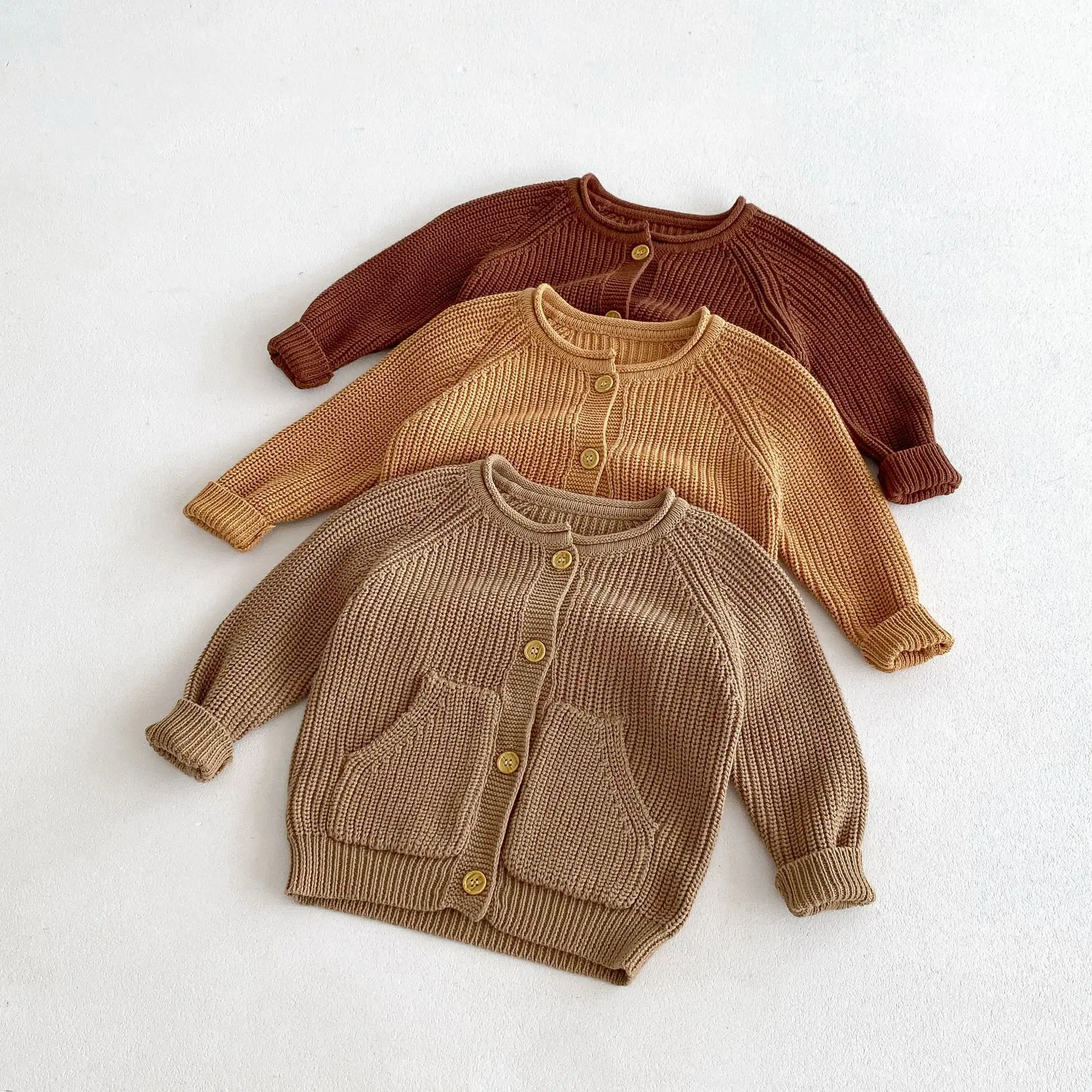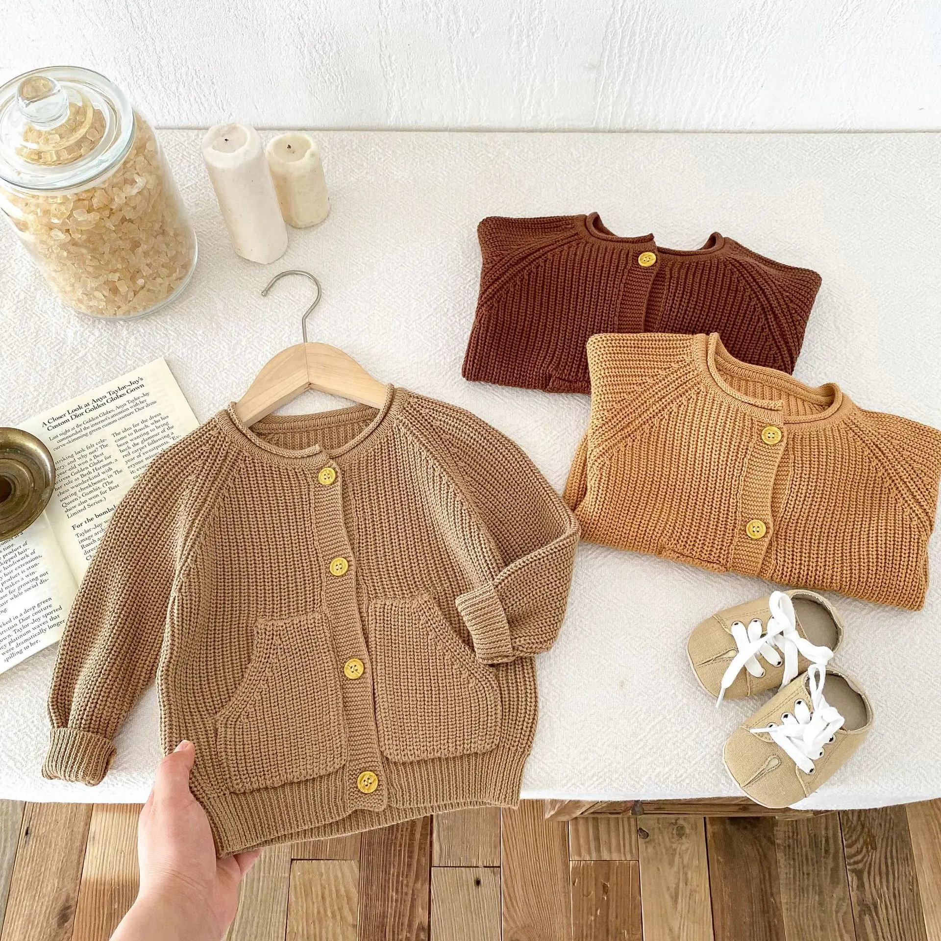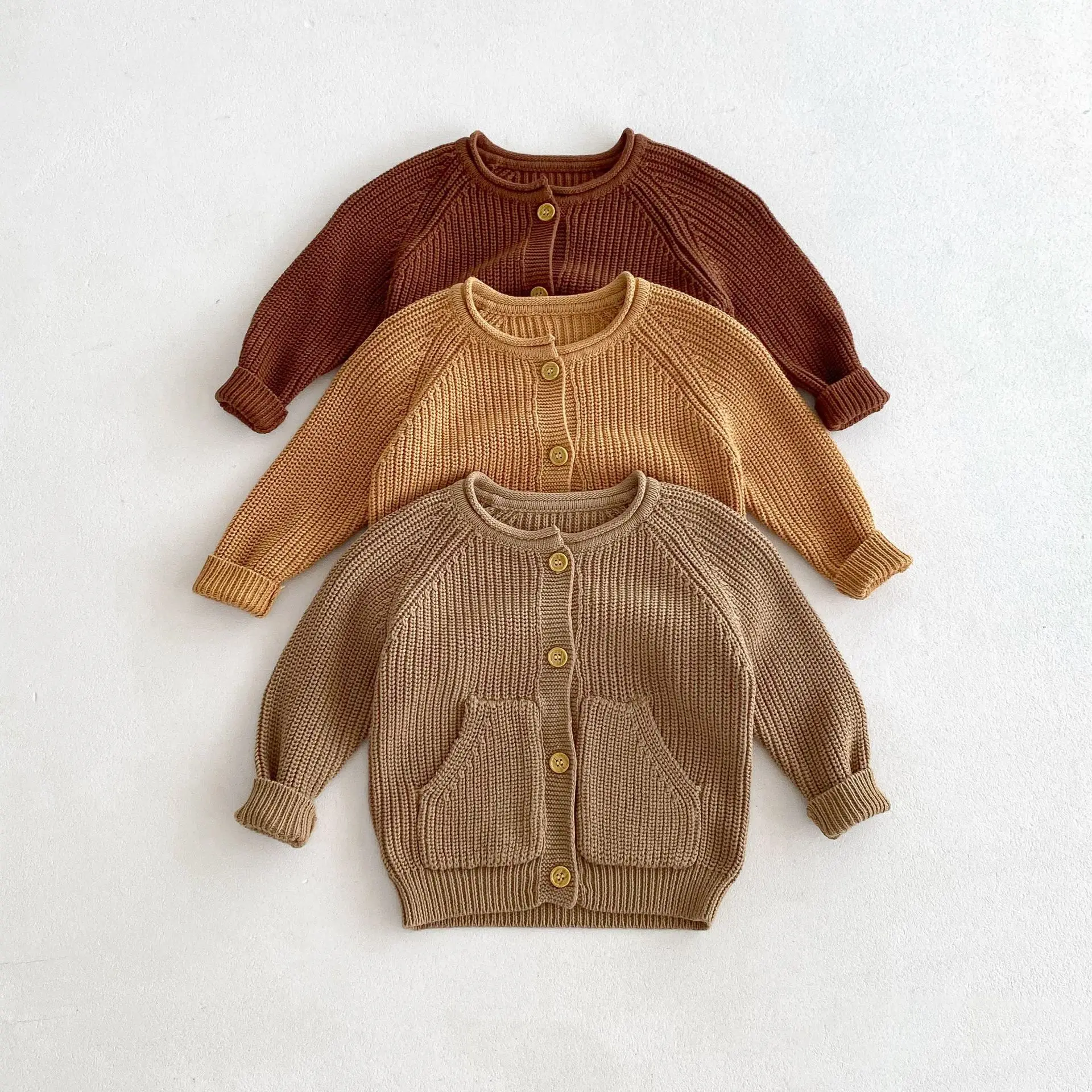 ポケット付きのキッズ用ニットカーディガンジャケットです。シンプルなデザインながらも、ヴィンテージ風の風合いが魅力。どんなスタイルにも合わせやすく、デイリーユースにぴったりです。柔らかい素材で着心地も良く、季節の変わり目にも活躍します。3つのカラーからお選びいただけるので、お子様のコーディネートに合わせてお楽しみいただけます。