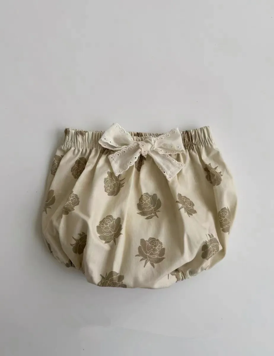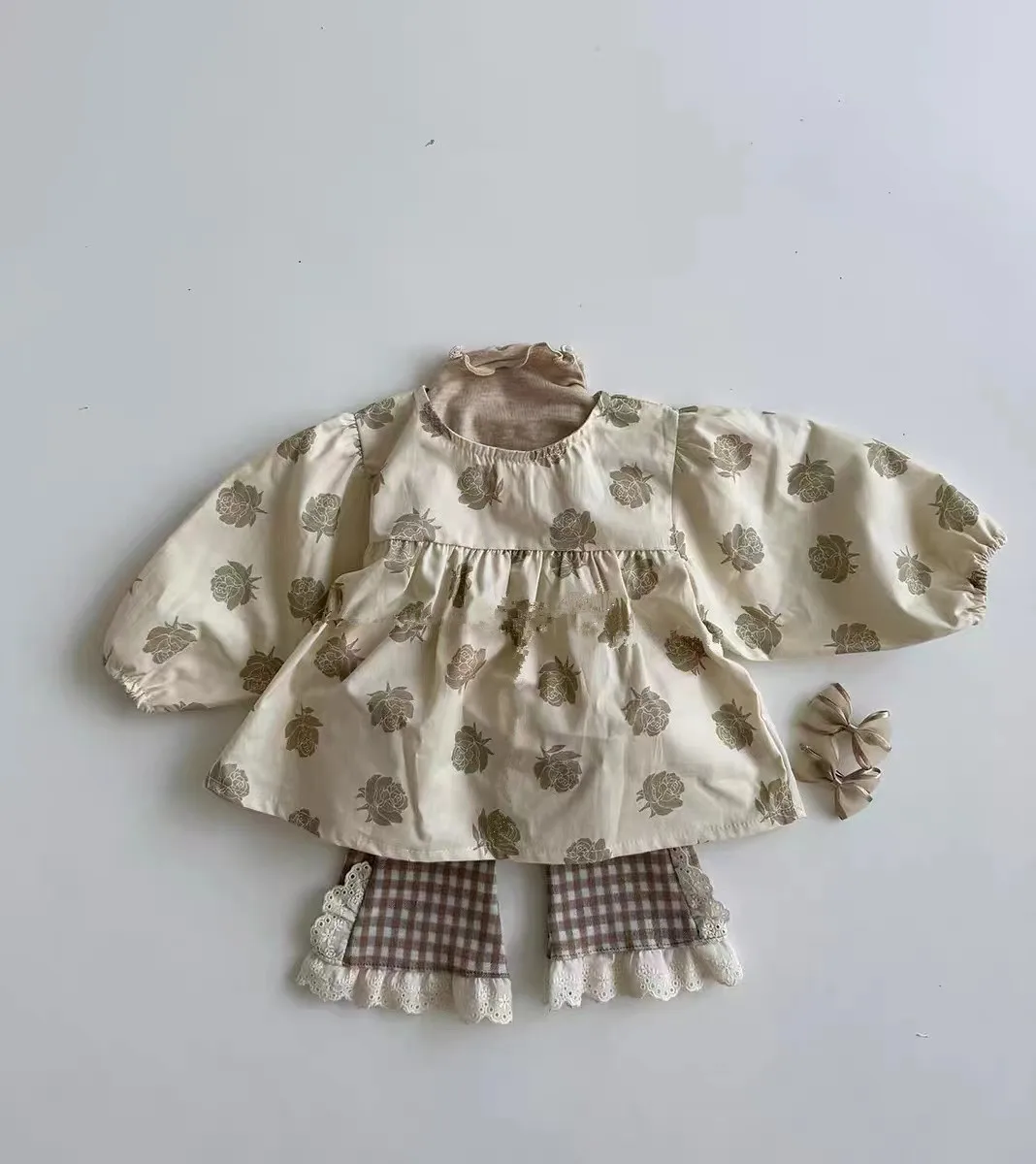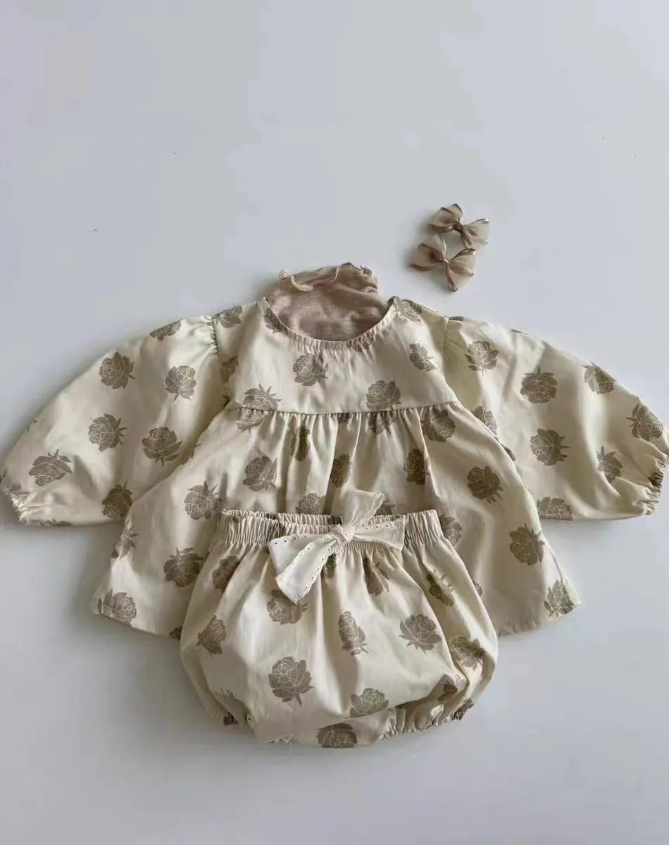 ベビーセットアップ 2点セット ローズフラワープリント長袖チュニックブラウス+リボン付きブルマパンツ アプリコット【mh0006716】