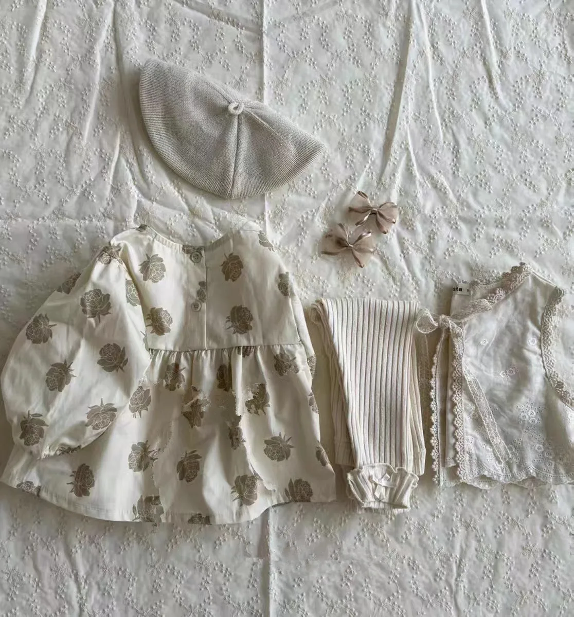 #ベビーセットアップ #ローズフラワープリント #長袖チュニック #リボン付きブルマ #アプリコット #赤ちゃん服 #2点セット #カジュアルアウトフィット #かわいいコーデ