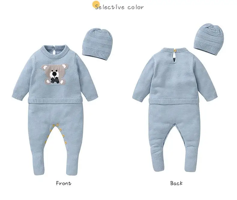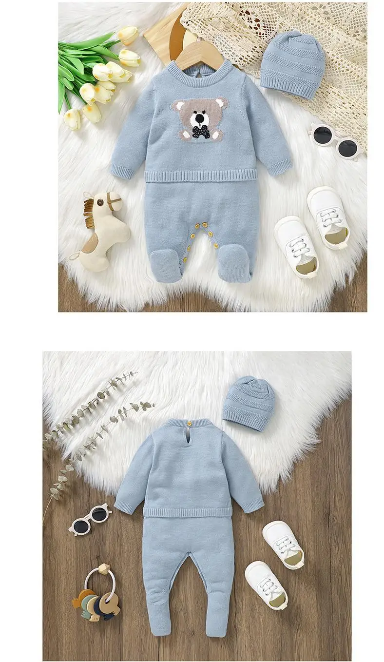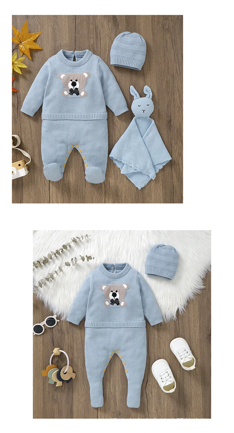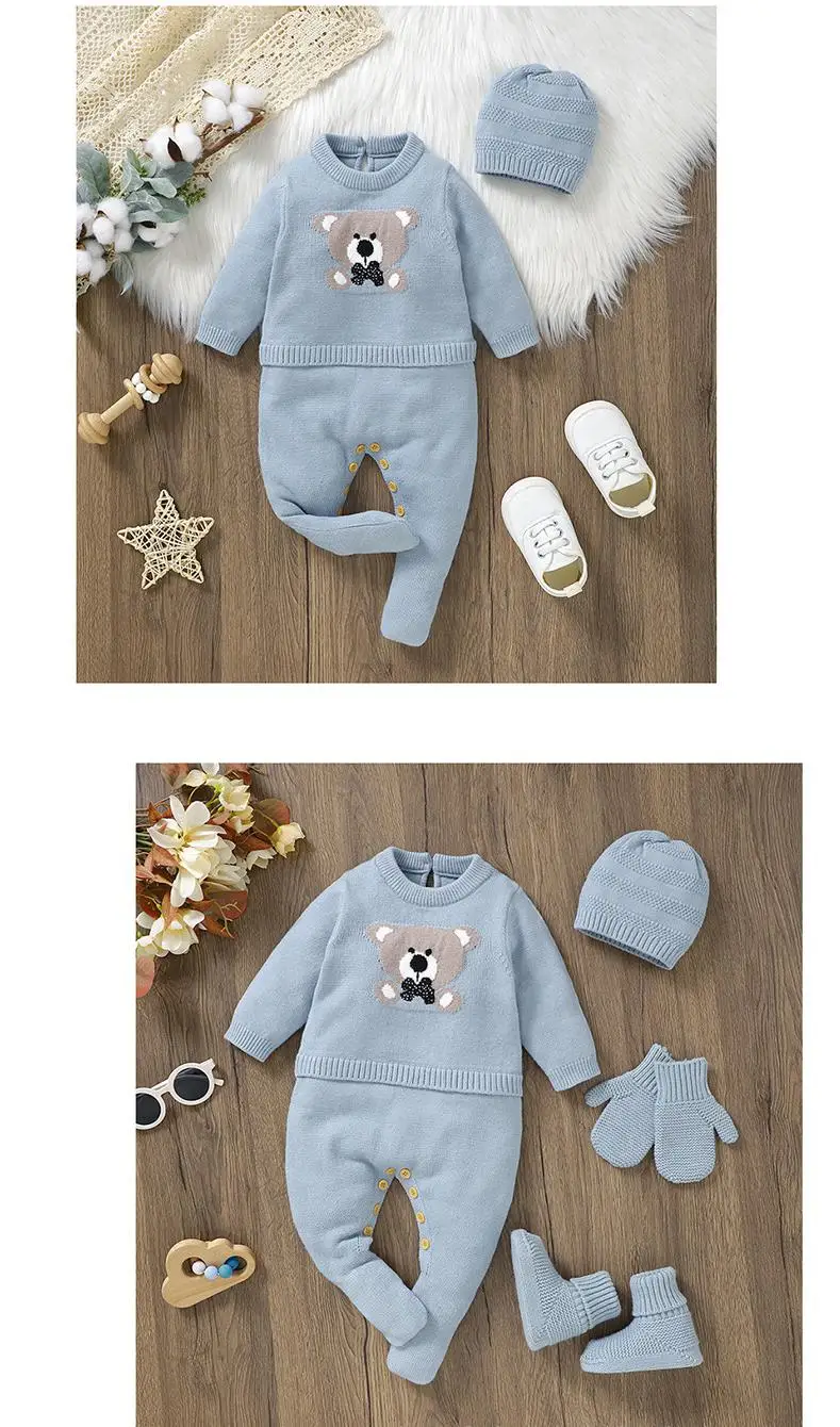 ベビーロンパース帽子セット ベアくま柄ニットドッキング長袖ジャンプスーツ ニット帽セット ブルー【mh0006820】