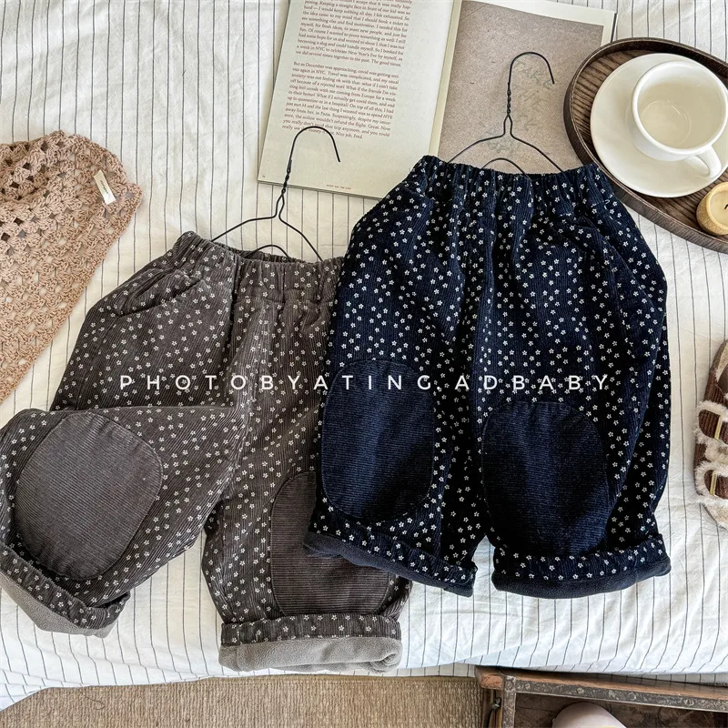 キッズパンツ フラワー小花柄膝パッチ裏フリースコーデュロイルーズロングパンツ 2カラー【mh0007616】