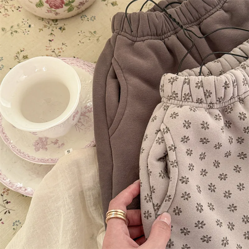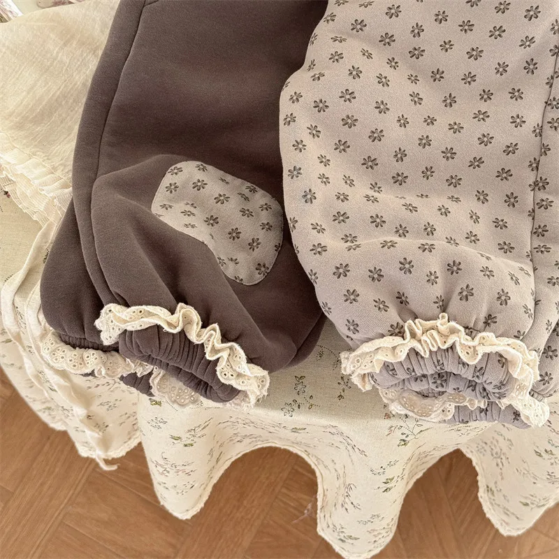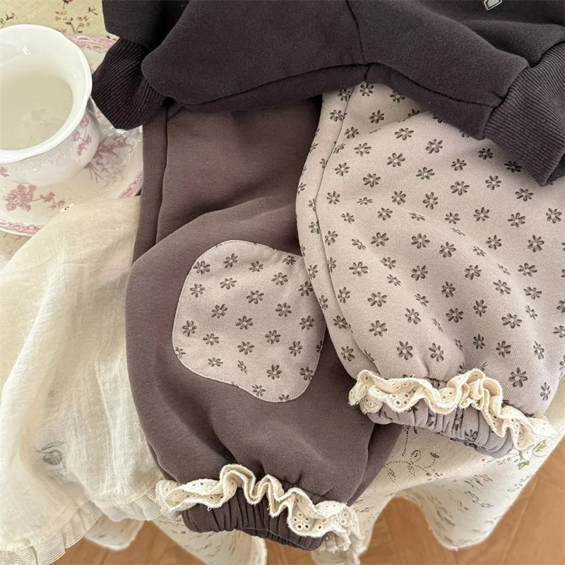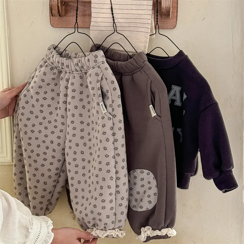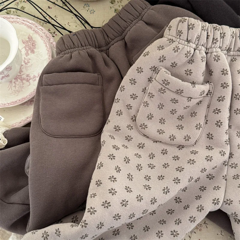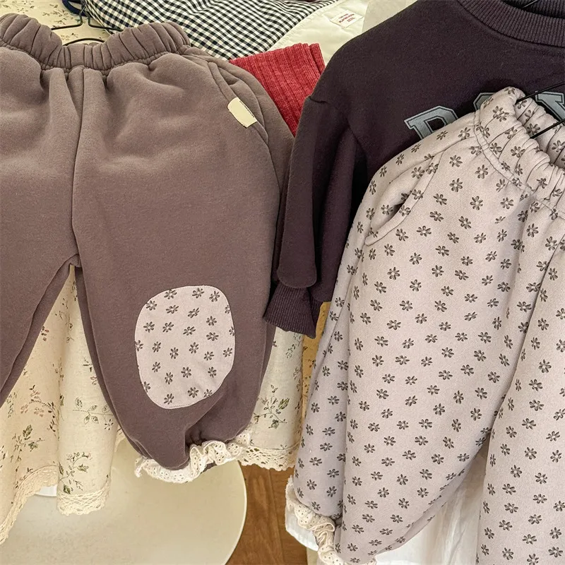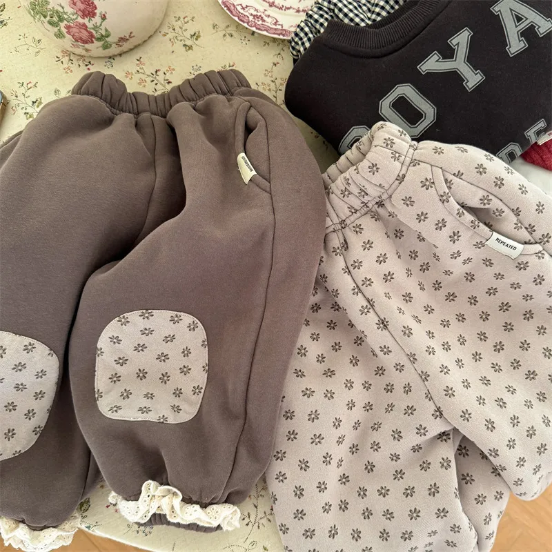 キッズパンツ 裾レースフラワープリント裏ボアフリース厚手スウェットパンツ【mh0007621】