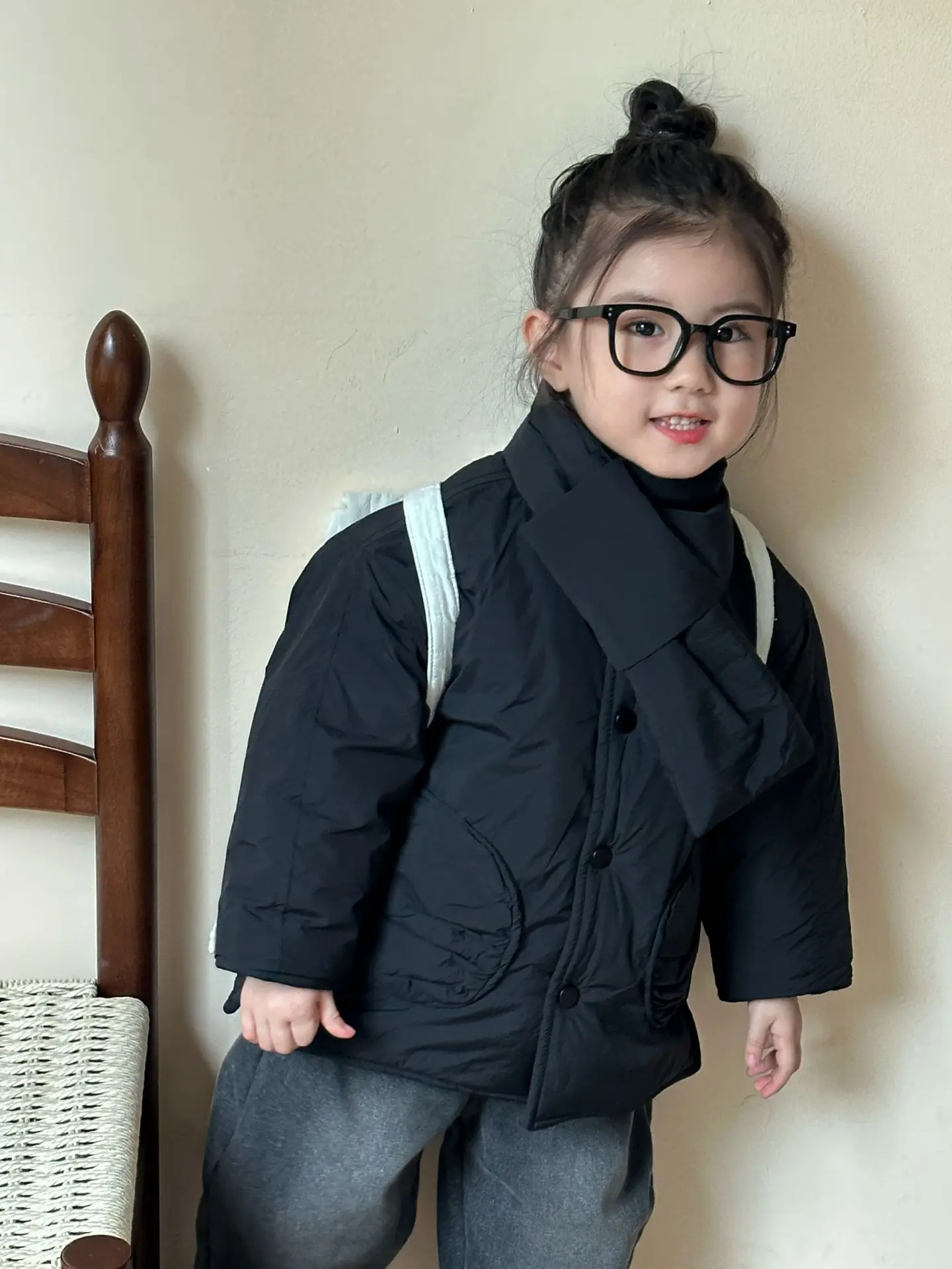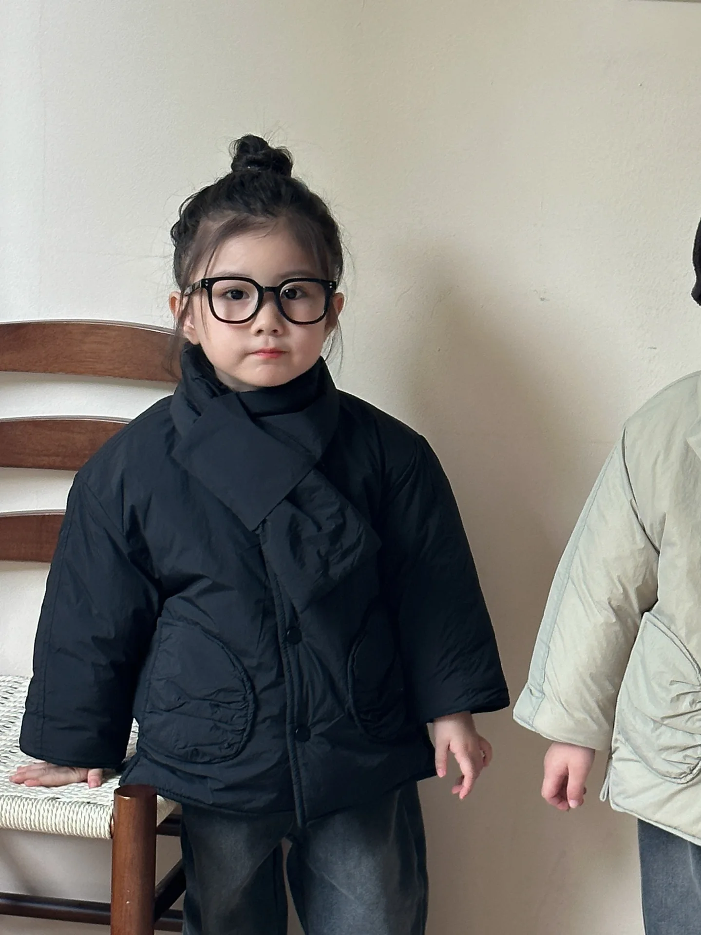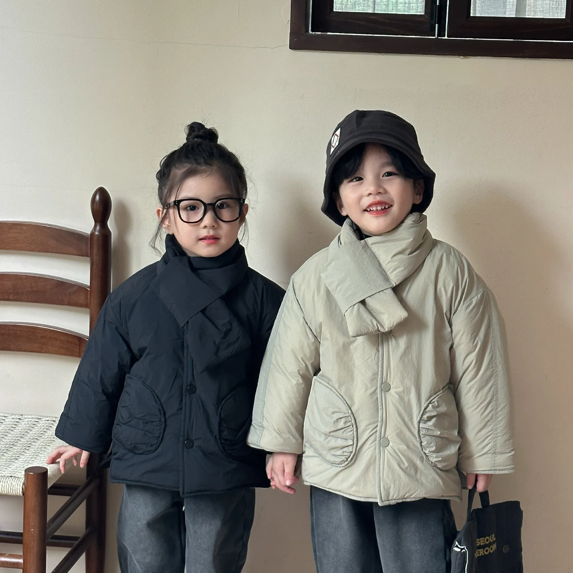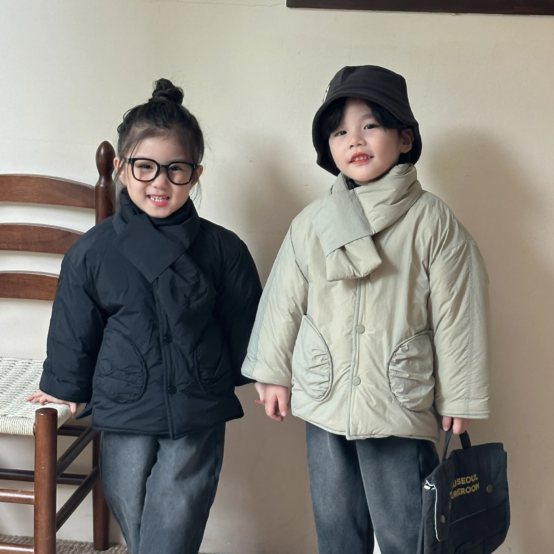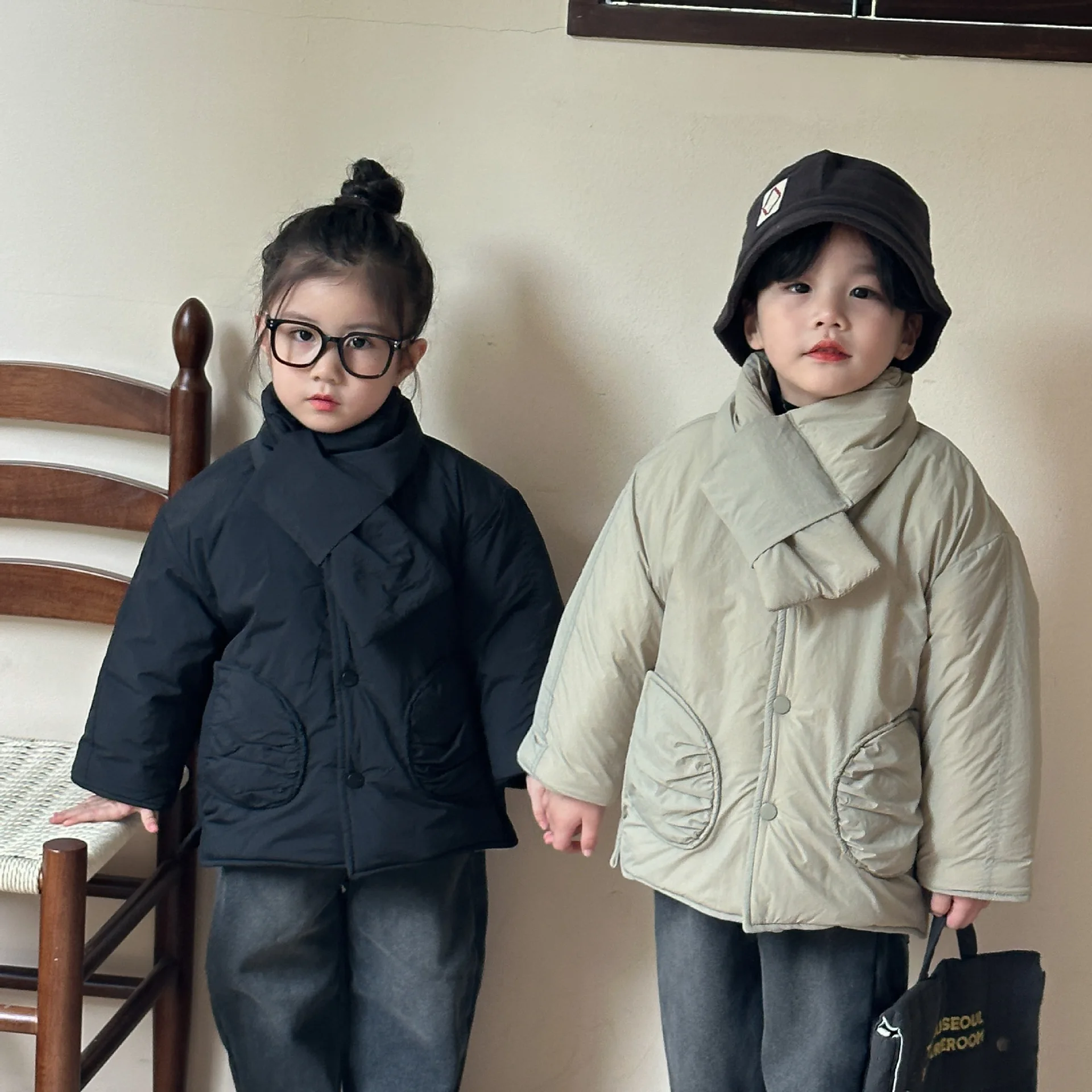 マフラードッキングデザインの裏フリースパデッドジャケットコートは、暖かさと便利さを兼ね備えた冬用キッズアウターです。内側には柔らかなフリース素材を使用し、全身を暖かく保ちます。また、ドッキングされたマフラーが付属しているため、別途マフラーを用意する手間がなく、首元までしっかり防寒できます。シンプルなデザインで男女問わず似合い、普段使いからお出かけまでさまざまなシーンに対応する一着です。