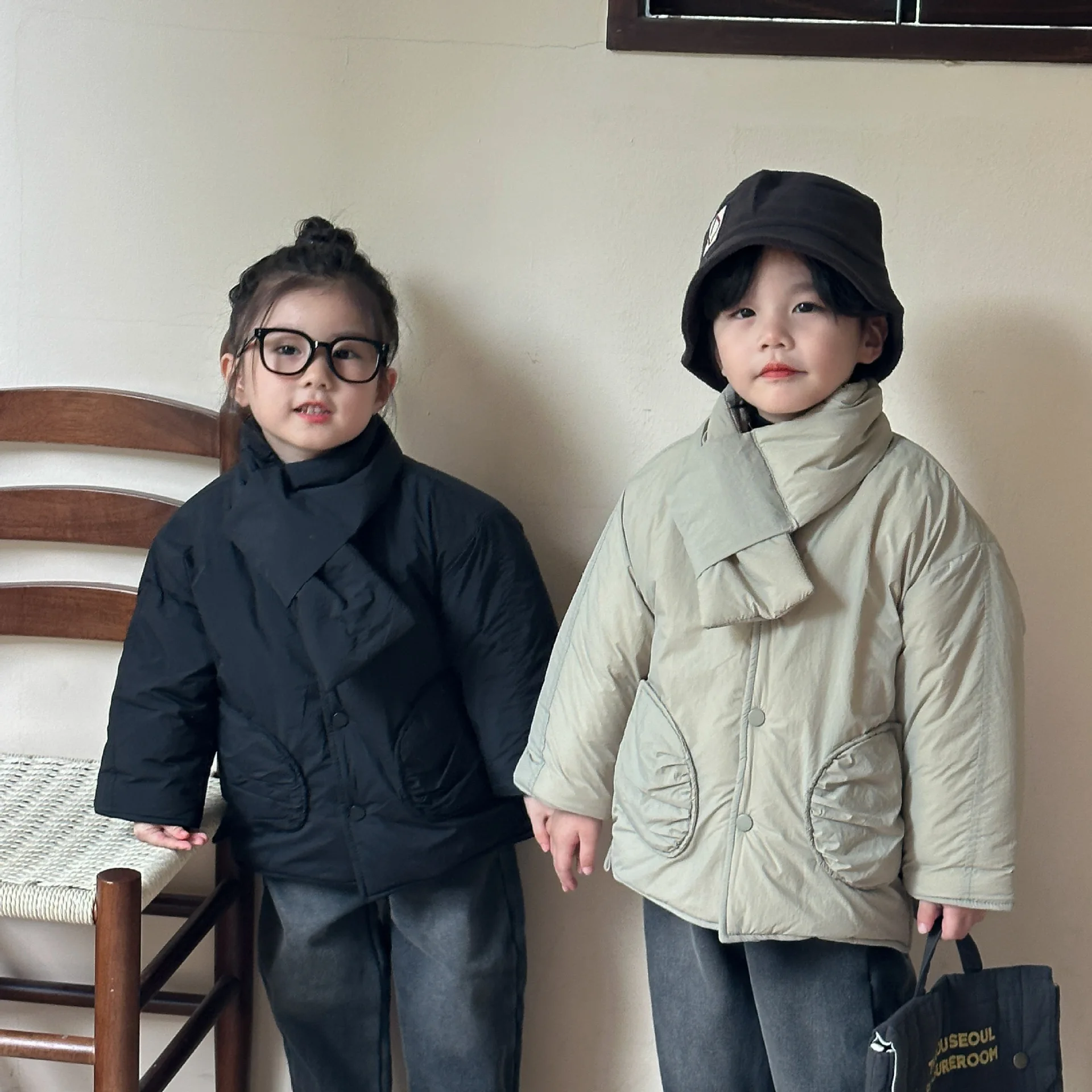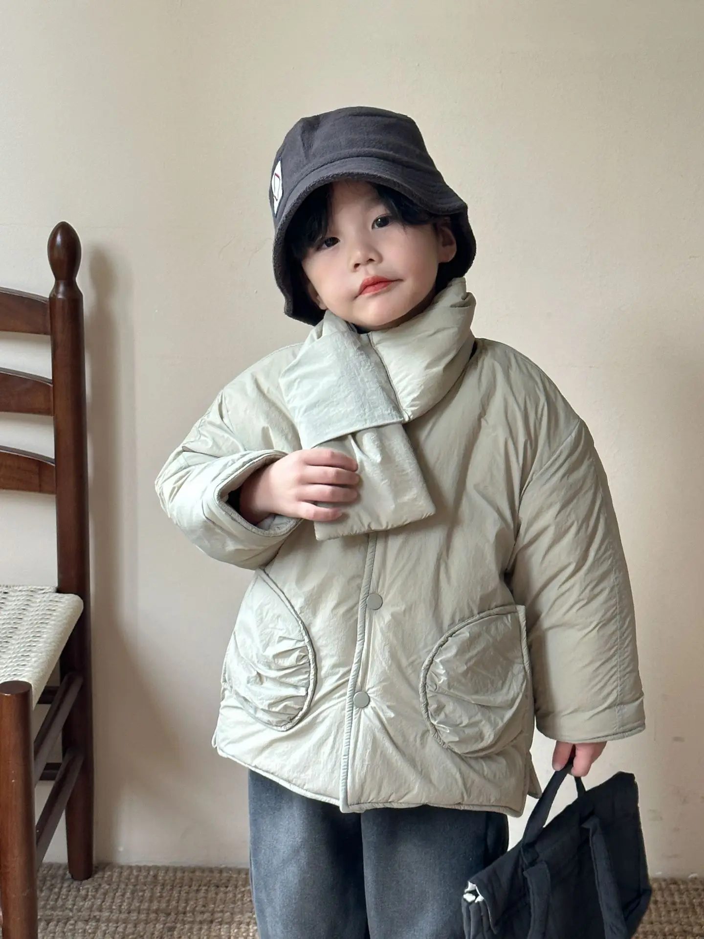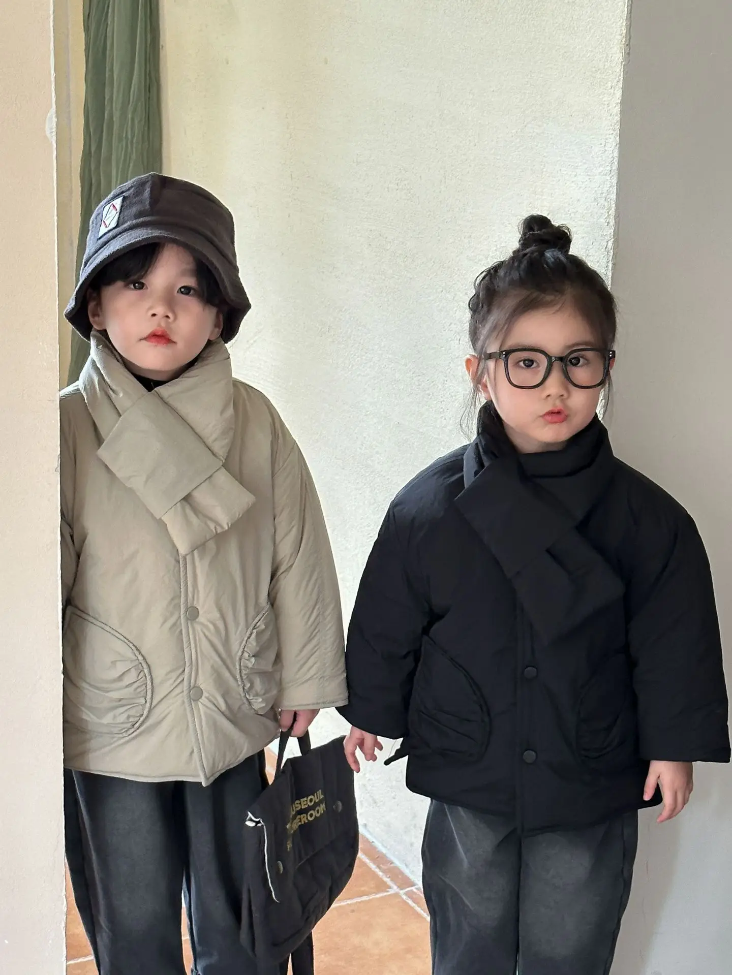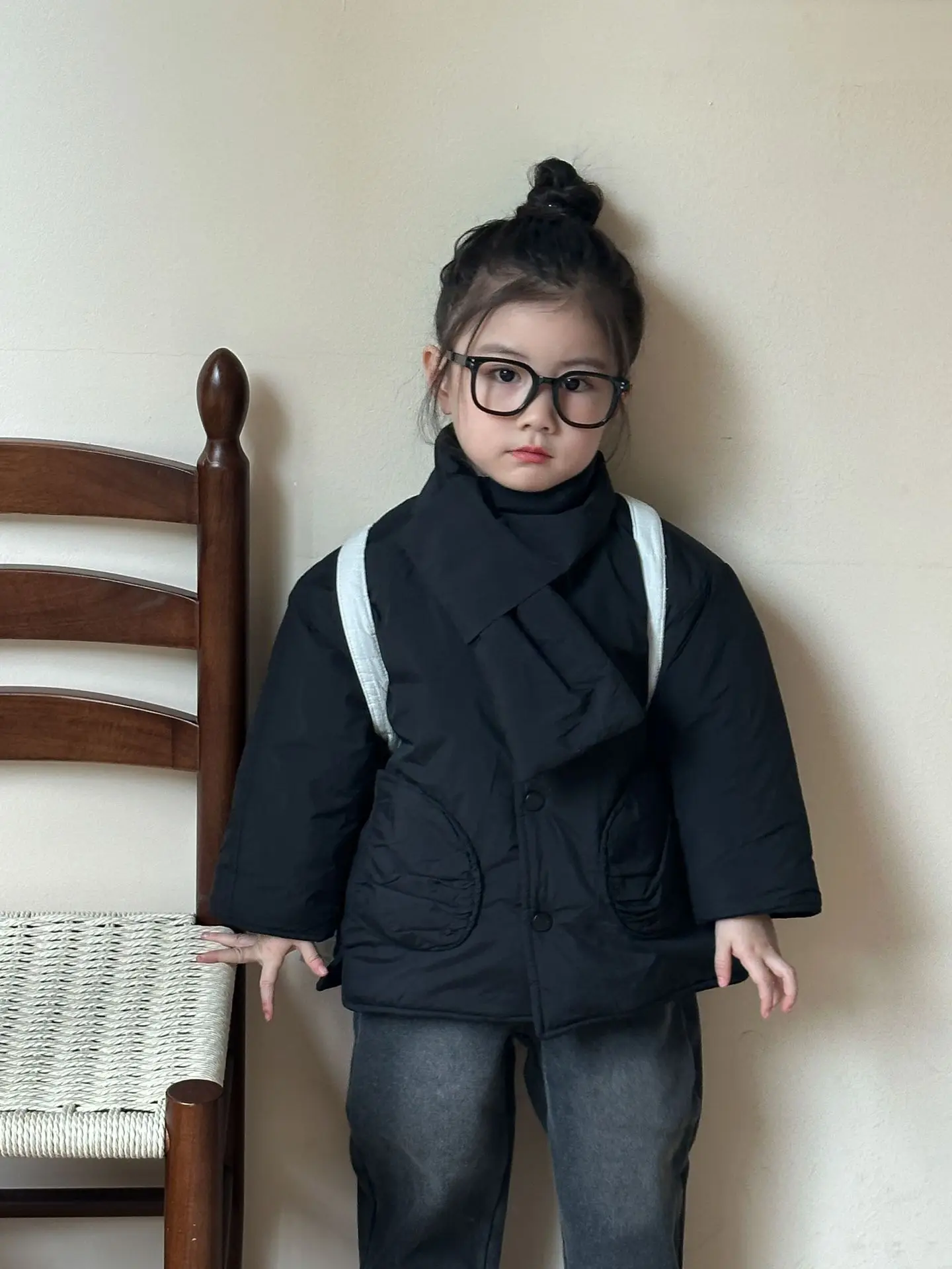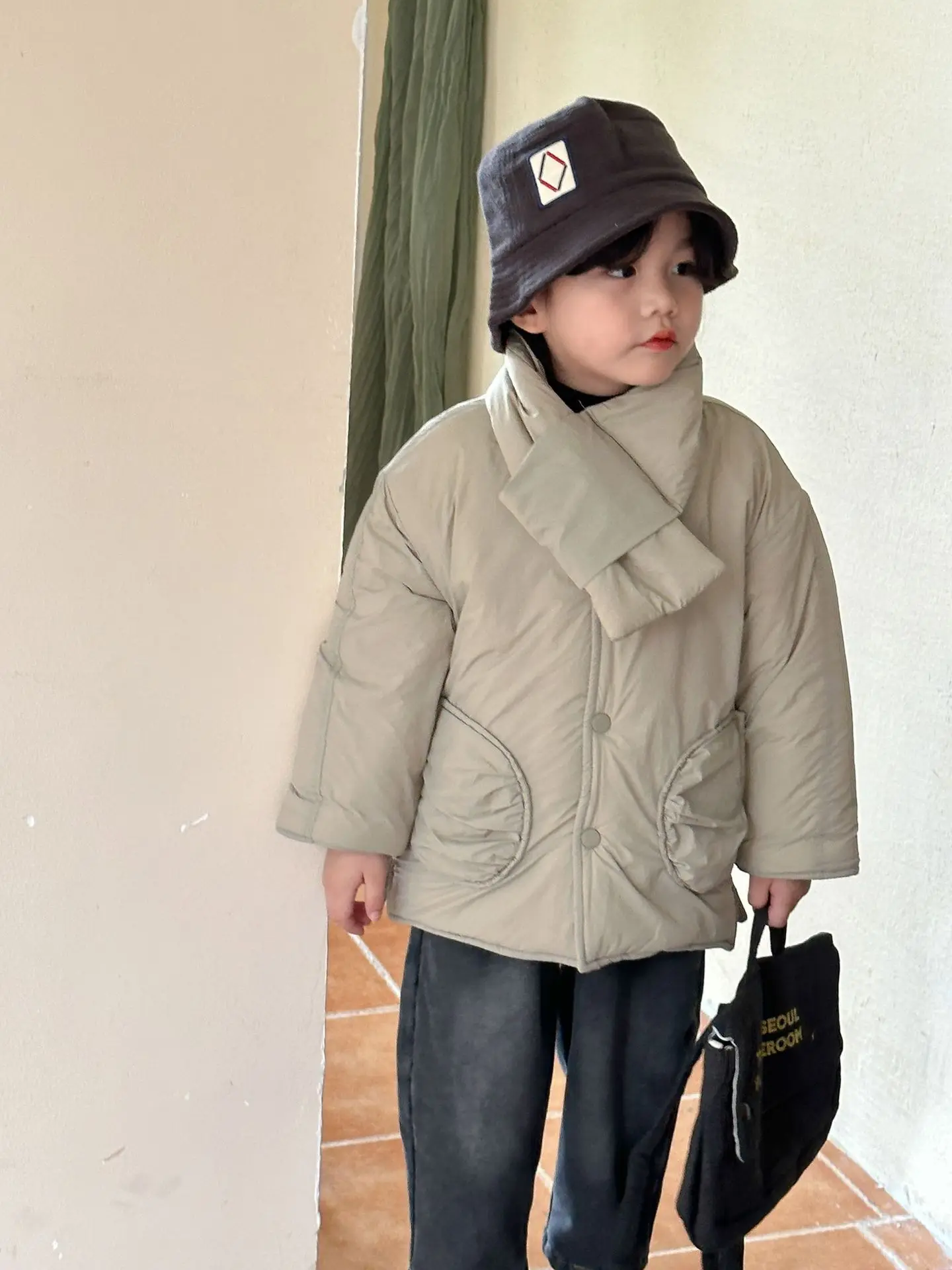マフラードッキングデザインの裏フリースパデッドジャケットコートは、暖かさと便利さを兼ね備えた冬用キッズアウターです。内側には柔らかなフリース素材を使用し、全身を暖かく保ちます。また、ドッキングされたマフラーが付属しているため、別途マフラーを用意する手間がなく、首元までしっかり防寒できます。シンプルなデザインで男女問わず似合い、普段使いからお出かけまでさまざまなシーンに対応する一着です。